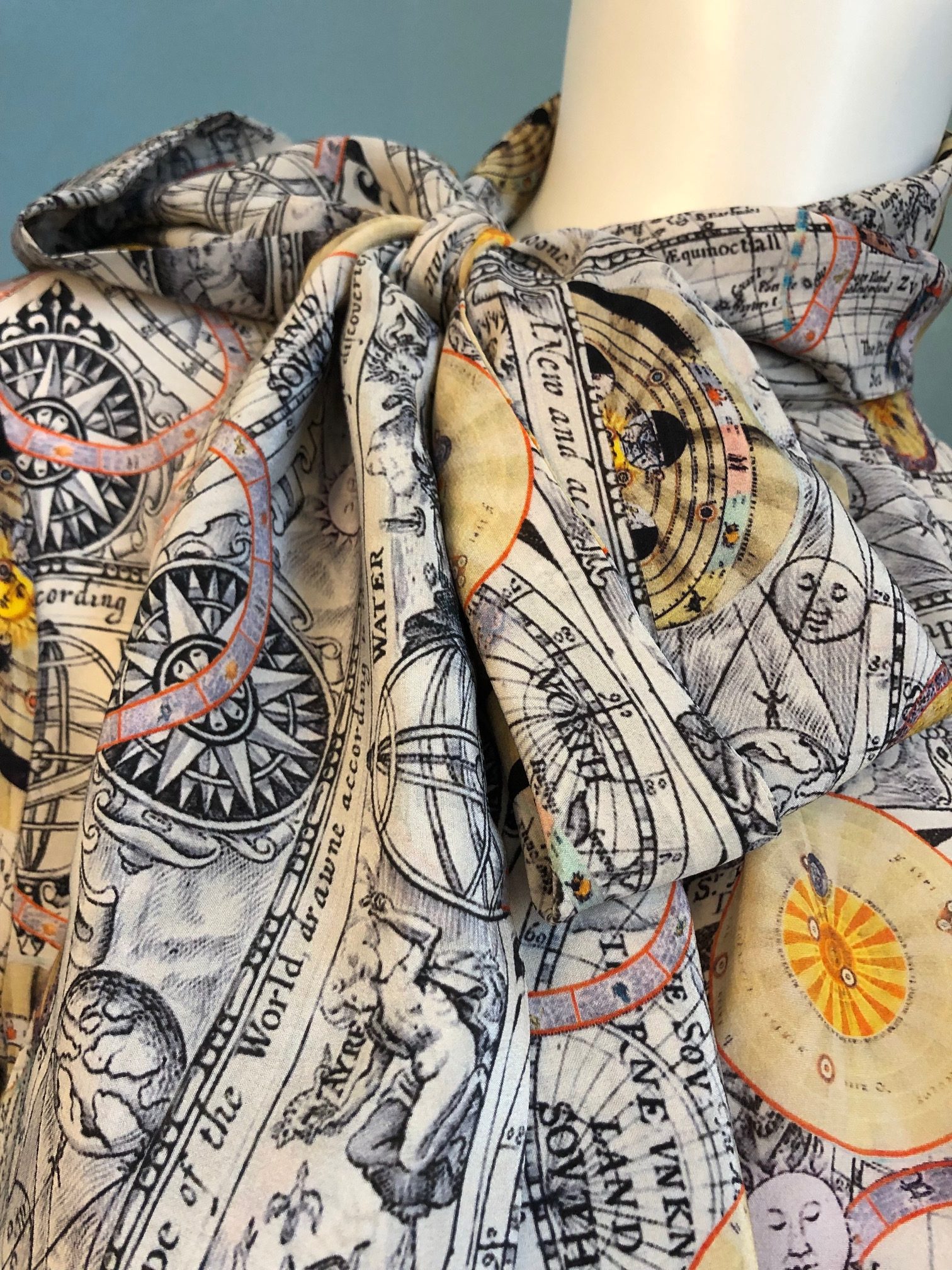 Und dann lege ich los mit einem Dies-und-Das, Hier-und-Jetzt, dass die Schneiderinnen gerade im Atelier hinter mir fleißig an der neuen Kopernikus Bluse arbeiten, die sehr kompliziert ist mit dem großen Schalkragen, der zur Schleife gebunden wird, den schönen Knöpfen, die wir gemeinsam im September ausgewählt haben.