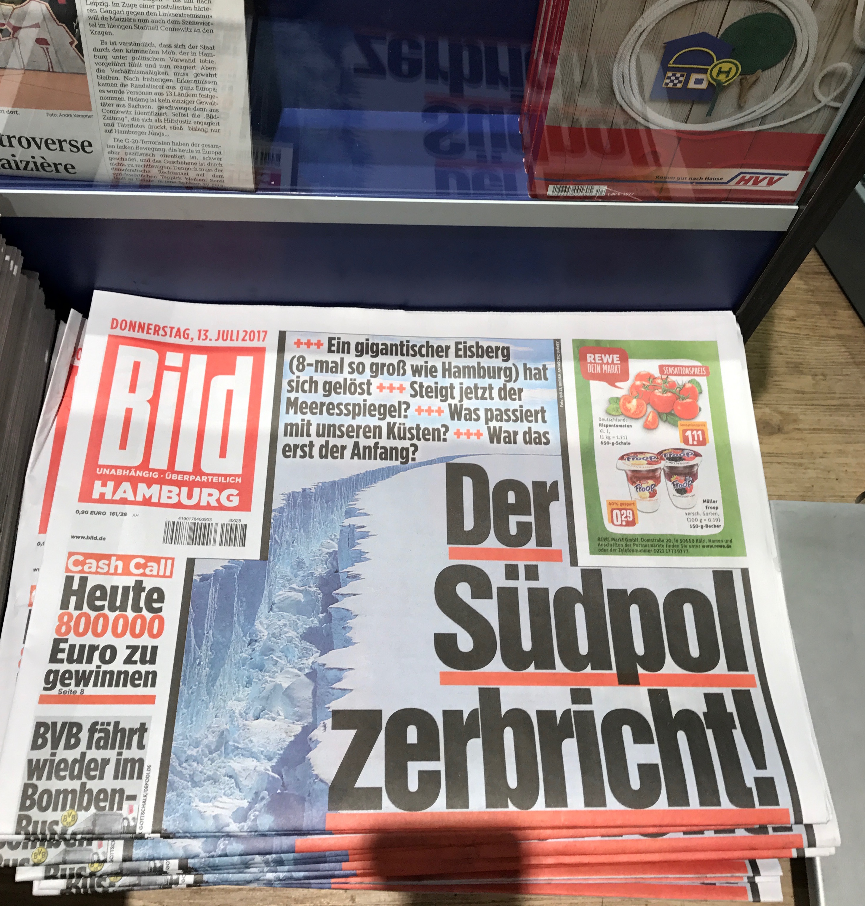 6.00 Uhr früh heute Morgen am Bahnhof Altona, ein wenig verschlafen schlendere ich durch den Zeitschriften Kiosk bis der Zug nach Sylt eintrifft. Ich trage die neue Eisbären Bluse mit dem symbolträchtigen weißen Giganten auf Eisscholle zwischen Blüten. Neben mir rollert der Koffer und die Eisbären-Roma-e-Toska Tüte oben drauf. Schnell noch eine Zeitung kaufen, den Coffee-to-go und dann in die NOB. Hört sich an, als wäre ich eine Urlauberin Richtung Sommerfrische. Als Erstes geht mein Blick auf die BILD Zeitung mit großen Lettern:”Der Südpol zerbricht”, dann greife ich mir die Süddeutsche mit dem bizarren Titelbild wie aus einer Sciencefiction Welt – “Rätsel im Eis”.
