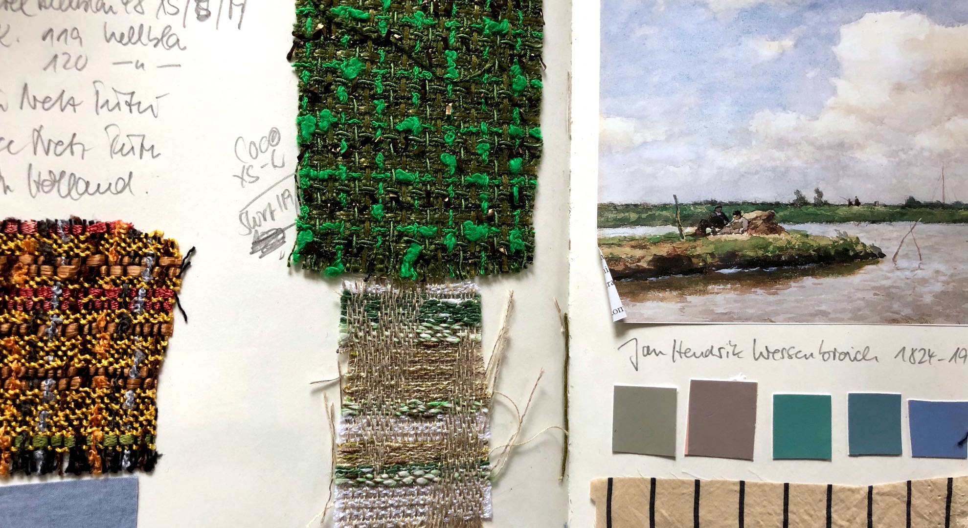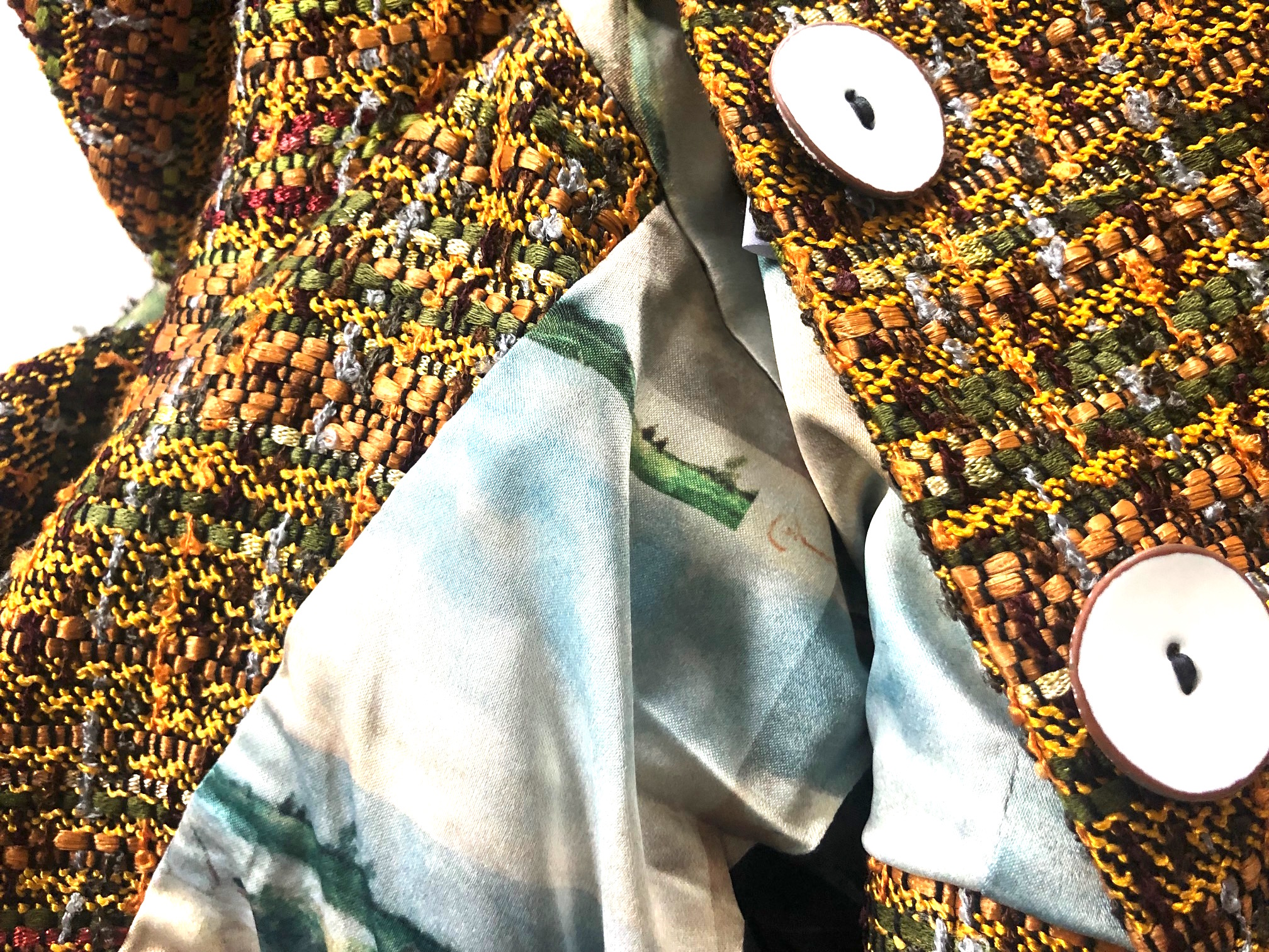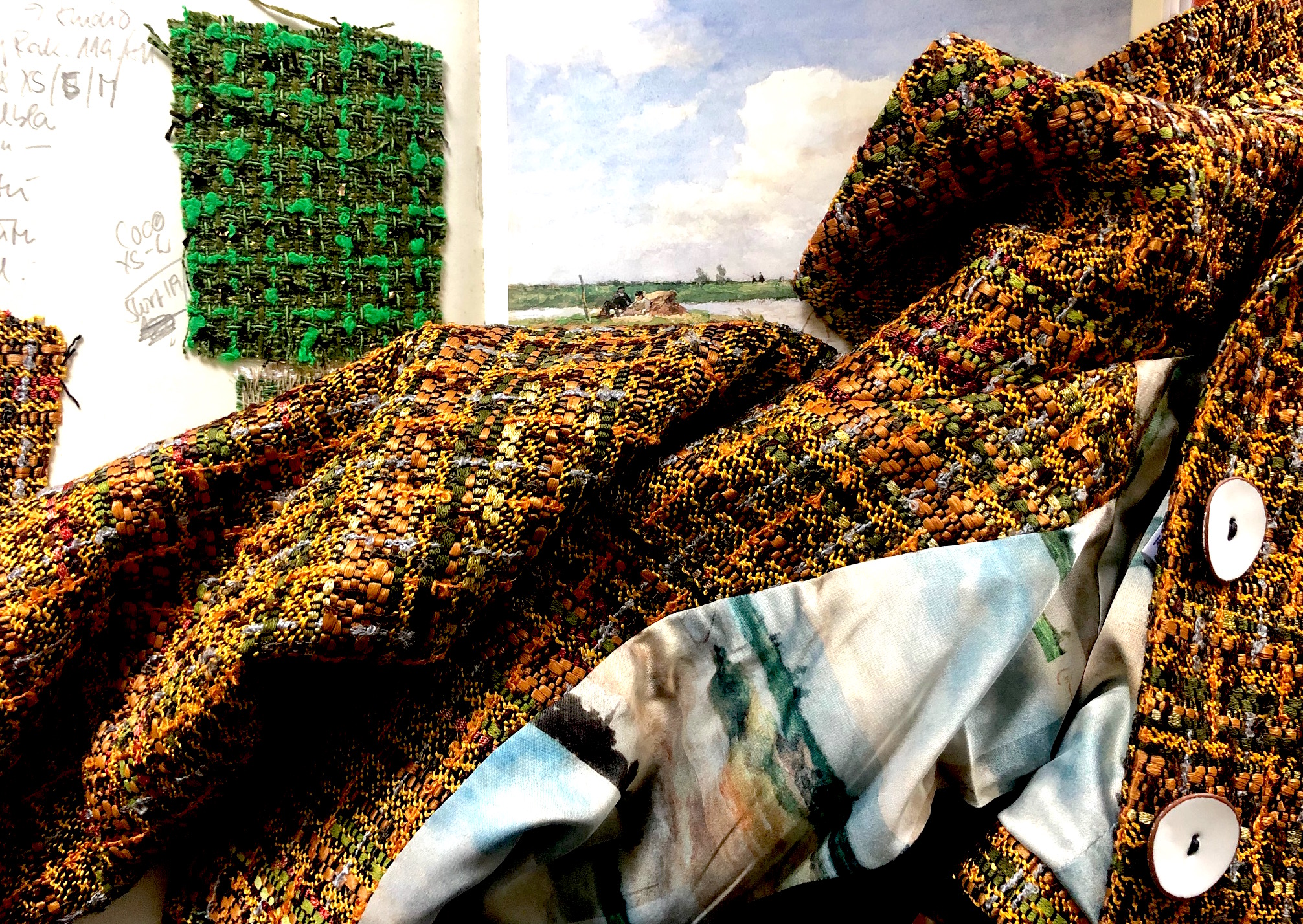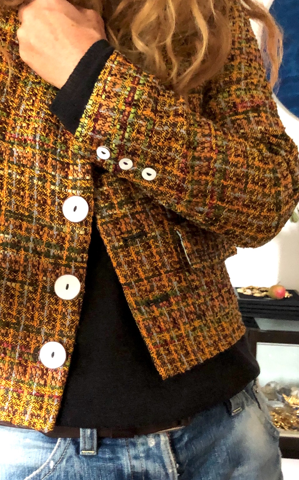 Der wunderschöne Bouclé aus der Manufaktur in Frankreich, die so berühmt für ihre Chanel Stoffe wurde, zeigt die Farben des Herbstes, das dunkle Gelb der Sonnenblumen, das braun der Felder und grün der Frühherbst-Wiesen. Dazwischen mischt sich das milchige Blau des Himmels und ganz fein windet sich der Faden in lilanem Rot der blühenden Heide.