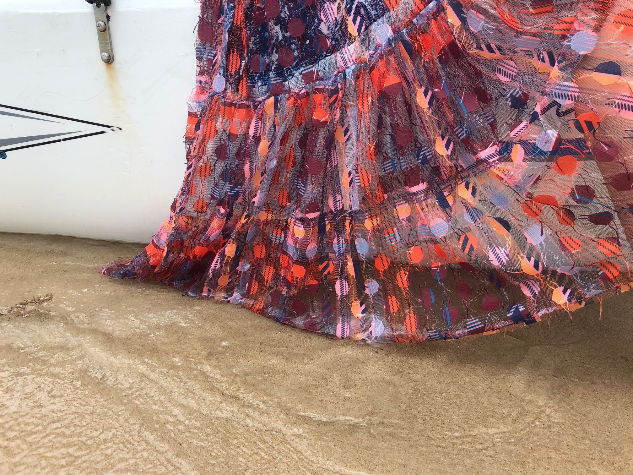 Kurzerhand wurde schon an Bord ein erstes Meeting organisiert. Top secret, natürlich. Gleich nach meiner Rückkehr letzte Woche ging es dann in Hamburg weiter. Glückliche Fügung, der Chef des Unternehmens, das den Anstrich realisieren wird, hatte zu Weihnachten bei Roma e Toska in Kampen eine YSL Kette für seine Freundin gekauft. Er war natürlich sofort begeistert von dem Dessin der orange-rot-blauen Kreisformationen.