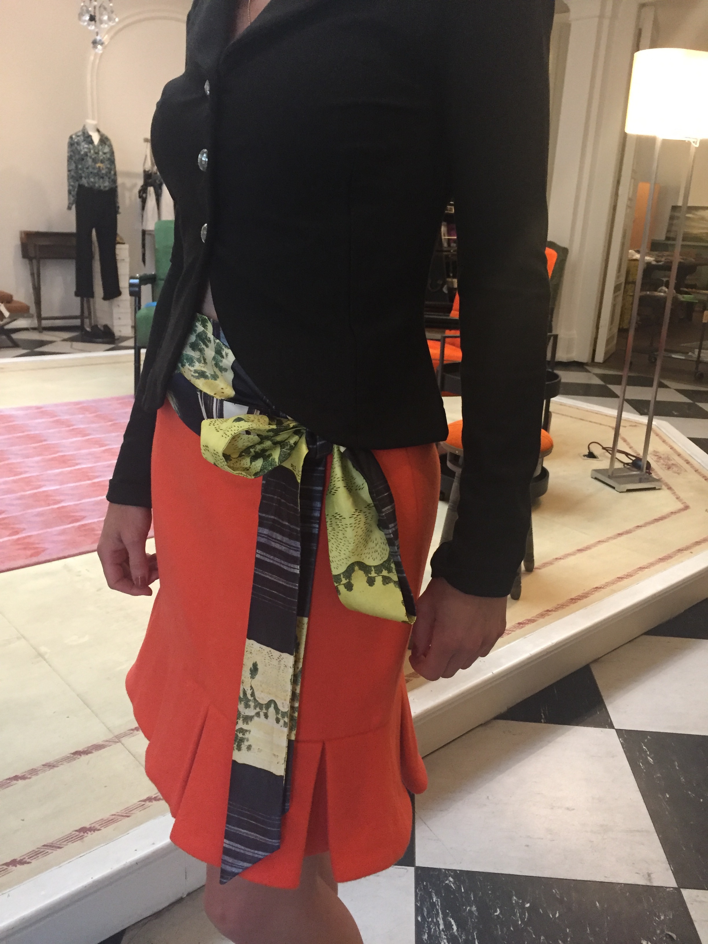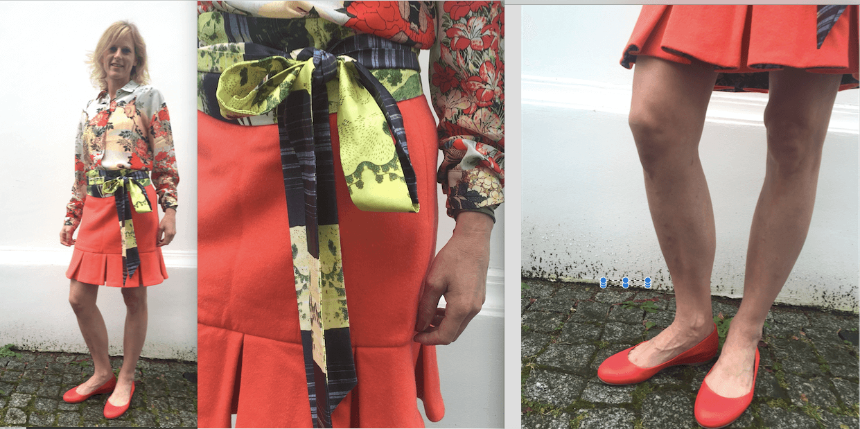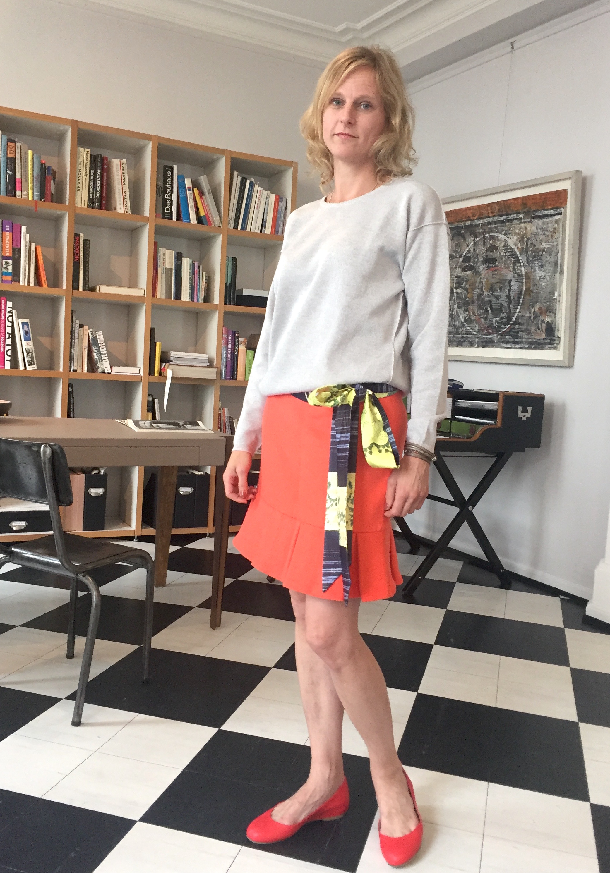 Pic.: Madder Etui Skirt with Waterfall belt, Bird blouse, Ballerina Taglia Scarpe (Milchstrasse 11) .