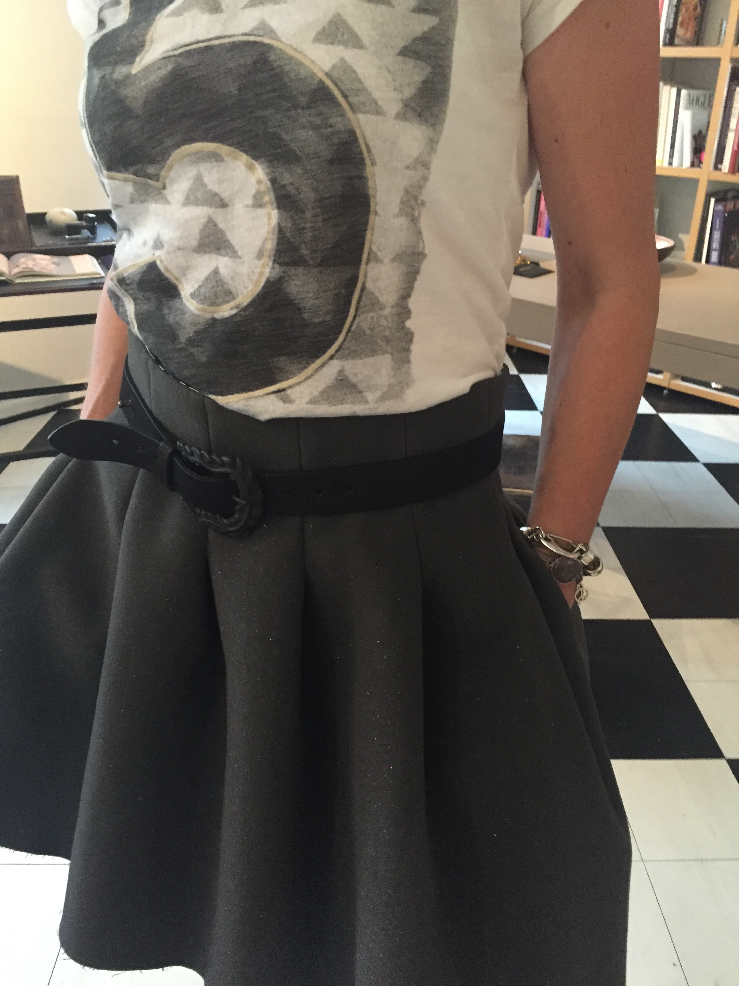 Madder Skirt mit BlazerWeiter geht’s. Safe, da kommt noch mehr. Von bunt auf schwarz-weiß oder besser auf abgemildertes schlämm-anthrazit mit dem Neopren-Skirt und dem No.5 T-Shirt von Simone, alternativ natürlich auch mit weißer Bluse. Auch hier wieder ganz wichtig, die flachen Schuhe. So mischt sich high-fashion mit high-street zum mit everyday outfit.