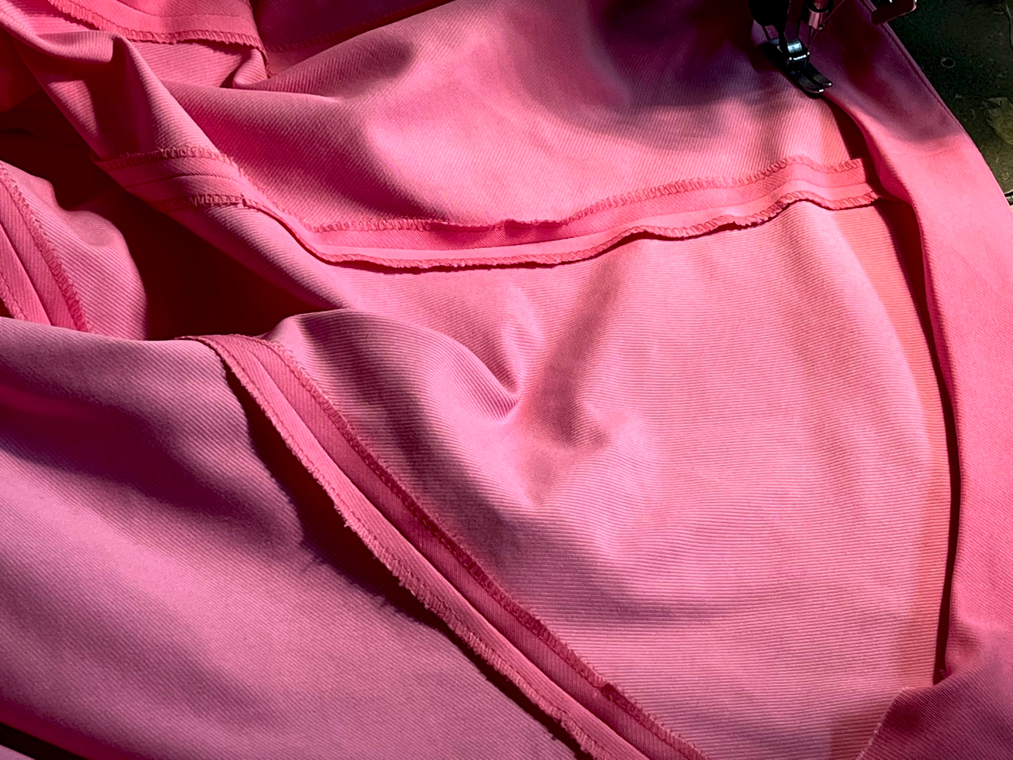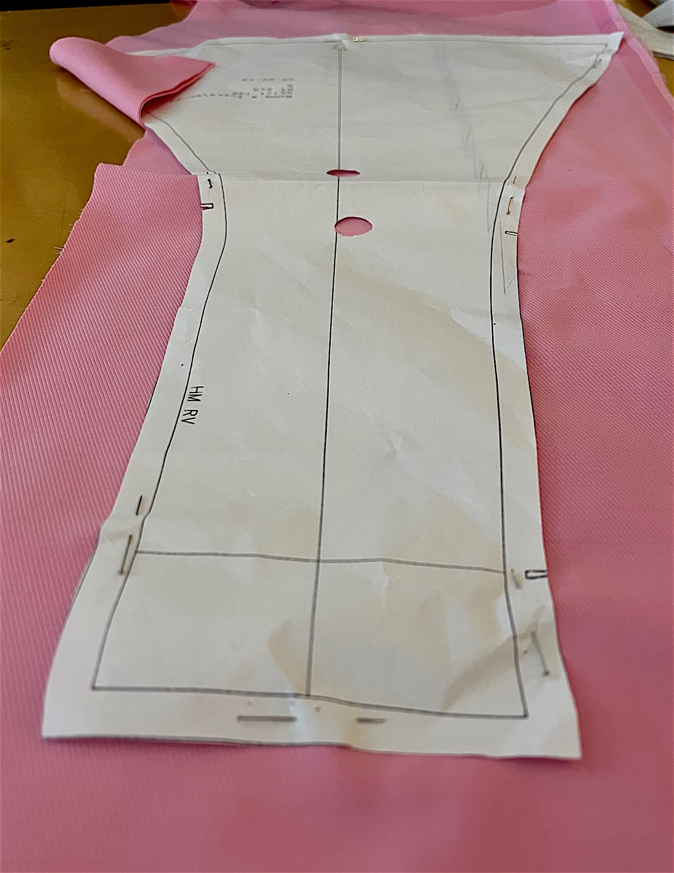 In unserem Fall haben wir es etwas anders gelöst und setzen keine Stücke dazwischen, sondern geben der gesamten Rockbahn nach unten hin einen extremen Schwung. Insgesamt sind es sechs Teile, die aneinandergenäht werden. Auf die Taschen haben wir diesmal verzichtet, sie passen nicht zu der ausgestellten Silhouette.
