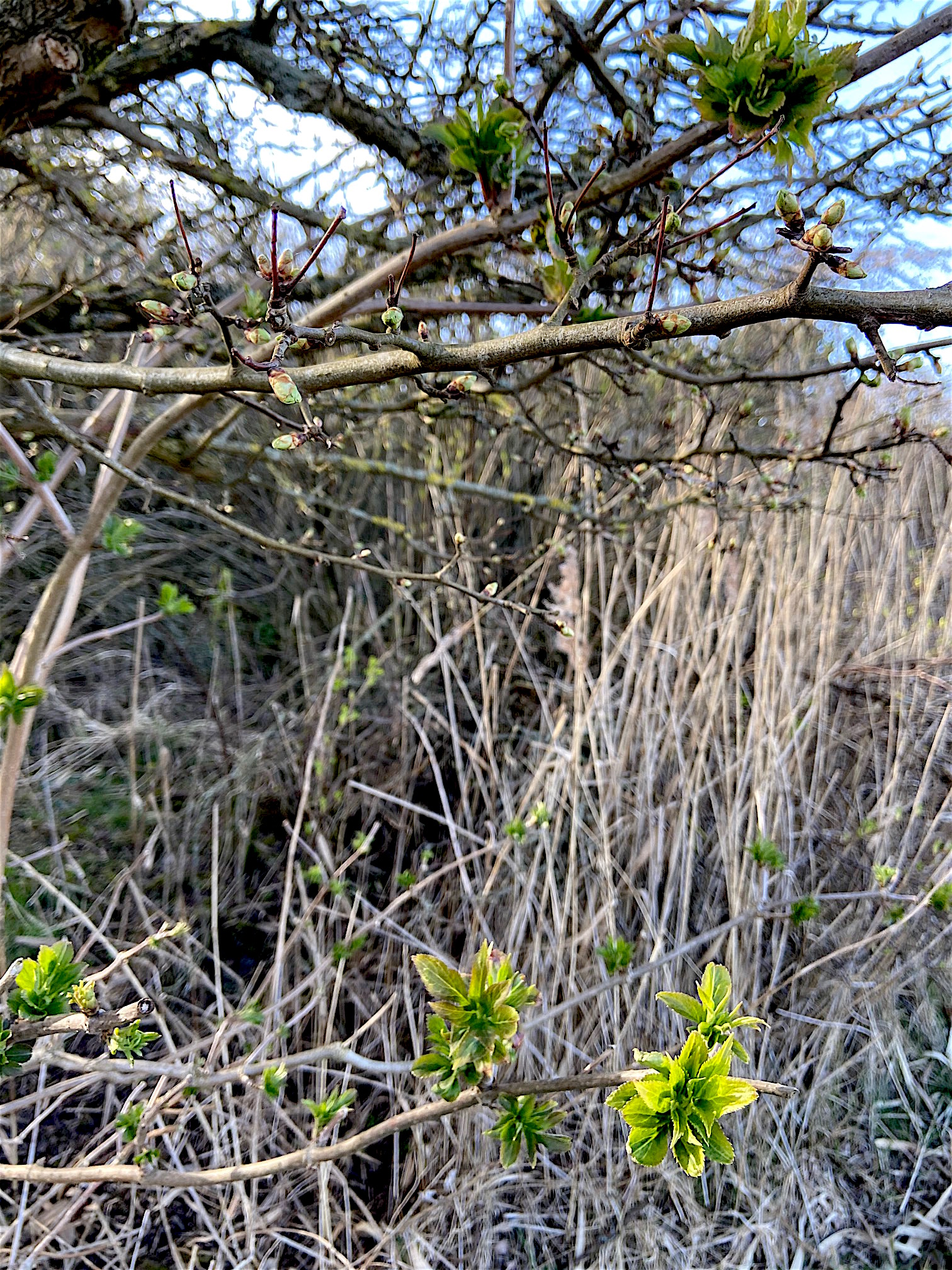 Gestern Abend lief ich mit meinem, der Nummer 1, entlang der Wattseite auf Sylt, dem Frühling auf der Spur. Und immer wieder nahm ich das Tuch von meinem Hals und wickelte es um einen Baum, ließ es im Wind flattern und wetteifern mit dem frisch aufgesprungenen Grün.