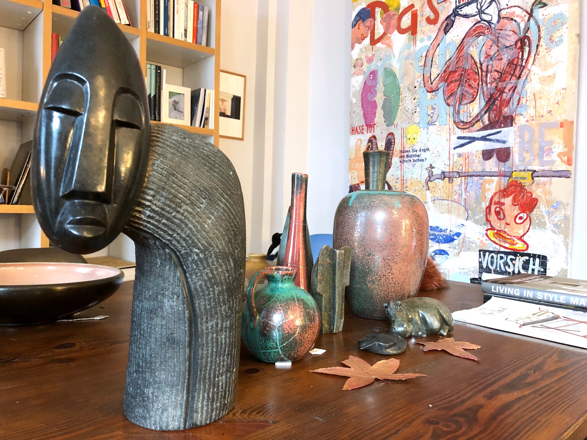 Puuh, das klingt nach Arbeit, nach schöner Arbeit, nach faszinierenden Aufgaben und einem intensiven Miteinander im Team nach innen und mit einem wachsenden Kreis von Begeisterten nach außen, so wie er sich gestern zusammenfand, am Kamin, im Gespräch, bei der Anprobe von Modellen und dem Ausprobieren von Kombination. Und ich wurde nicht müde, zu erzählen von den Editionen, den Wassermotiven, den Fabeln, der “Unmöglichen Reise zur Sonne” von Georges Méliès und natürlich dem Weltbild des Kopernikus. Um uns herum die Kunst, Beuys, die Shona Skulpturen, Thomas Herbst, Dieter Glasmacher