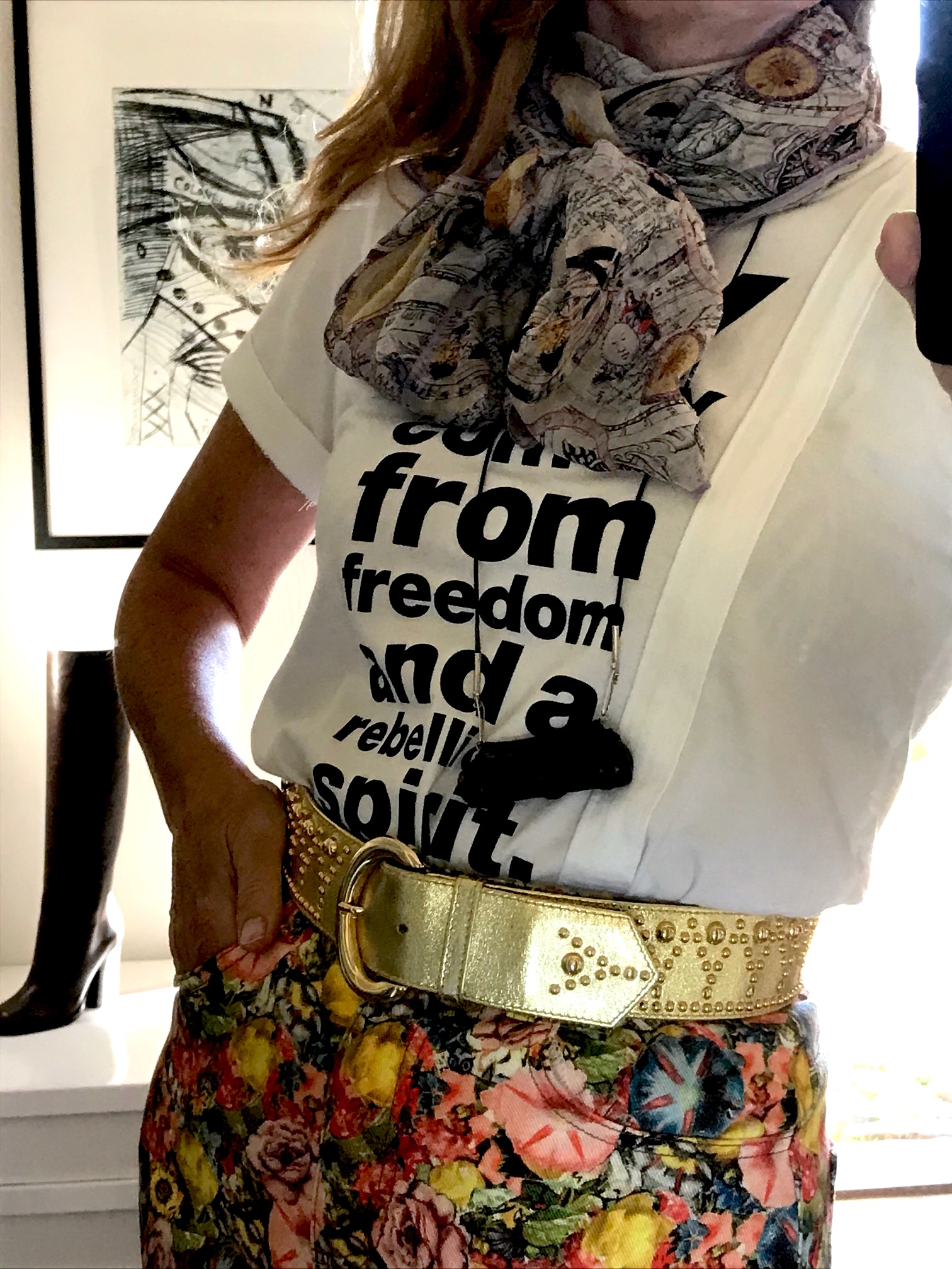 Die Rolle von Fashion wird uns noch lange beschäftigen. Sie besitzt die Kraft für ein politisches Statement mit der Energie für eine umwälzende Veränderung von innen nach außen und umgekehrt von außen nach innen. Schwer, sich das von dieser Insel in die Ferne vorzustellen, aber wir können und dürfen ein globales Denken mit der damit verbundenen Verantwortung nicht ausklammern. Ich trage die Jeans von Marni aus LA, das Shirt von Comme des Garçons aus Japan, die Schuhe von Taglia Scarpe aus Italien, den Gürtel von Yves Saint Laurent aus Frankreich und das Seidenchiffon Tuch von Roma e Toska aus Deutschland. One World. “Life matters!”