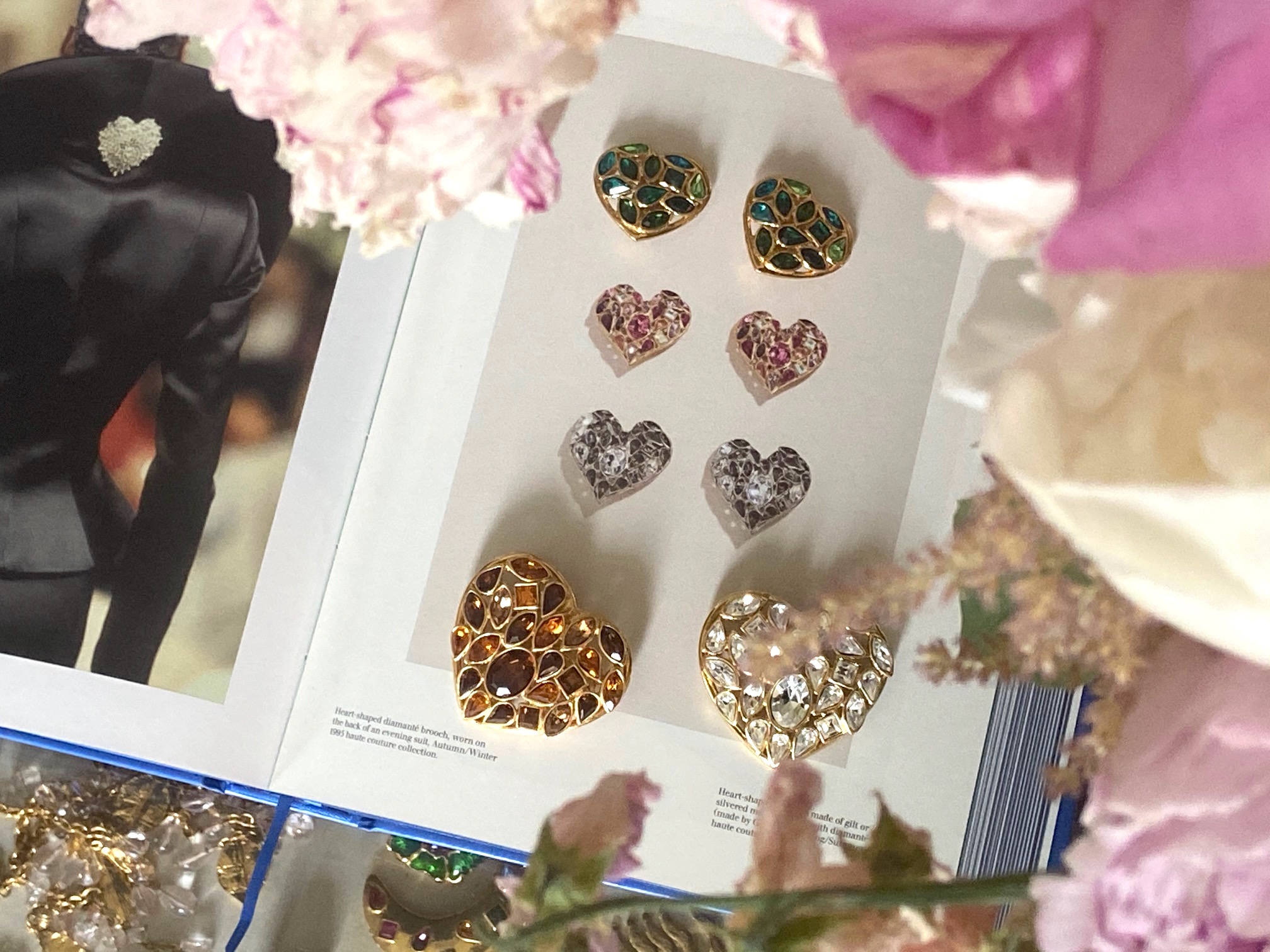Schon entsteht aus dem beliebigen Arrangement ein Spiel. Ich blättere vor und zurück in dem Buch. Auch für die nächste Seite gibt es Beispiele aus meiner Schublade: Die Herzen mit Kristallen von Goossens für Yves Saint Laurent, Sommer 1983, Haute Couture Collection.