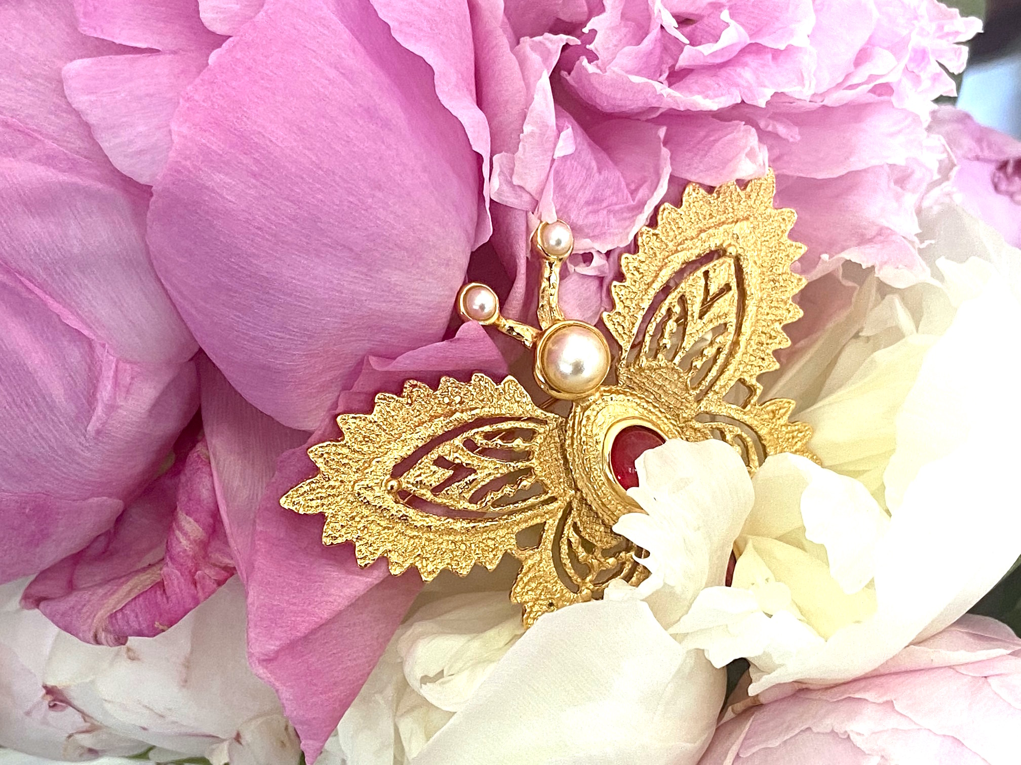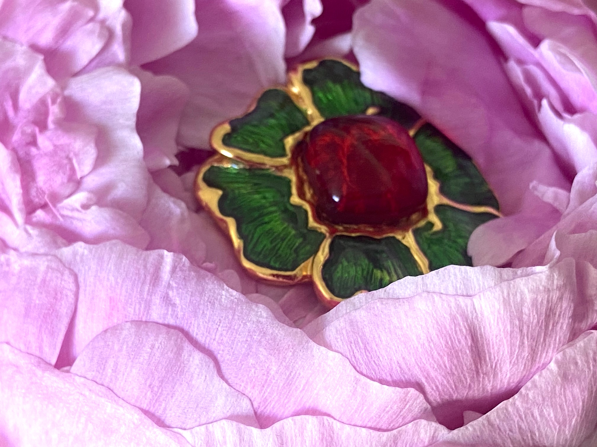 Vorsichtig drapiere ich die Pretiosen in den Blüten-“Nestern” der Pfingstrosen, die Broschen aus den späten siebziger Jahren mit dem emaillierten Büten … Natürlich darf der Schmetterling ebenfalls nicht fehlen.