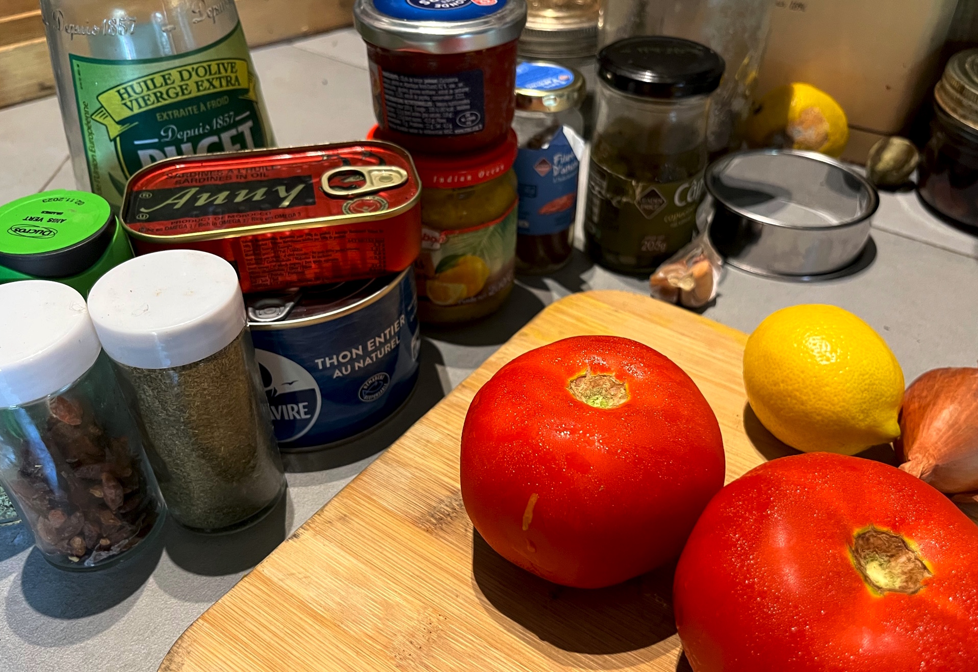 Zutaten: 1 Dose Ölsardinen, 6 Anchovis, 1 große Dose Thunfisch in Öl (immer auf Bio- und Angelfisch Siegel achten), 2 Schalotten, Knoblauch, 2 Tomaten, 1 frische unbehandelte Zitrone, eingemachte Zitronen, Kapern, 1 Chilischote, Dill, Petersilie, Origano, Nudeln, in diesem Fall Penne.