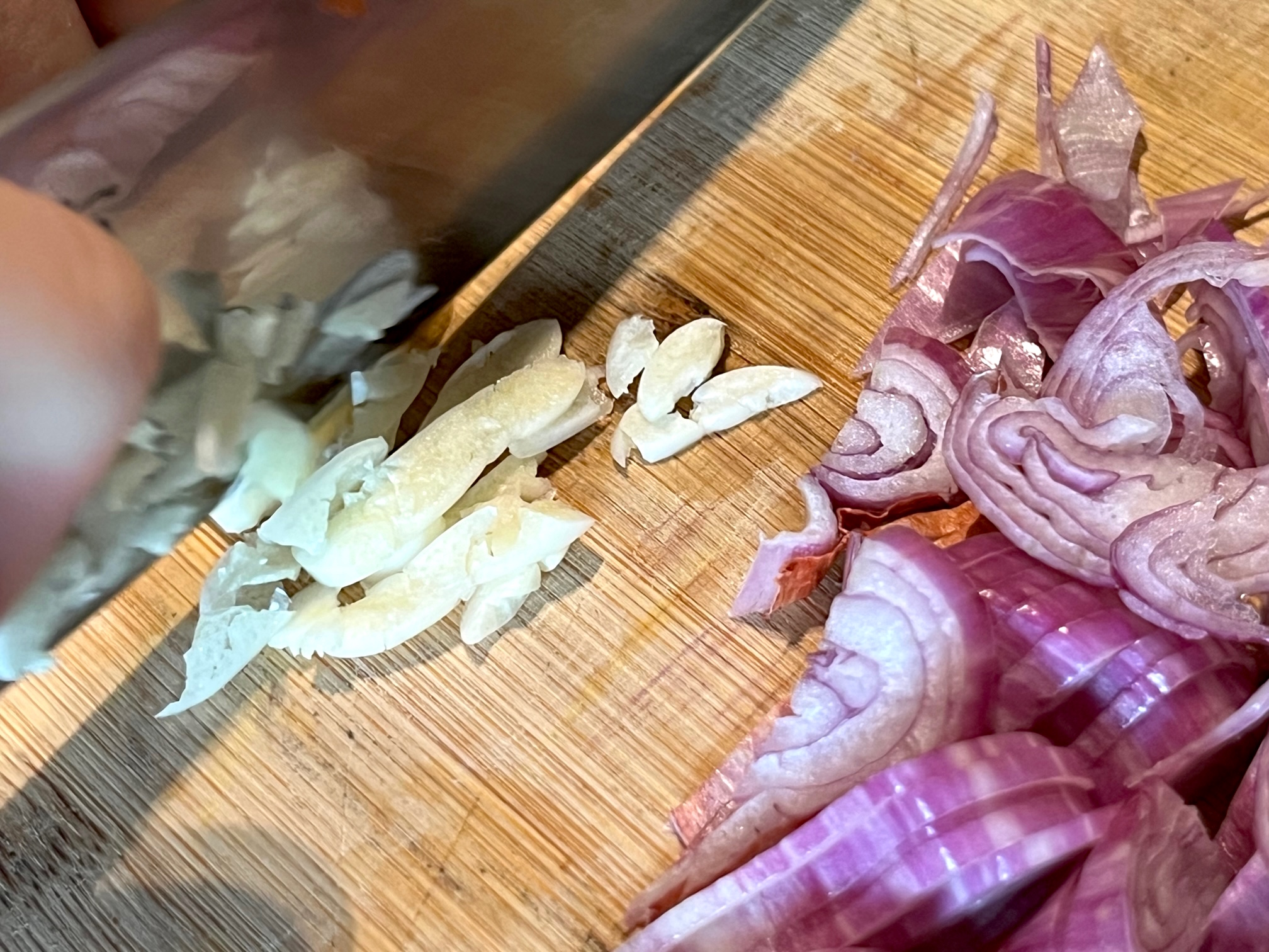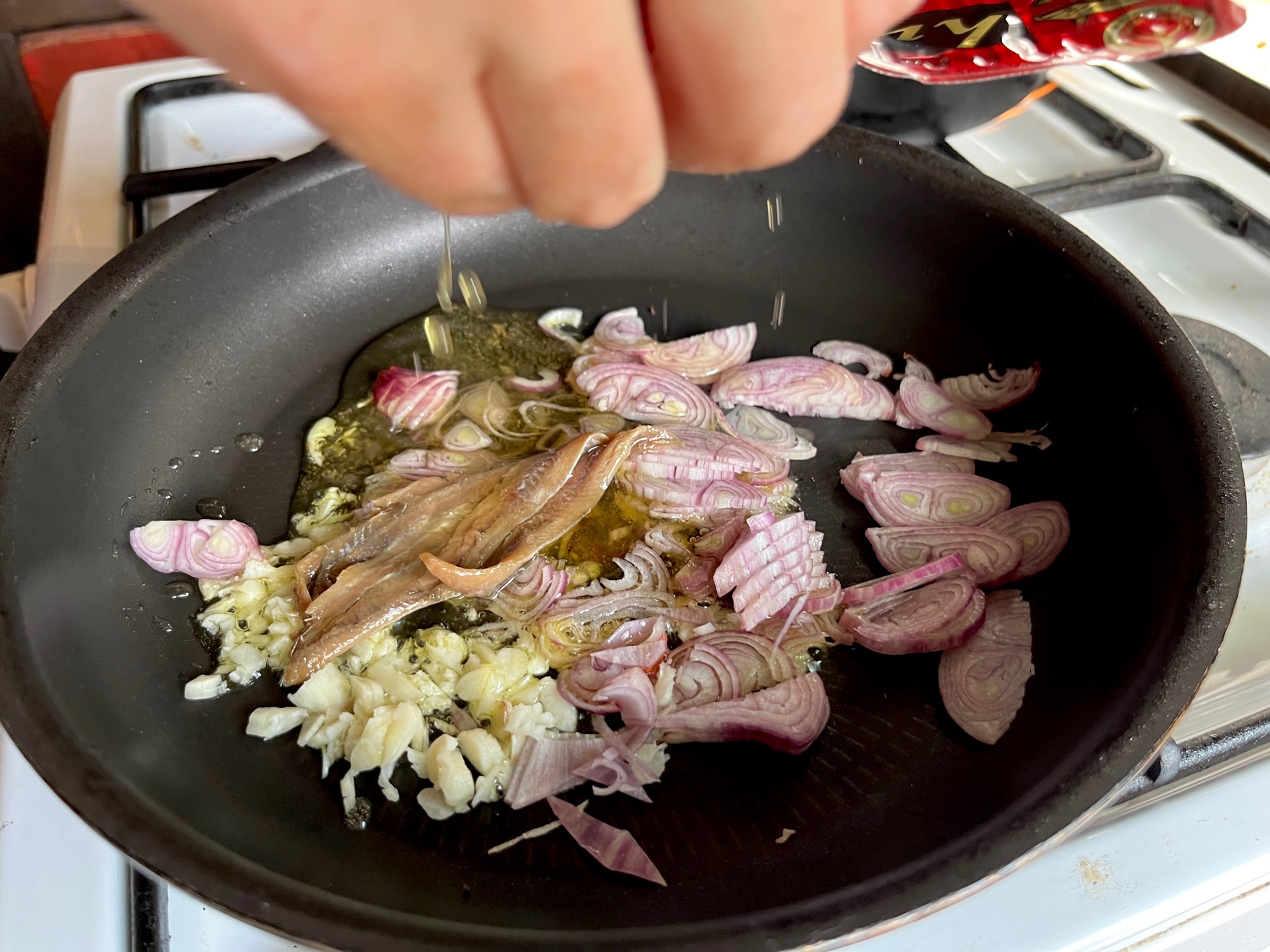 Los geht’s! Als erstes das Wasser für die Nudeln aufsetzen. Kochen ist Logistik und die richtige Abfolge von Arbeitsgängen. Die nun folgende Sauce geht schnell: Eine Schalotte in dünne Streifen schneiden, eine Knoblauchzehe in kleine Stückchen hacken. Etwas Öl in den Topf, beides hineinkippen, eine Chilischote dazu und kurz anbraten. Easy, tränenlos, überschaubar, genauso wie der Rest, der folgt.