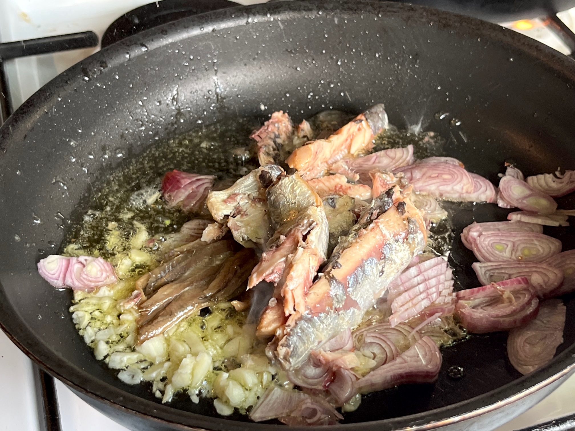 Die Anchovis mit ein wenig Anchovis-Flüssigkeit dazugeben. Anschließend die Dose mit Ölsardinen öffnen. Unbedingt auf die Qualität achten, dann kann man das Öl als Aromaverstärker mit verwenden. Alles zu einer Paste einkochen, dass ist das Geheimnis dieses Gerichtes.