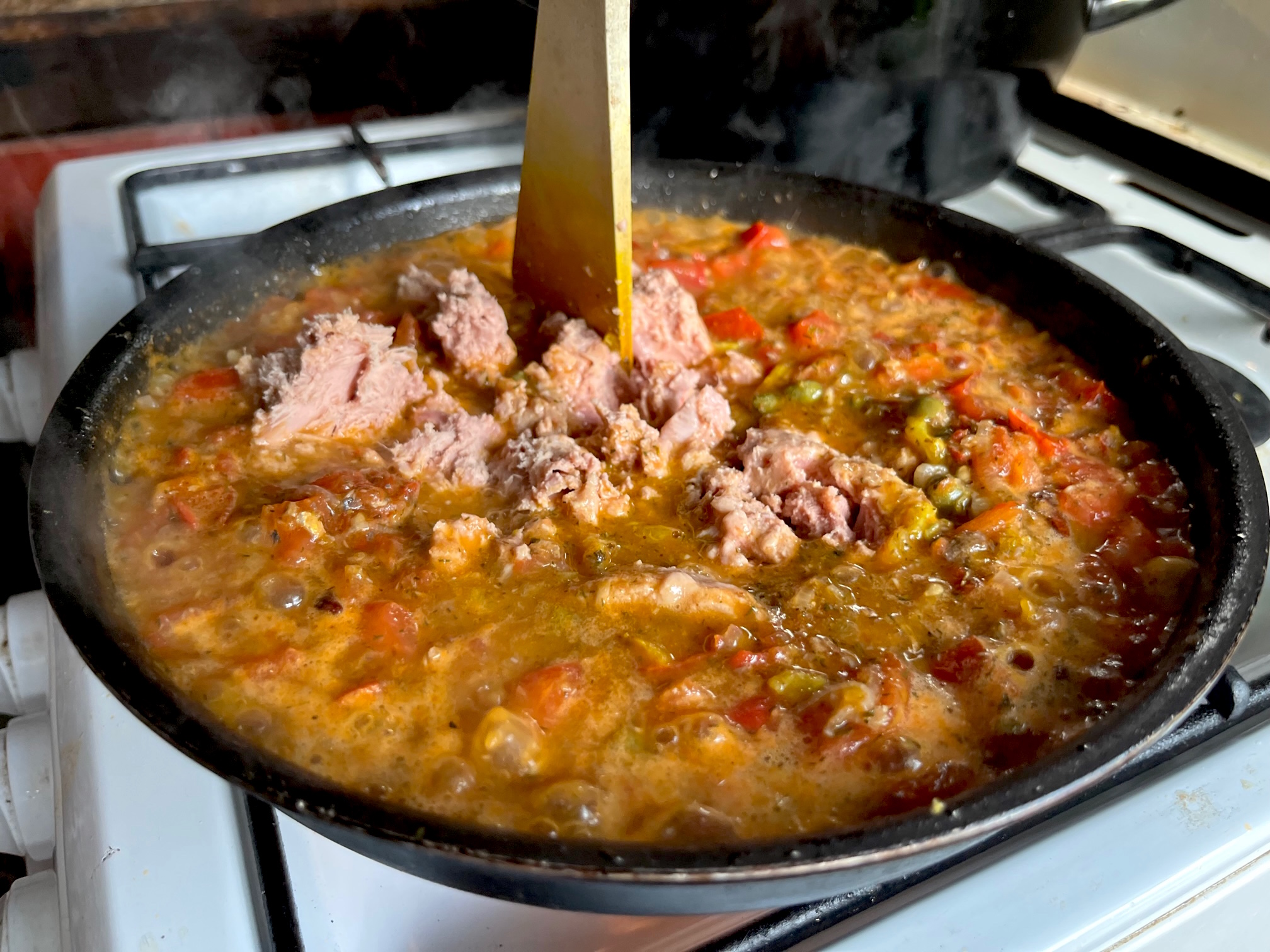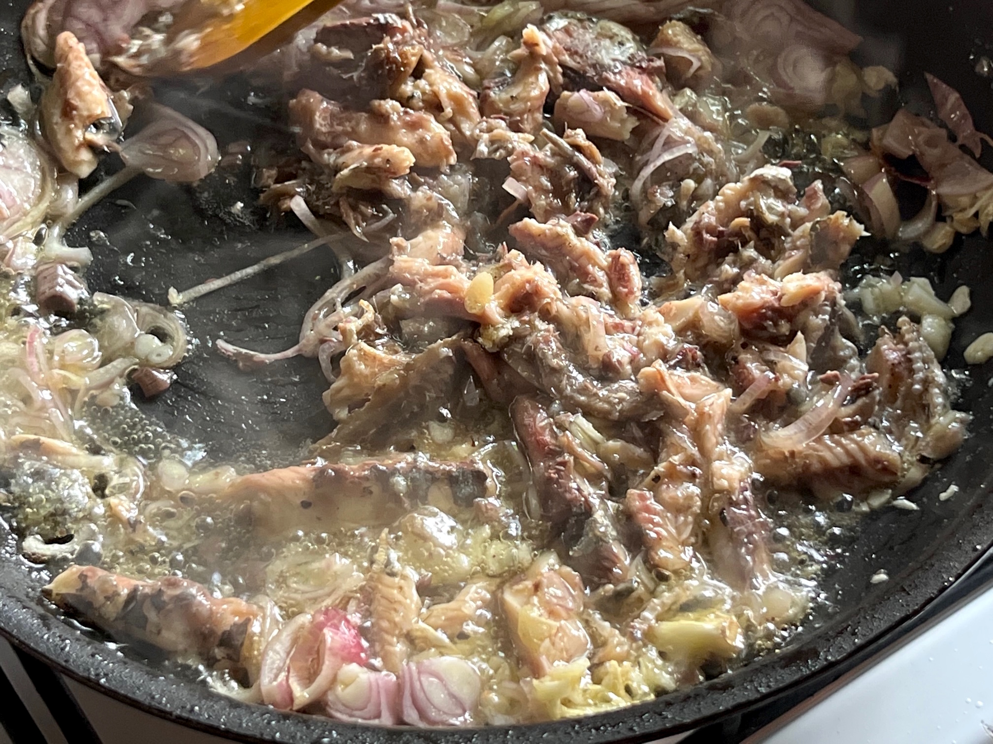 Vorsichtig das Fleisch zerteilen, ein wenig mit dem Becher Nudelwasser einkochen lassen, und dann die wunderbare “Sauce”, oder wie auch immer wir es nennen, zu den Nudeln kippen und alles wieder gut miteinander vermengen.