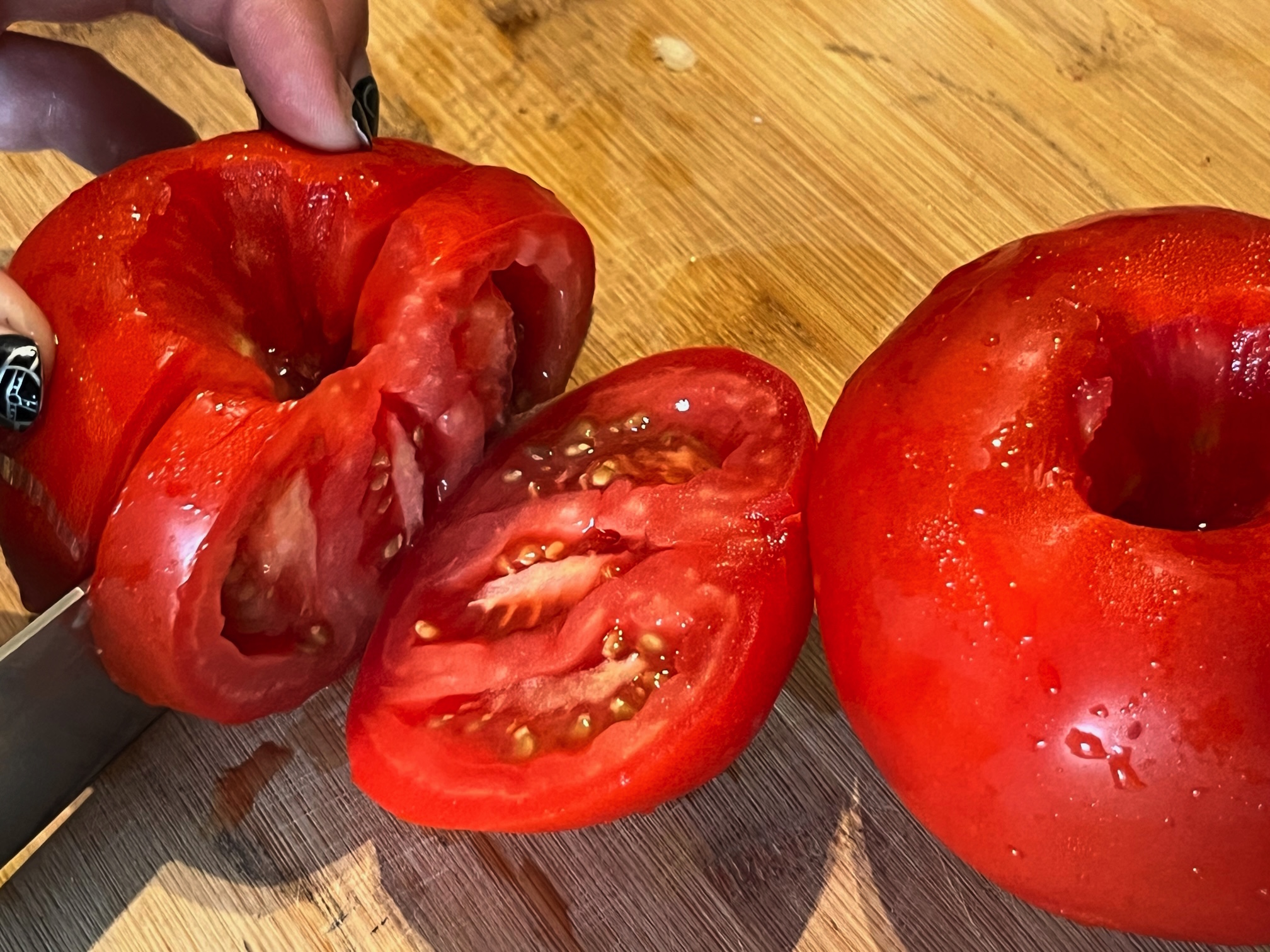 Zwei große Tomaten in kleine Würfel schneiden. Und wenn wir schon mal dabei sind, bewusst zu kochen (unerlässlich), dann gilt auch hier zu prüfen, wo etwas herkommt, saisonal und lokal wählen… Manchmal ist es nachhaltiger, die Tomaten aus der Dose zu verwenden, als lange Importwege zu akzeptieren.