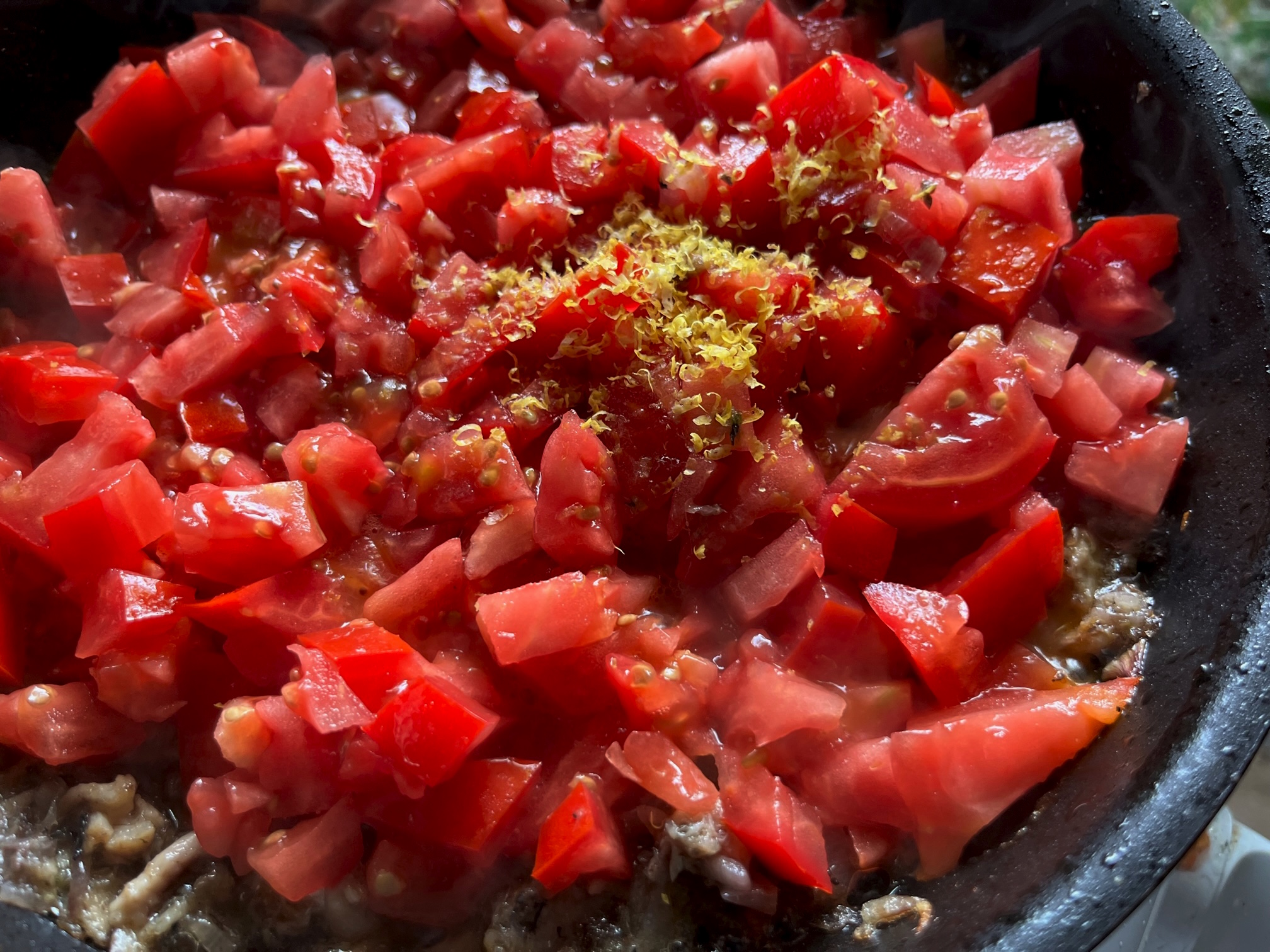 Die Schale einer unbehandelten Zitrone über den Tomaten-Sardinen-Mix reiben, und den Saft der Zitrone darüber auspressen, abschmecken. Es duftet herrlich, und ich sehe uns schon gleich am Strand bei untergehender Sonne dinieren.