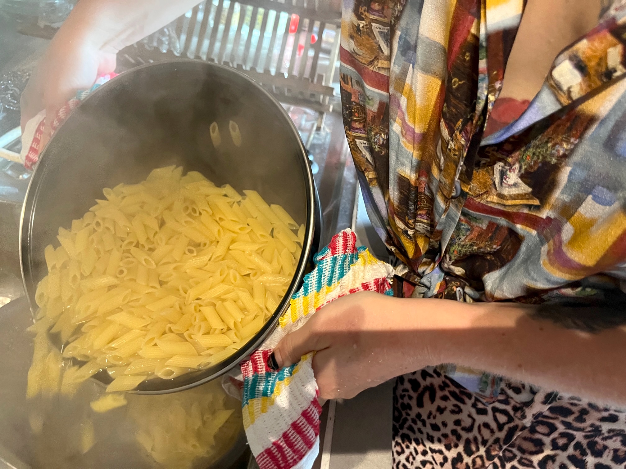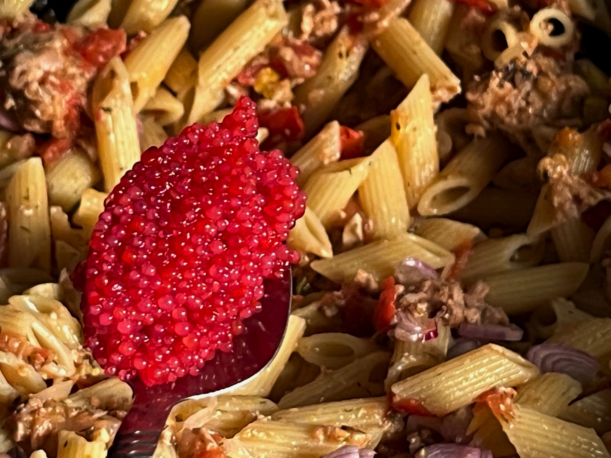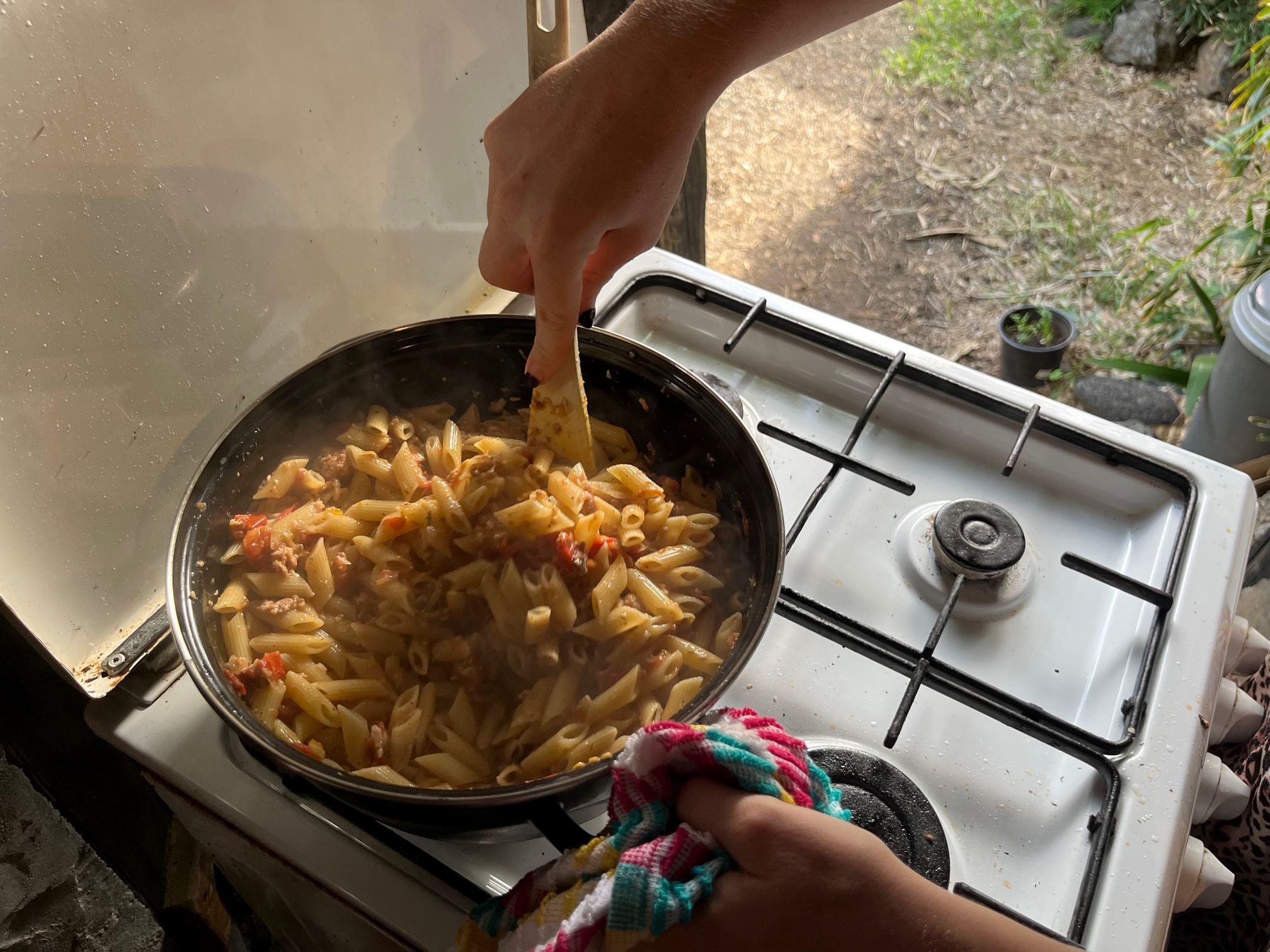 Wir essen die Thunfisch-Nudeln gleich lauwarm am Strand. Ihr anderen könnt bei Euch die Kerzen anzünden, den Tisch decken und die Pasta heiß servieren.