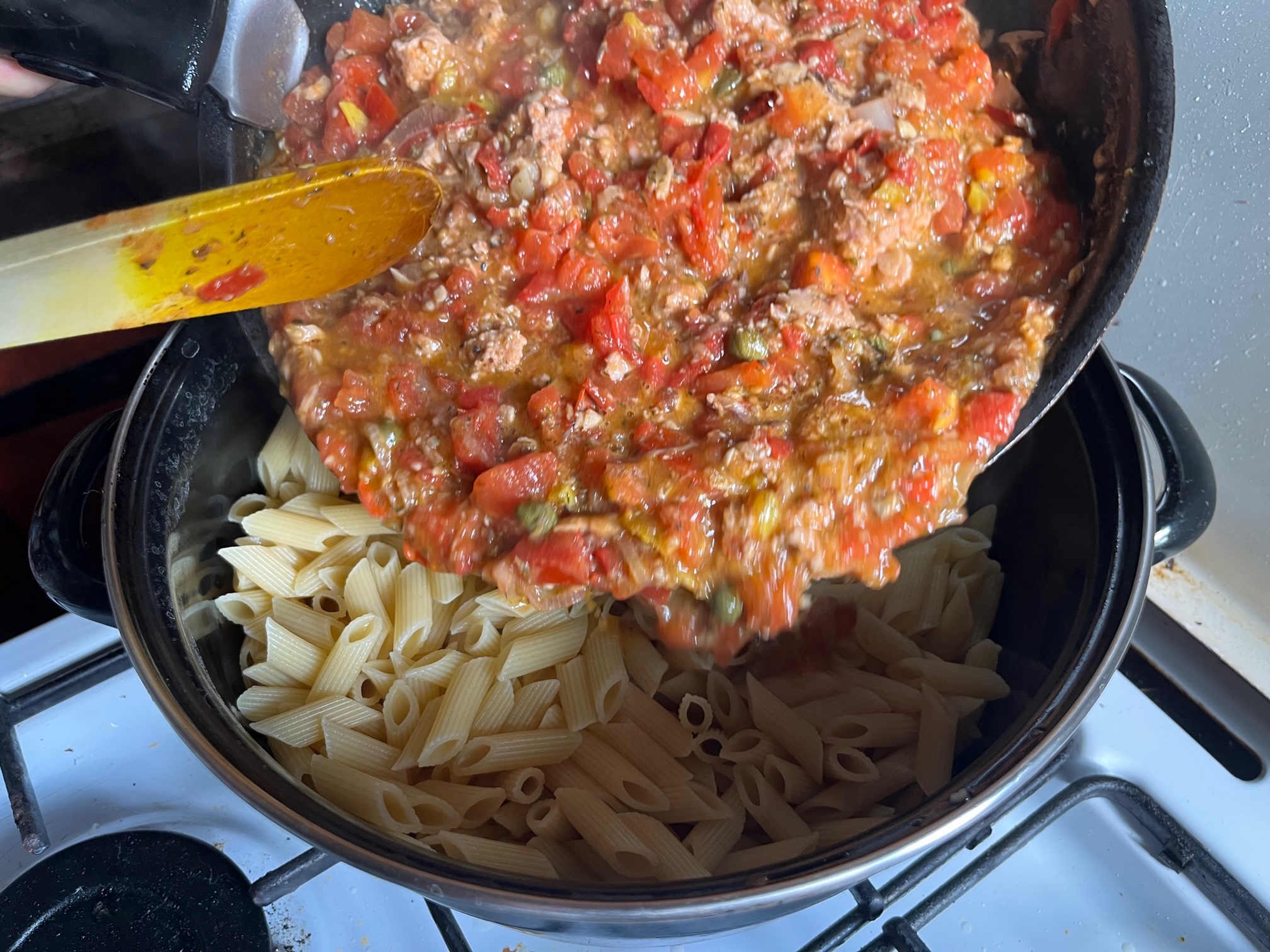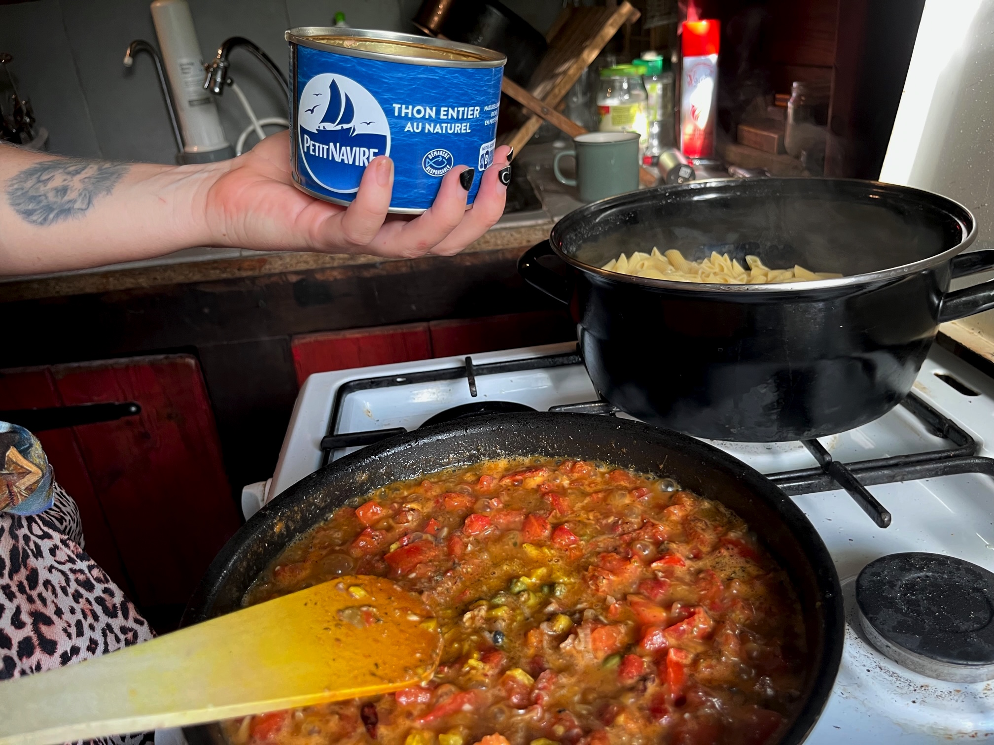 Einen Becher Nudelwasser abfüllen und reservieren (machen alle großen Köche!), dann die Pasta in ein Sieb gießen und zurück in den Topf. Als letztes kommt der Thunfisch zur Sauce. Auch hier muss das Produkt beim Einkauf kritisch geprüft werden.