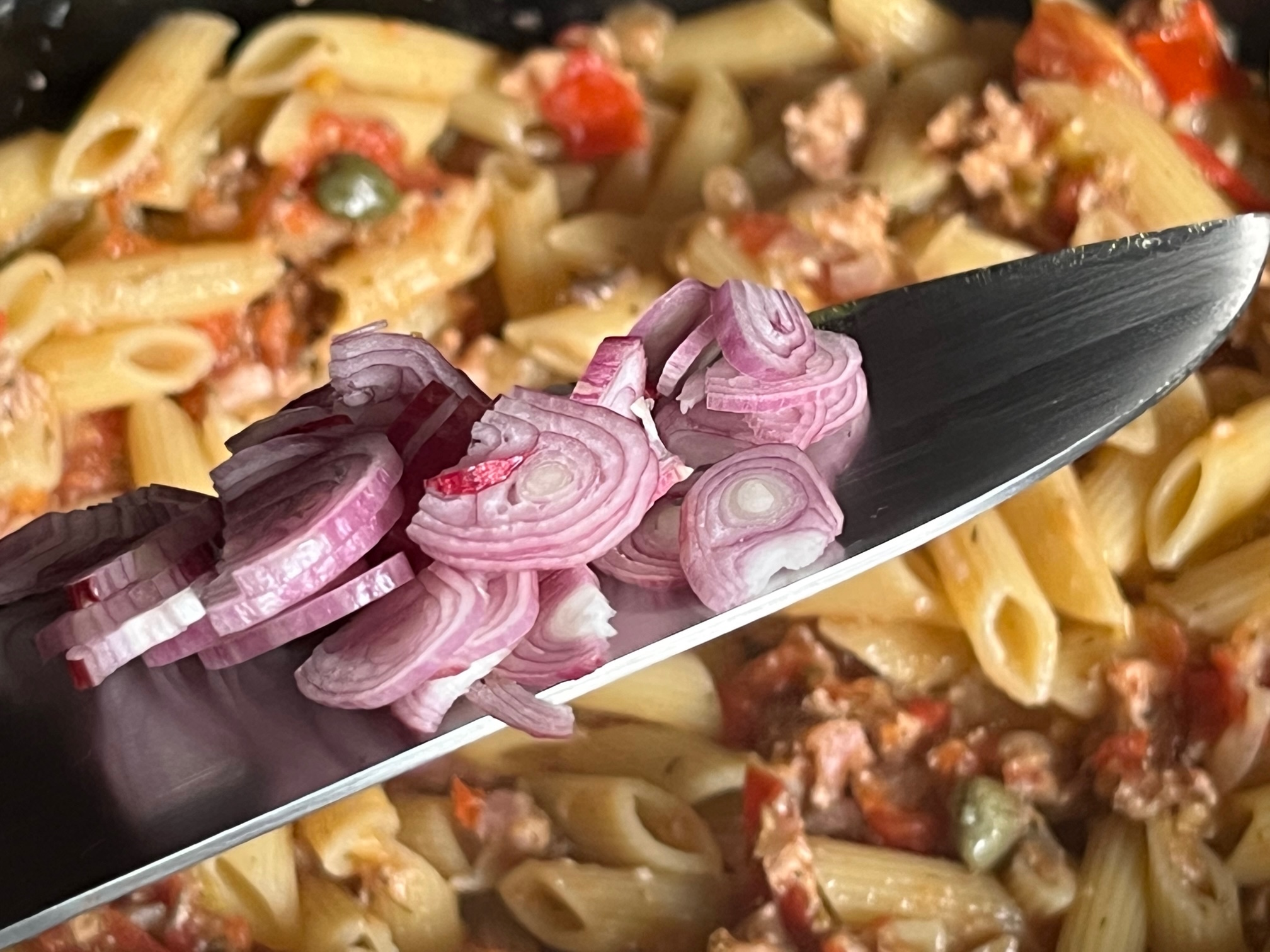 Es geht Schlag auf Schlag, wenige Minuten sind erst vergangen und das Gericht fast fertig. Die Sauce dauert genauso lange, wie die Nudeln im heißen Wasser brauchen, heißt ca. 8 Minuten oder so, hab nicht auf die Uhr geschaut.
