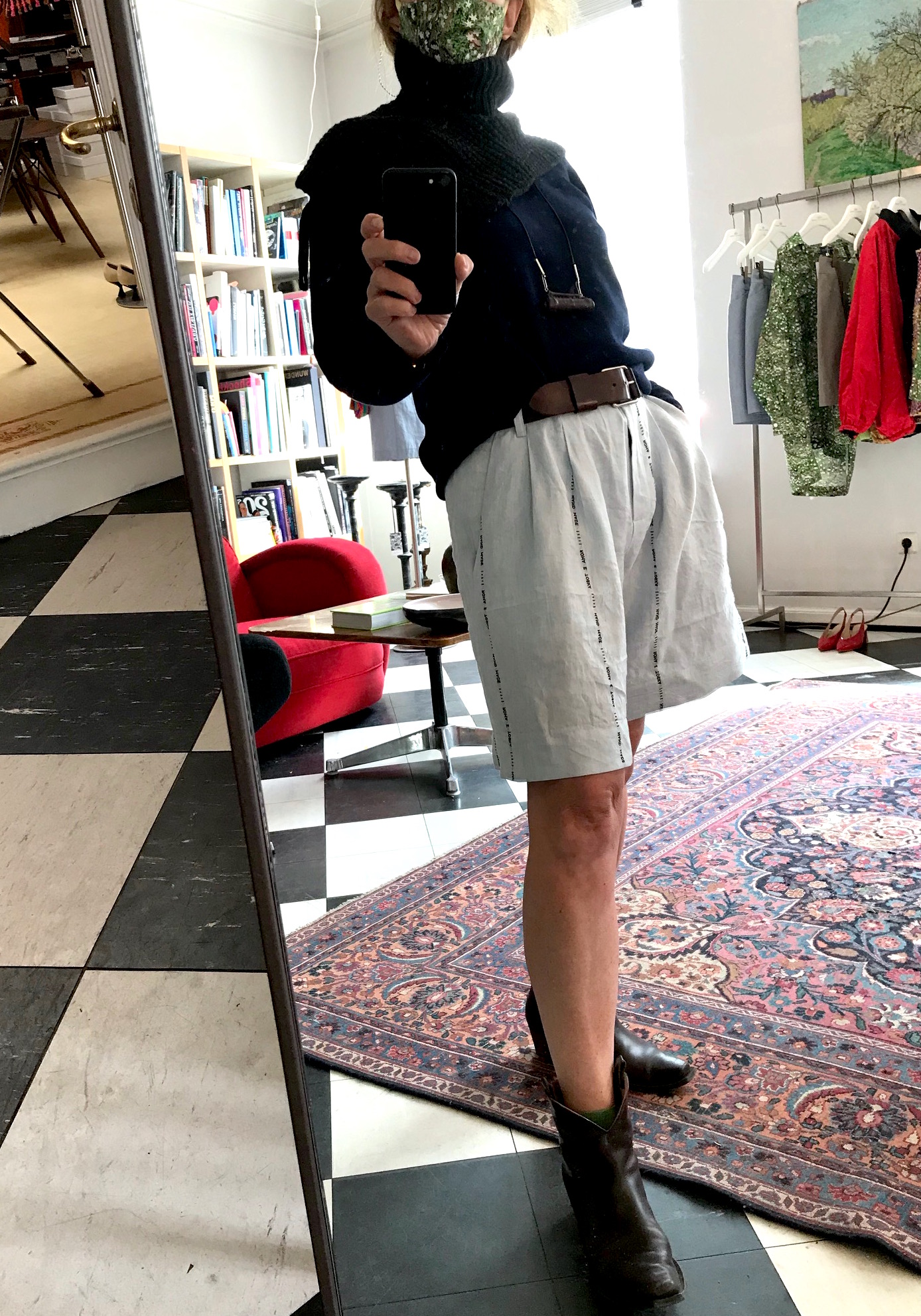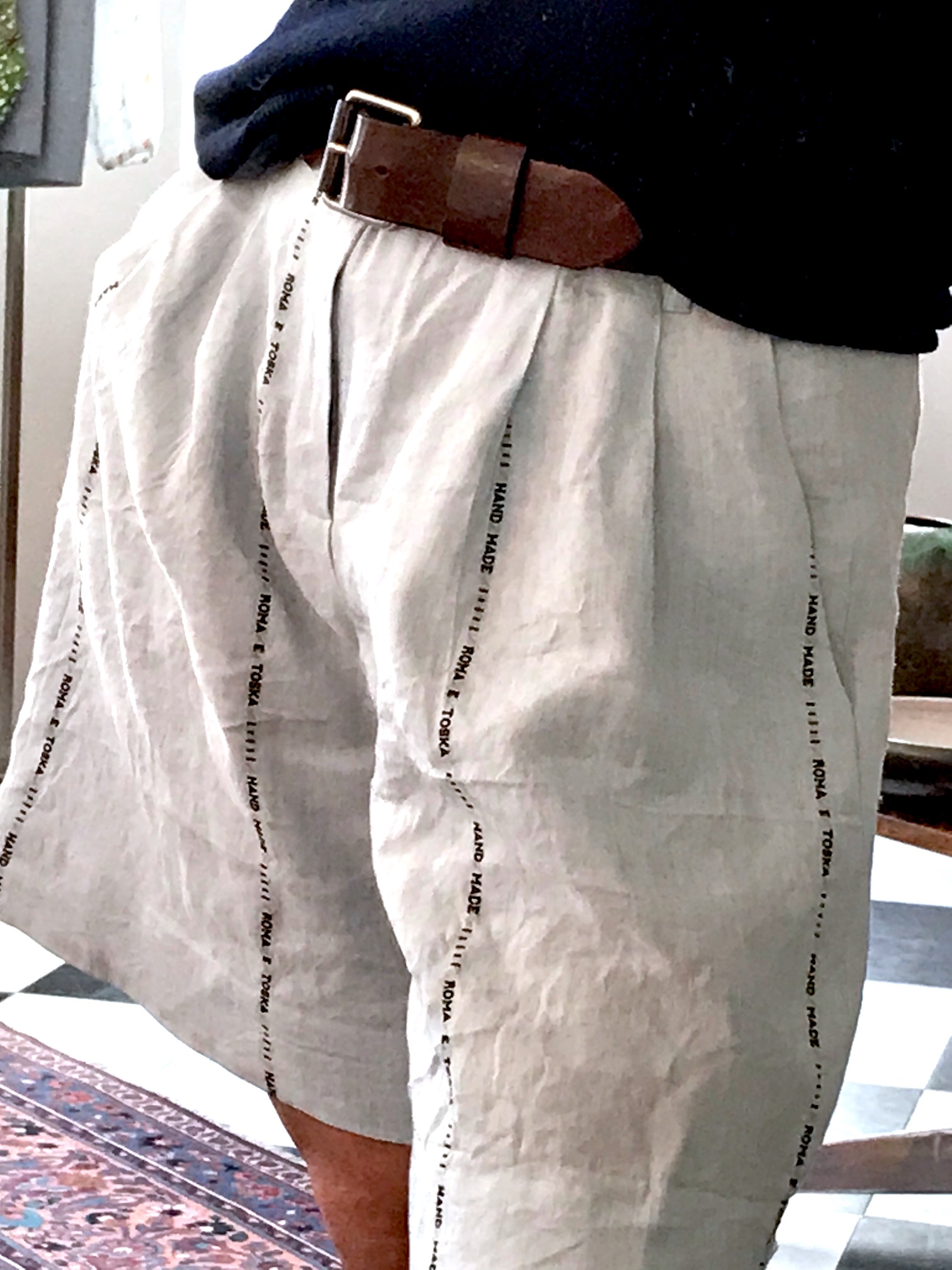 Der Schnitt ist ein Mix aus Retro und Boyfriend, damit lässt sich das Modell mit Gürtel in der Taille tragen oder lässig auf den Hüften. Bundfalten, weit ausgestellt zum Knie, Seitentaschen. Trotz der Weite orientiert es sich an der Figur. Als Stoff habe ich im Lager gestöbert und eine wunderschöne Leinen-Seide gefunden mit einwebten “ROMA E TOSKA HAND MADE”. – Ein Statement, genau wie es die Zeit verlangt.