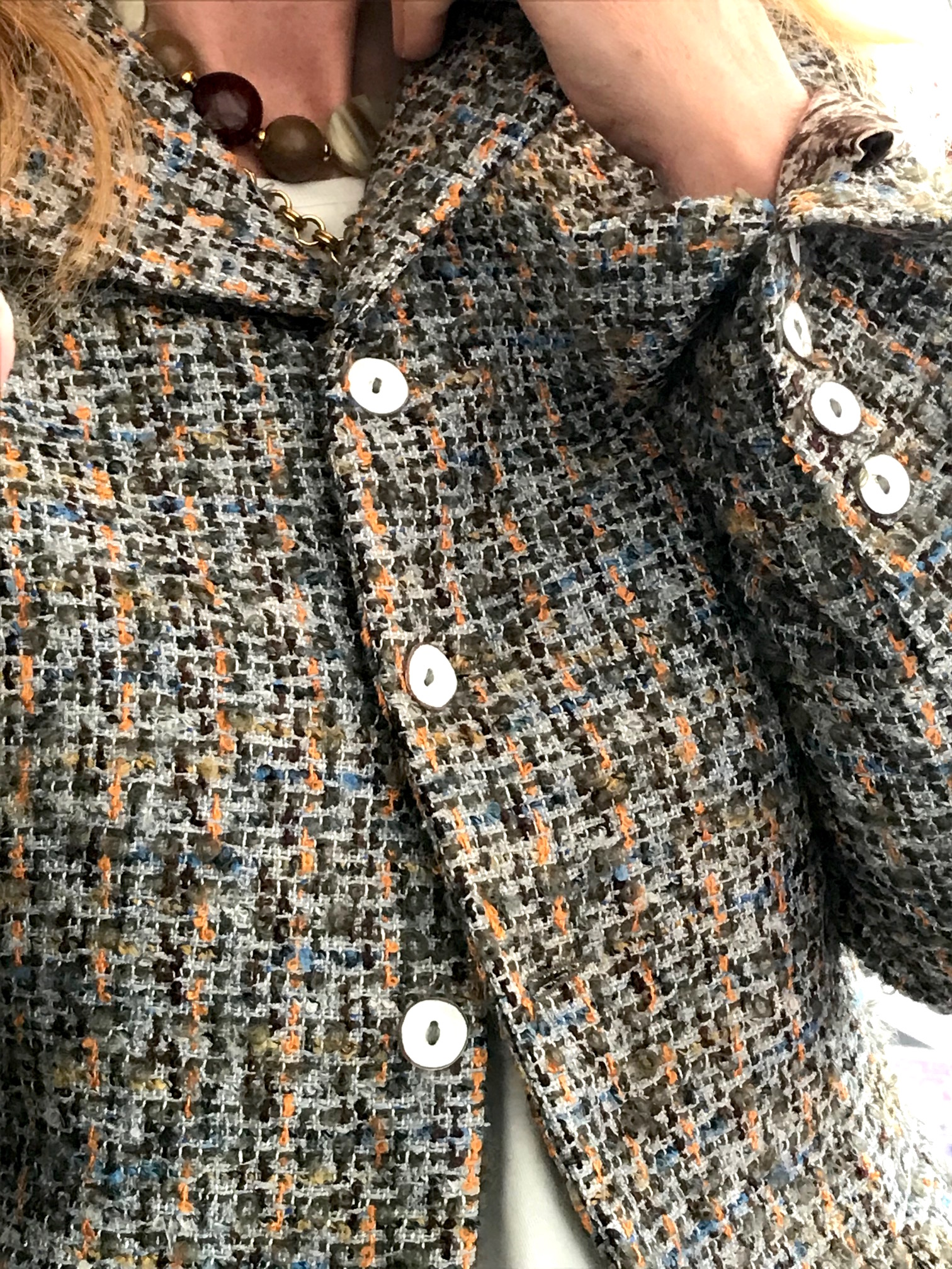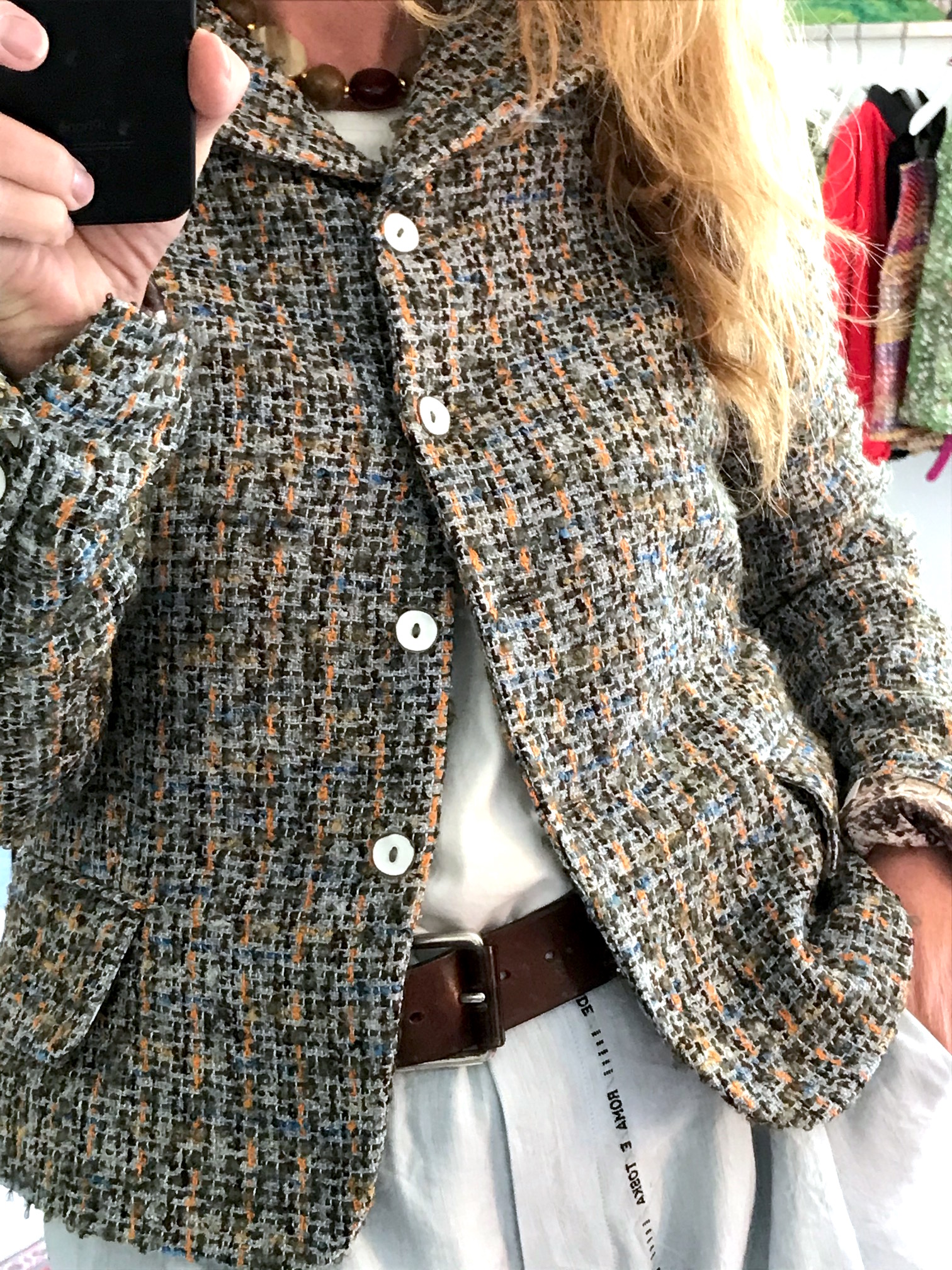 Und dann gibt es noch den klassischen taillierter Blazer aus Bouclé mit dem Futter der Savanne. Unverzichtbar und kombinierbar zu allem, was wir im Kleiderschrank wieder neu entdeckt haben. Die Knöpfe sind aus emaillierter Akoya-Muschel.
