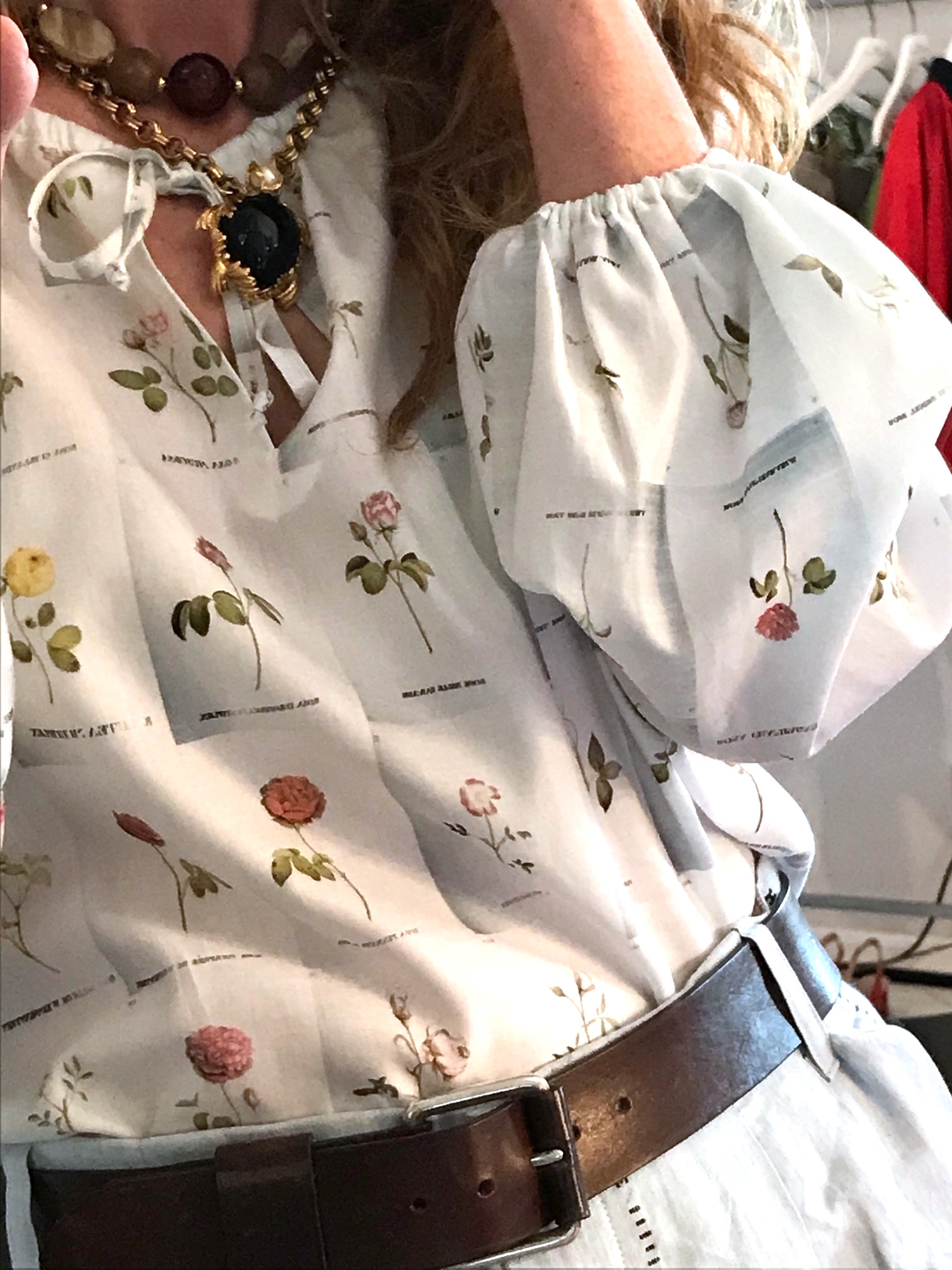Außerdem kam gestern die Cotton-Bluse an: Ebenfalls ein neues Modell mit gerüschtem Ausschnitt wie in den 1970ern, schmalen Ärmeln, die zum Handgelenk hin tulpig geformt sind. Auch hier hat ein früherer bedruckter Baumwollstoff sein erfrischendes Coming Out erhalten: Die Rosen aus dem berühmten Garten von Schloss Wilhelmshöhe im späten 18. Jahrhundert. Die Bluse gibt es in S, M, L und ist limitiert auf jeweils fünf Stück pro Größe.