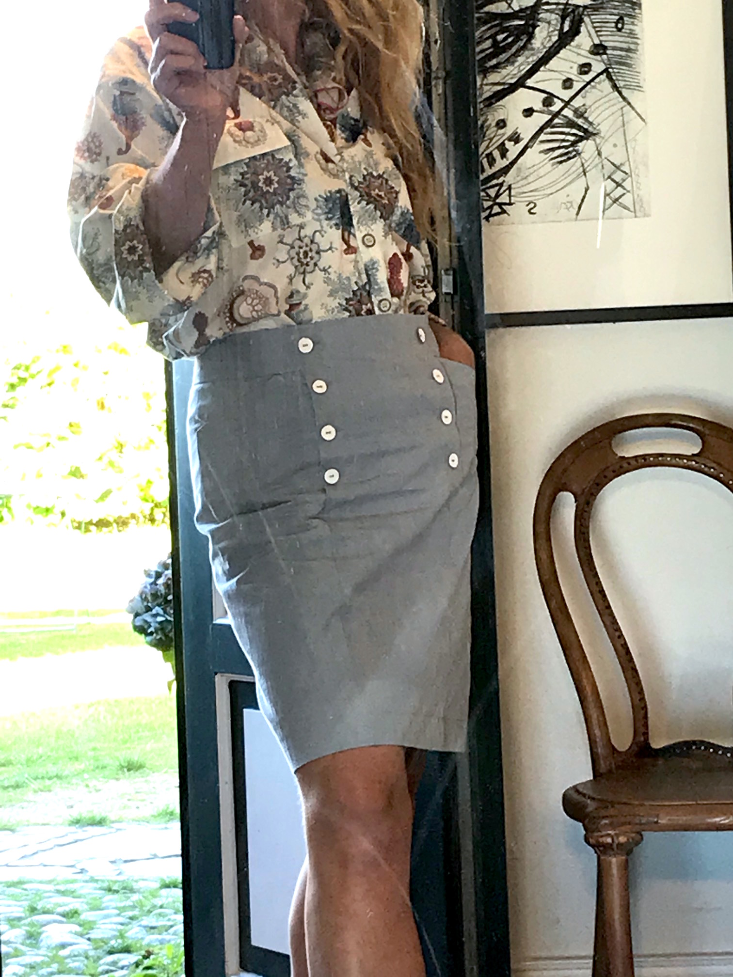 Nun das Problem, es gibt zwei Schnitte!!! Einer raffinierter und schöner als der andere. Entweder die Hollandbluse mit dem schmalem Rumpf und weitem Puffarm. Rundhals mit einem kleinen hellblauen Knopf. (€ 398)