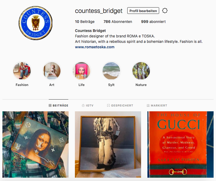 Hier die Herleitung und Geschichte zu COUNTESS BRIDGET: Es gibt Roma e Toska, die Modemarke, die dieses Jahr ihr Zwanzigjähriges feiert, dazu gehört das Logo-Krönchen der Gräfen mit den neun Zacken. Und es gibt mich – auch mit Jubiläum, eine lange Zeit davon als Countess. Mein Denken ist breiter als meine Mode, natürlich ich bin der “Trichter” mit allen Facetten, kreuz-und-quer durch das Leben, die Kunst, die Natur, einiges davon wurde zur DNA meiner Entwürfe und Stoffe.