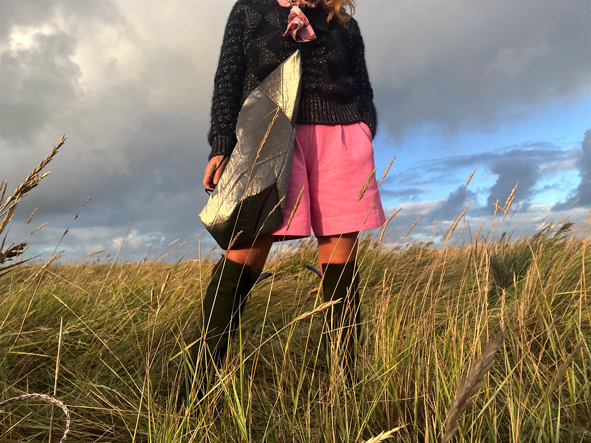 Pullover Saint-Laurent, kurze Hose in Pink (auf Anfrage, € 398), Tuch mit Muscheln als Proto.
