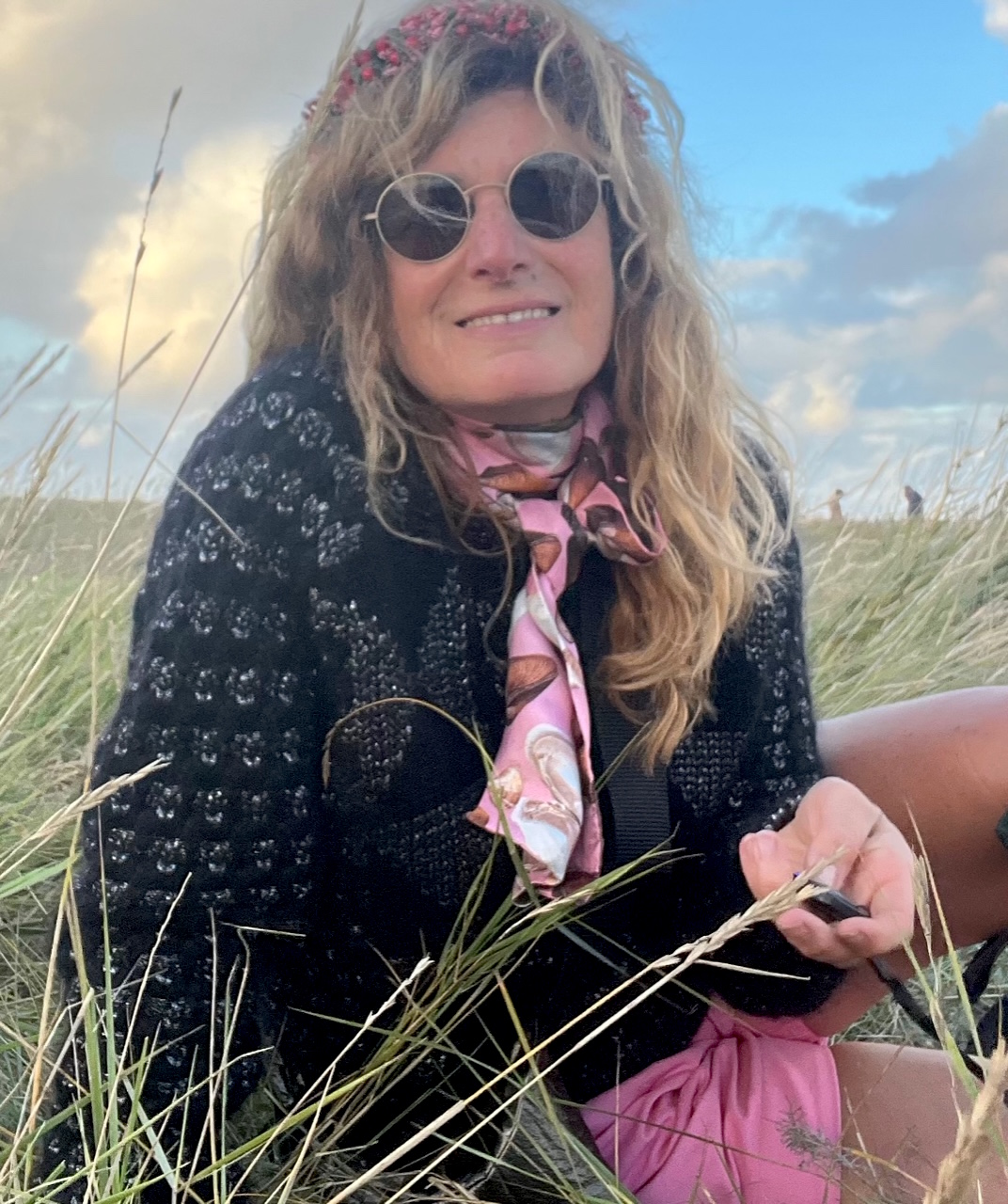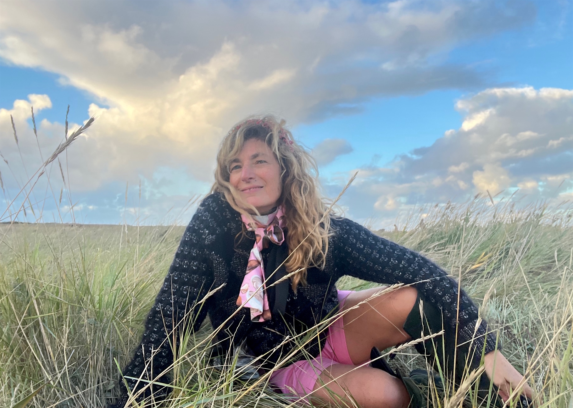 Da ist sie endlich in ihrem neuen Outfit mit pinkfarbenem Godet-Rock, Bonnard Bluse, neuer Weste und Tasche. Und nun? Sich etwa in das schmutzig-feuchte Gras fallen lassen? Ich weiß auch nicht so recht, mir ist ausnahmsweise kalt.