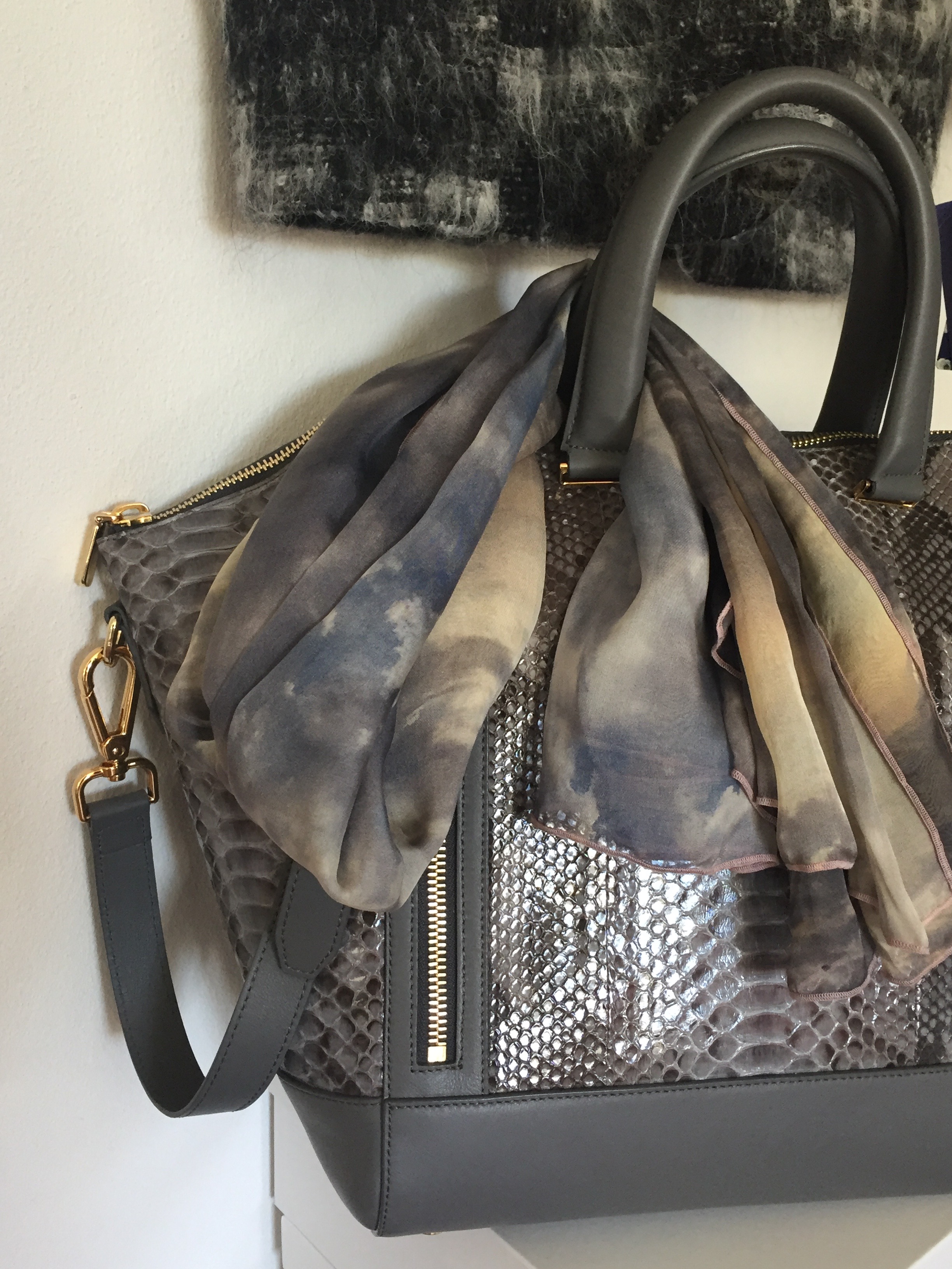 Abb. oben: Nude Wildleder Tasche mit “da Vinci” Schal aus der neuen Herbst-Winter Kollektion. Abb. unten: Python-Tasche mit Sylter Wolkenschal ebenfalls aus der neuen Herbst-Winter Kollektion.