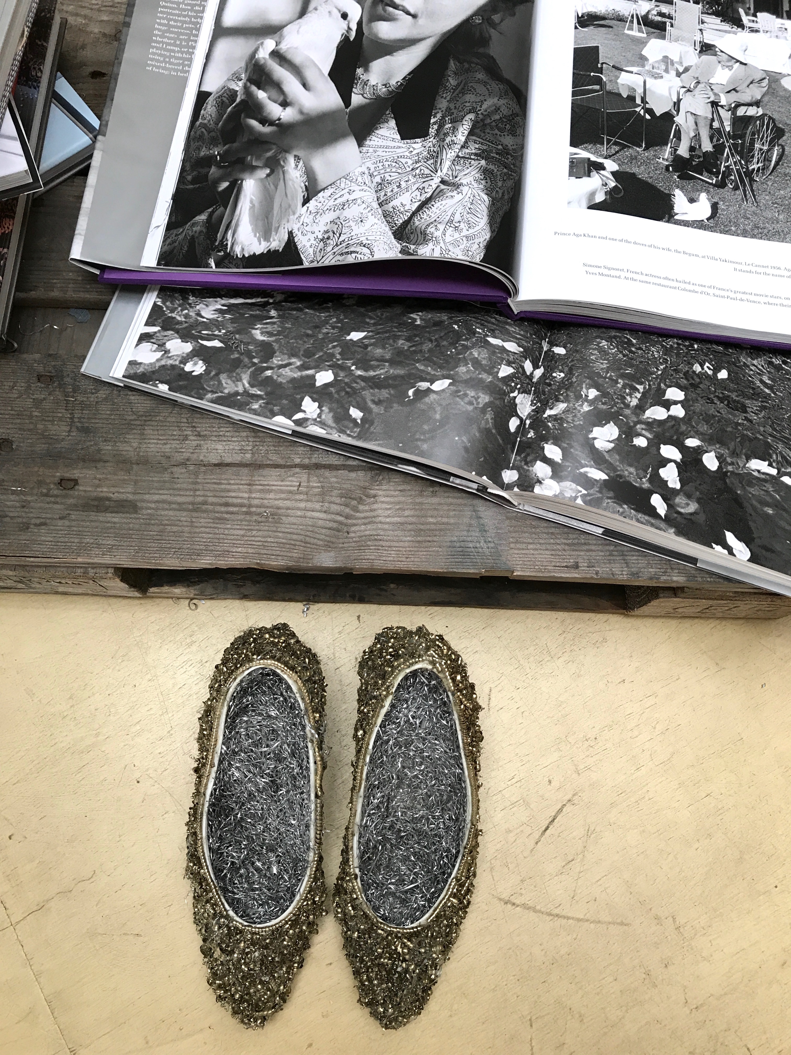 Nun stehen das Cocktail Dress, die Morgenmäntel und das Hochzeitskleid sowie Pumps und Hausschuhe in der Milchstrasse unter der Glaskuppel, auf alten Europaletten und Stapeln von Büchern.