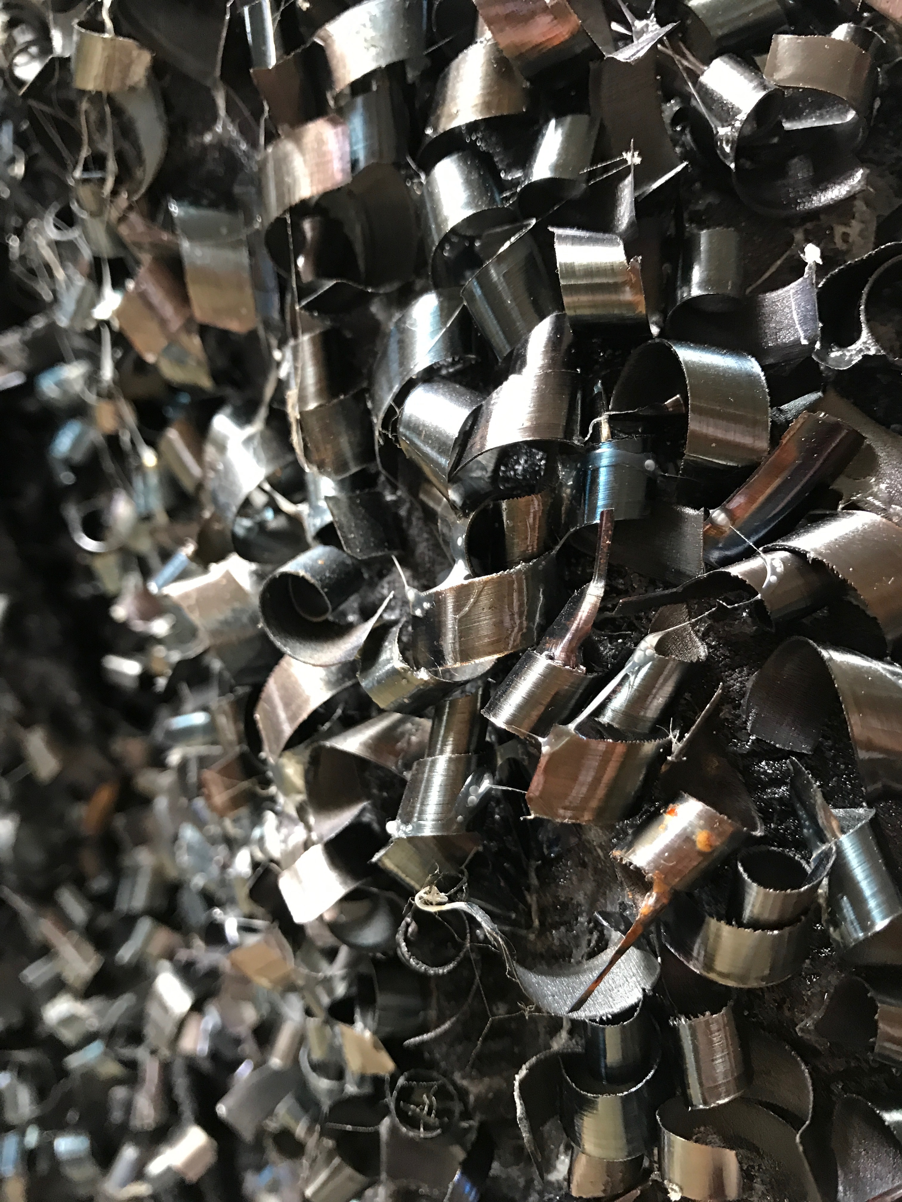 Was eigentlich weich, schwingend und fließend in der Mode ist, wird bei der holländischen Künstlerin Maria Schuchardt zu steifen, statischen, kratzigen (oder kratzbürstigen) Skulpturen. Aus Metall-Spähne, Abfall in dem Betrieb ihres Mannes, fertig sie die Objekte, klebt jedes Teil sorgsam nebeneinander, so wie andere Masche für Masche stricken. – Frauenarbeit mit großen Händen, die eher zu einem Mann passen oder eben zu einer Bildhauerin.