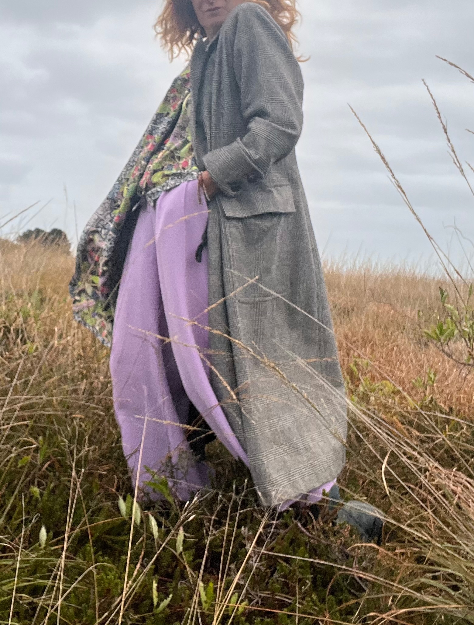 Ich liebe solche Mäntel, mit denen man sich umhüllen kann, um darunter ganz zart und versponnen zu sein. Leicht fühlt er sich an und doch wärmt er auf wohlige Weise, gerade richtig für diesen Spaziergang im Nieselregen.