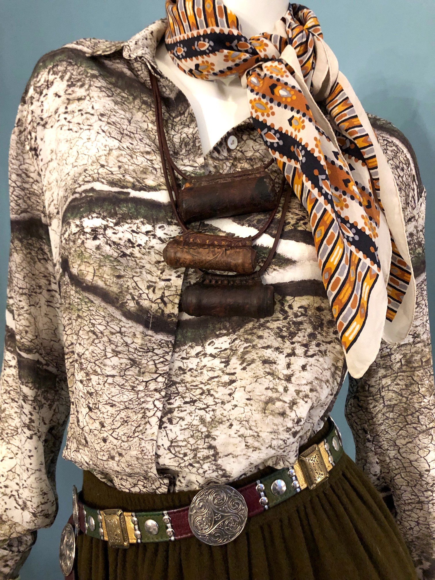 Abb: Vintage Wollrock Yves Saint Laurent 1970er, Savannen Seidenbluse Roma e Toska, Kitab Ketten Äthiopien, Seidentuch Yves Saint Laurent Vintage, Gürtel Monica von Bialy, Stiefel Taglia Scarpe.