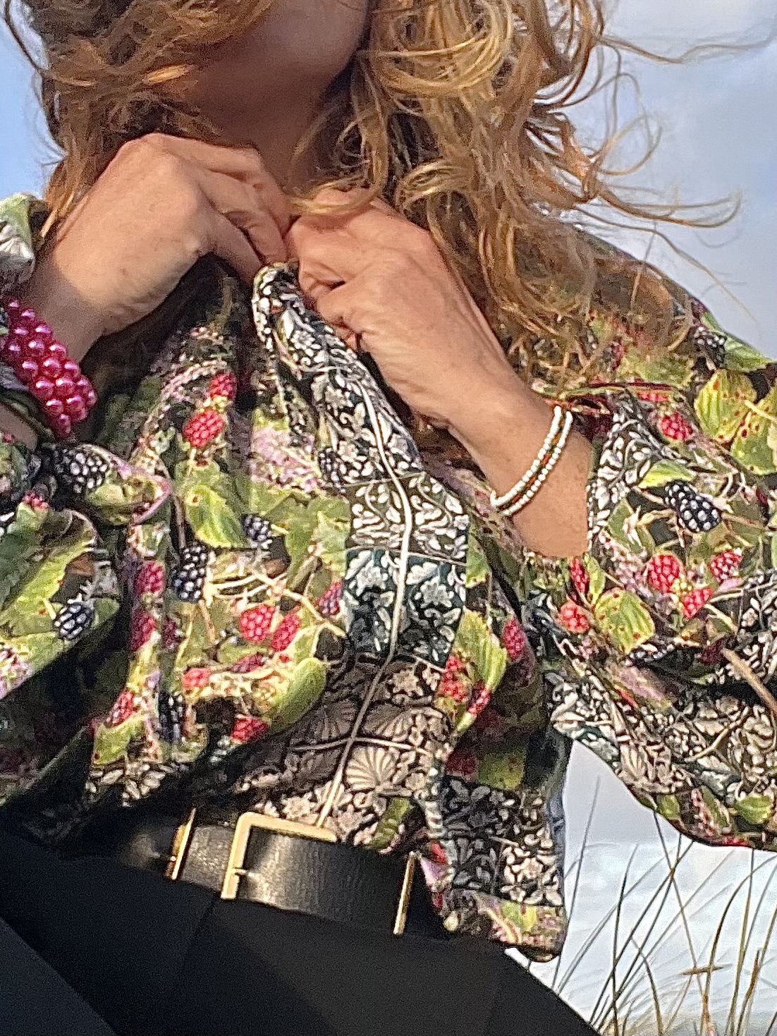 Die Hose ist von Dries van Noten, vor Jahren in Paris in seiner wunderschönen Boutique am Rive Gauche gekauft, der Gürtel von Yves Saint Laurent. Dazu trage ich heute morgen die Seidenbluse mit den weiten Ärmeln, die den siebziger Jahren entlehnt ist und für die der große Couturier Pate stand. Bei uns ist sie zu einem bestselling Evergreen geworden in verschiedenen Prints und Farben.