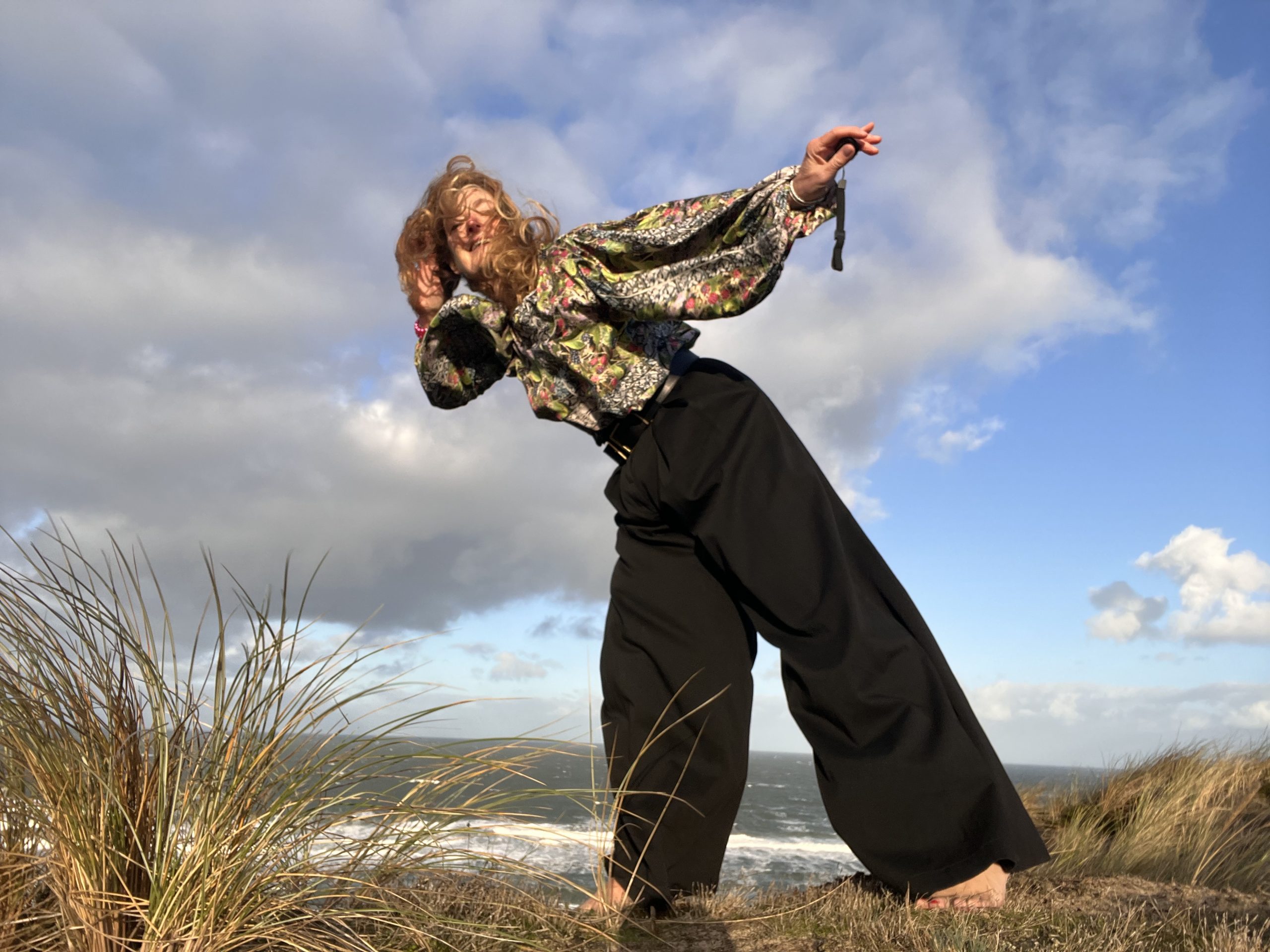 Notiert? Dann kann ich ja mit der Vorstellung der neuen Puffarm-Brombeer-Bluse weitermachen. Gut gelaunt stemme ich mich gegen den Wind oben am Kliff querab der Uwe Düne. Bei schätzungweise 8 Windstärken aus West-Nordwest gar nicht so einfach, alles hübsch dekorativ im Griff zu haben. Ich sehe nichts. Click!
