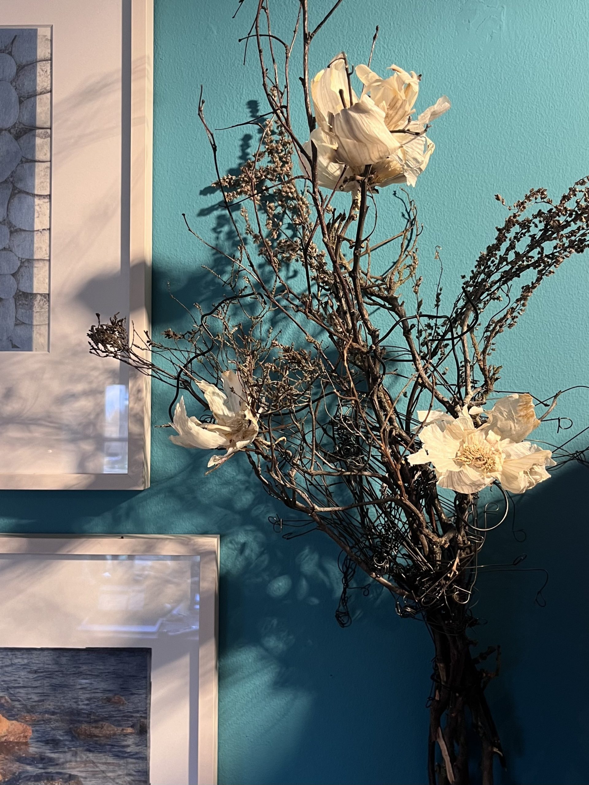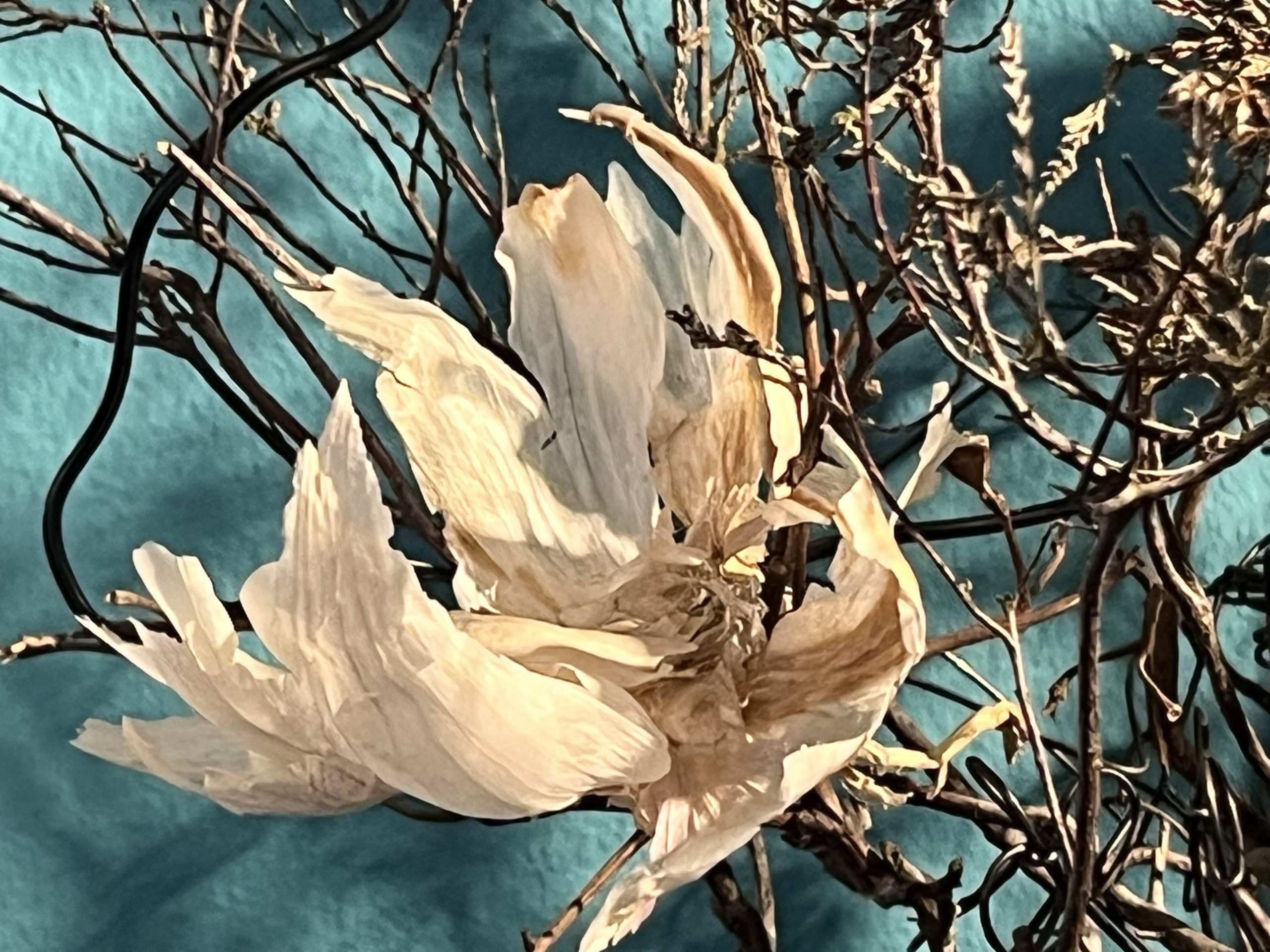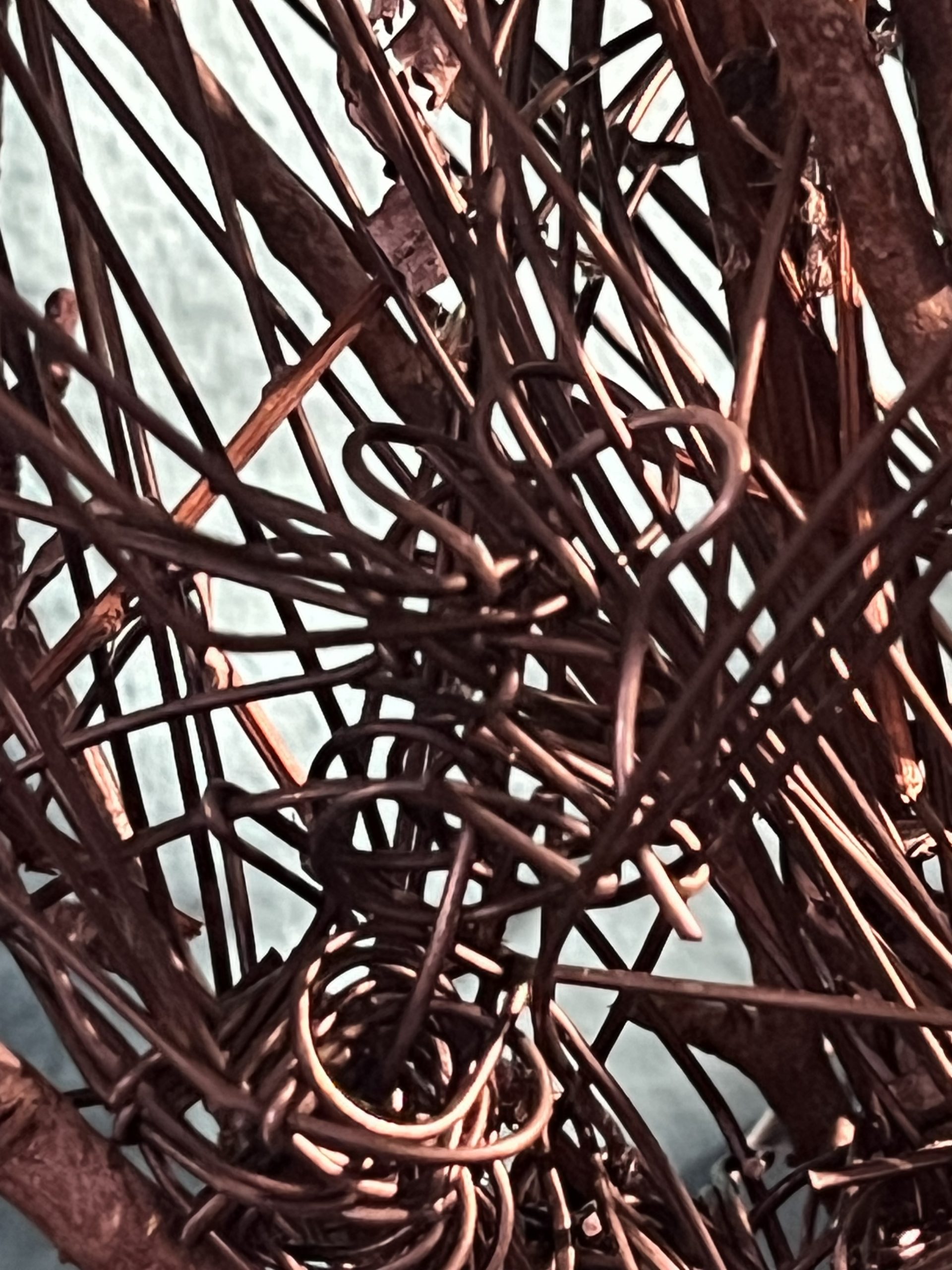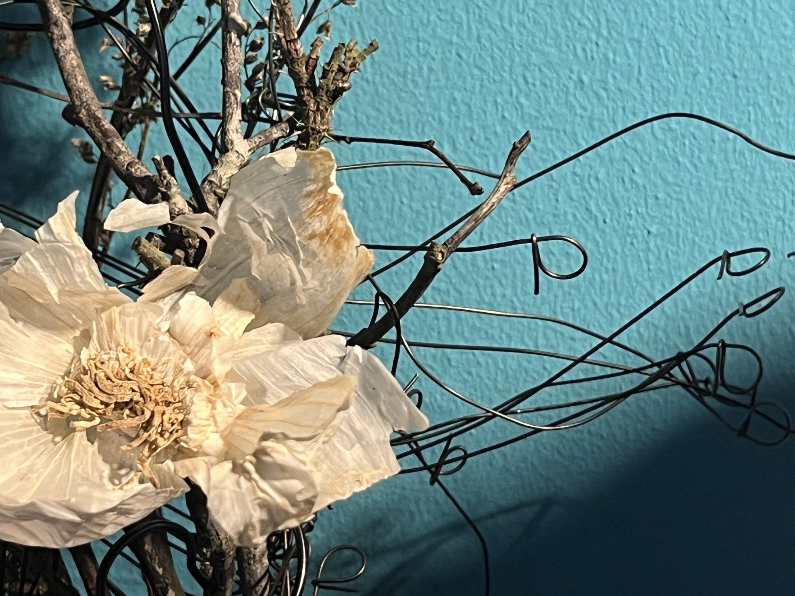 Toska schenkte mir zu Weihnachten eines ihrer ersten Objekte, ein Blumenstrauß aus Ästen mit Drahtumwickelungen und Blüten aus Knoblauchblättern. Fragil und gleichzeitig selbstbewusst zugleich. Die Drähte recken, strecken und kringeln sich fröhlich zu den Seiten. Sie erinnern mich entfernt an die kindliche Poesie eines Paul Klees.