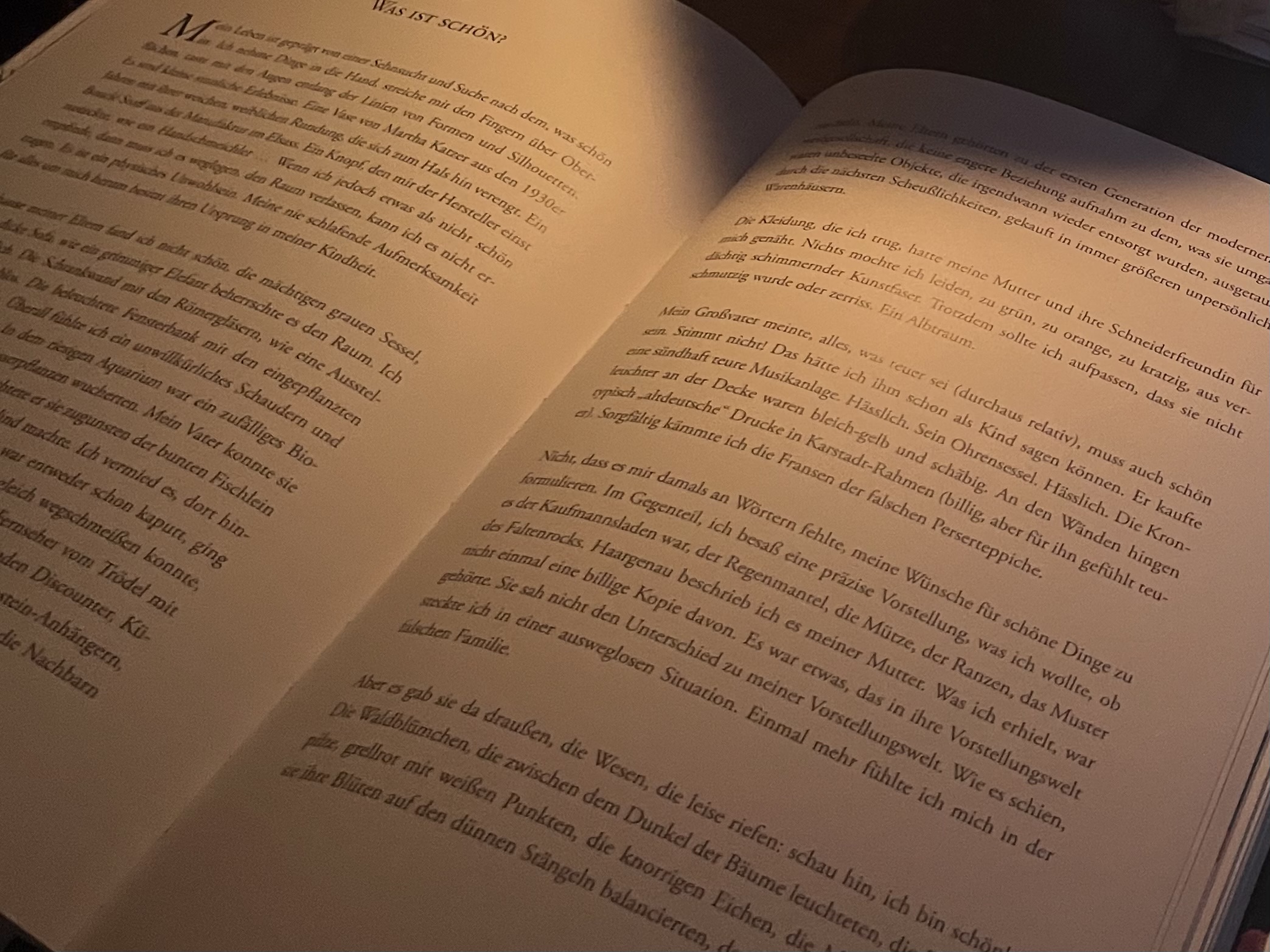 Diesmal las Christine von den Prägungen, und ich, wie mich die Suche nach Schönheit geprägt hat: „Ich nehme Dinge in die Hand, streiche mit den Fingern über Oberflächen, taste mit den Augen entlang der Linien von Formen und Silhouetten. Es sind kleine sinnliche Erlebnisse. (…) Meine nie schlafende Aufmerksamkeit für alles um mich herum besitzt ihren Ursprung in meiner Kindheit.”