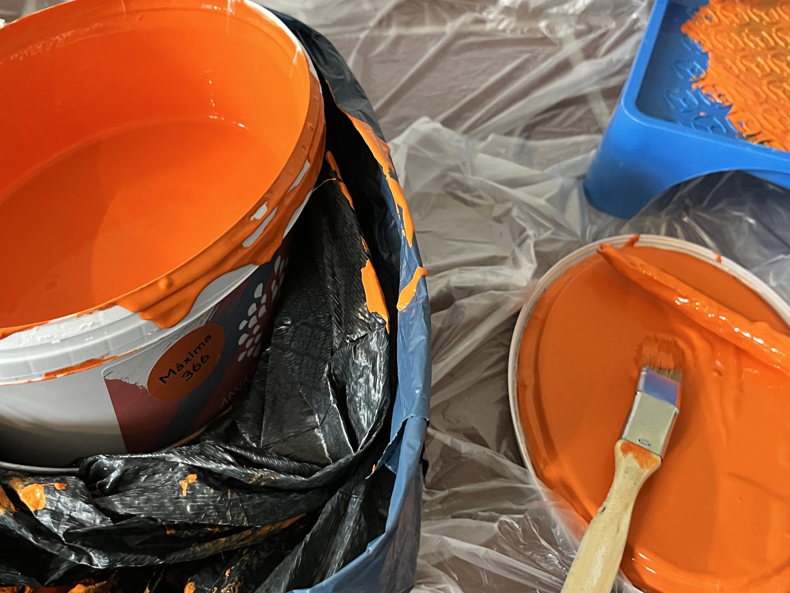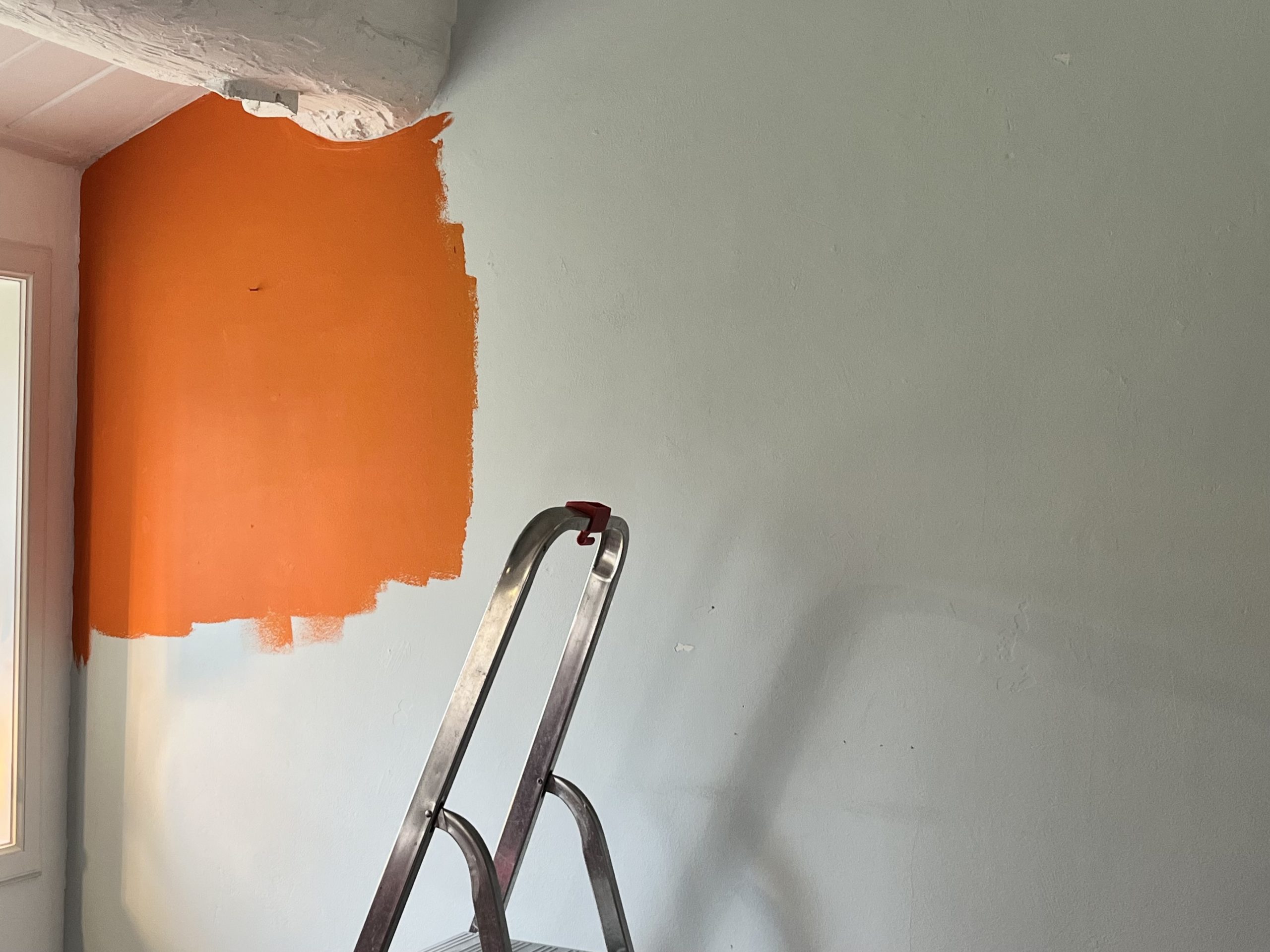 Routiniert wie eine professionelle Malerei nahm ich mir anschließend die Stirnseite am anderen Ende vor. Diesmal in einem satten, leuchtenden Orange (Máxima 366, Anna von Mangoldt). Kurz darauf fragte meine Tochter Toska, ob es mich stören würde, wenn sie künstlichen Staub herstelle mit Haferflocken. Stille! Pures Entsetzen, ich starrte auf meine jungfräuliche Farbfläche. – “Mami, atmen!”