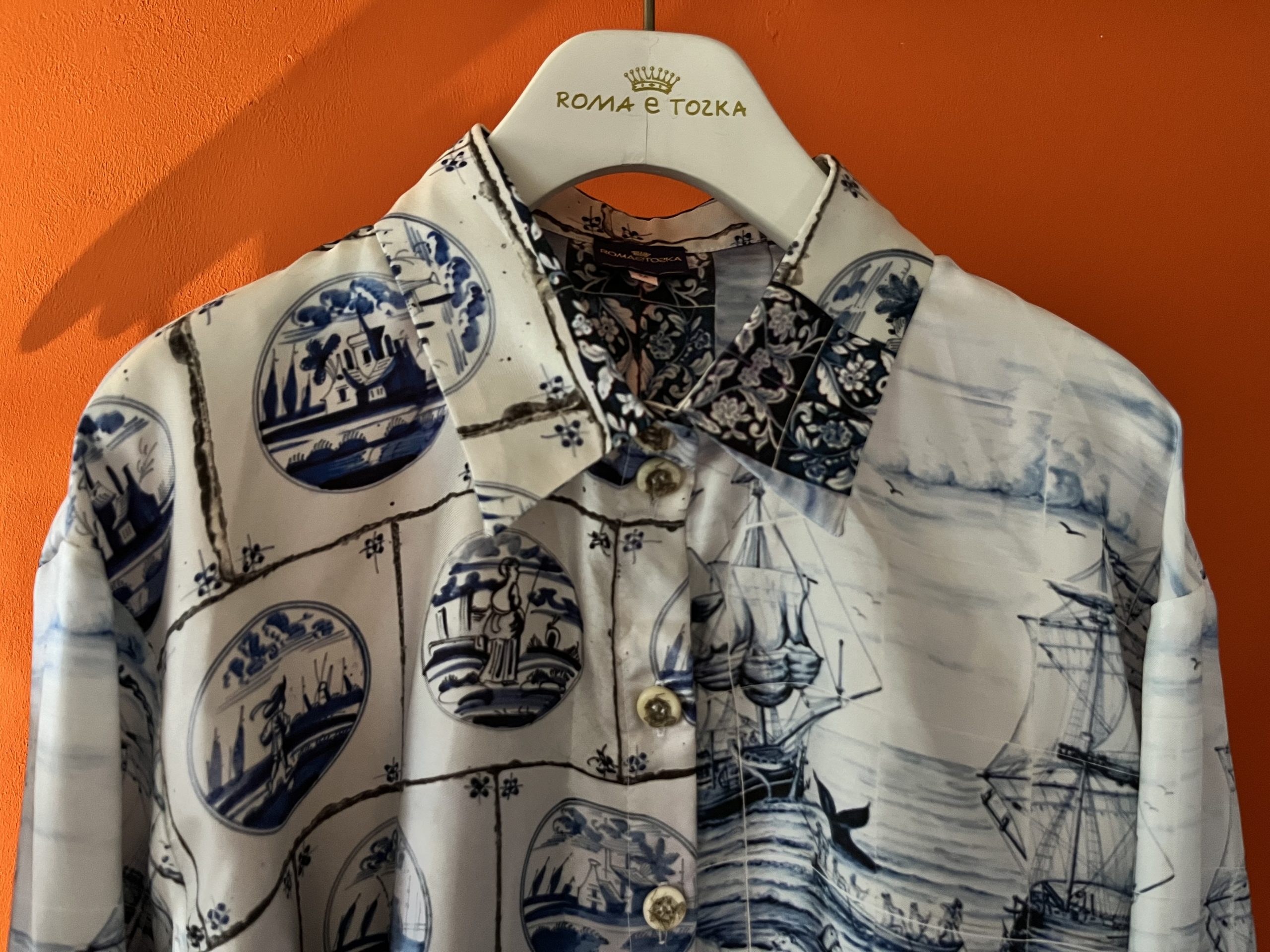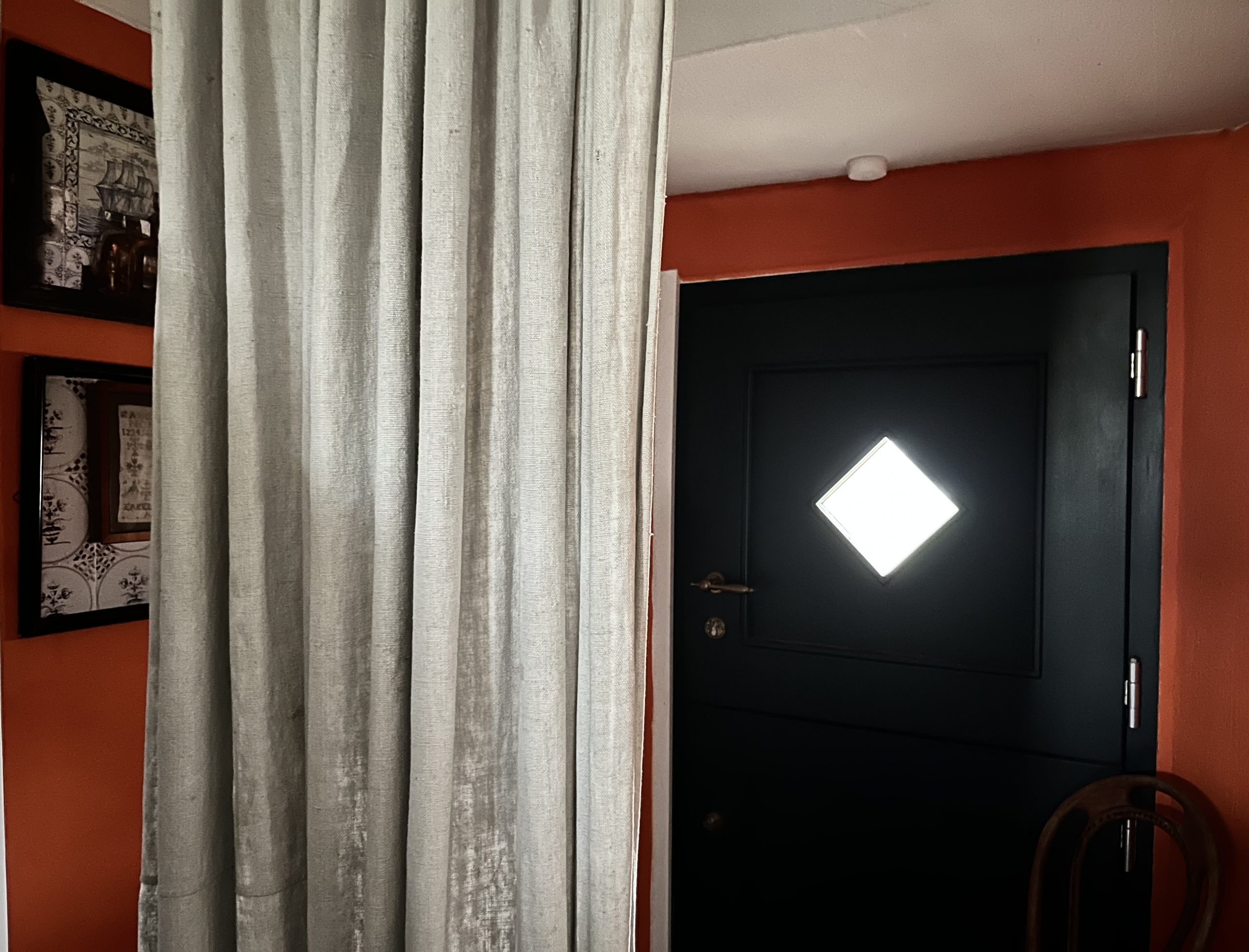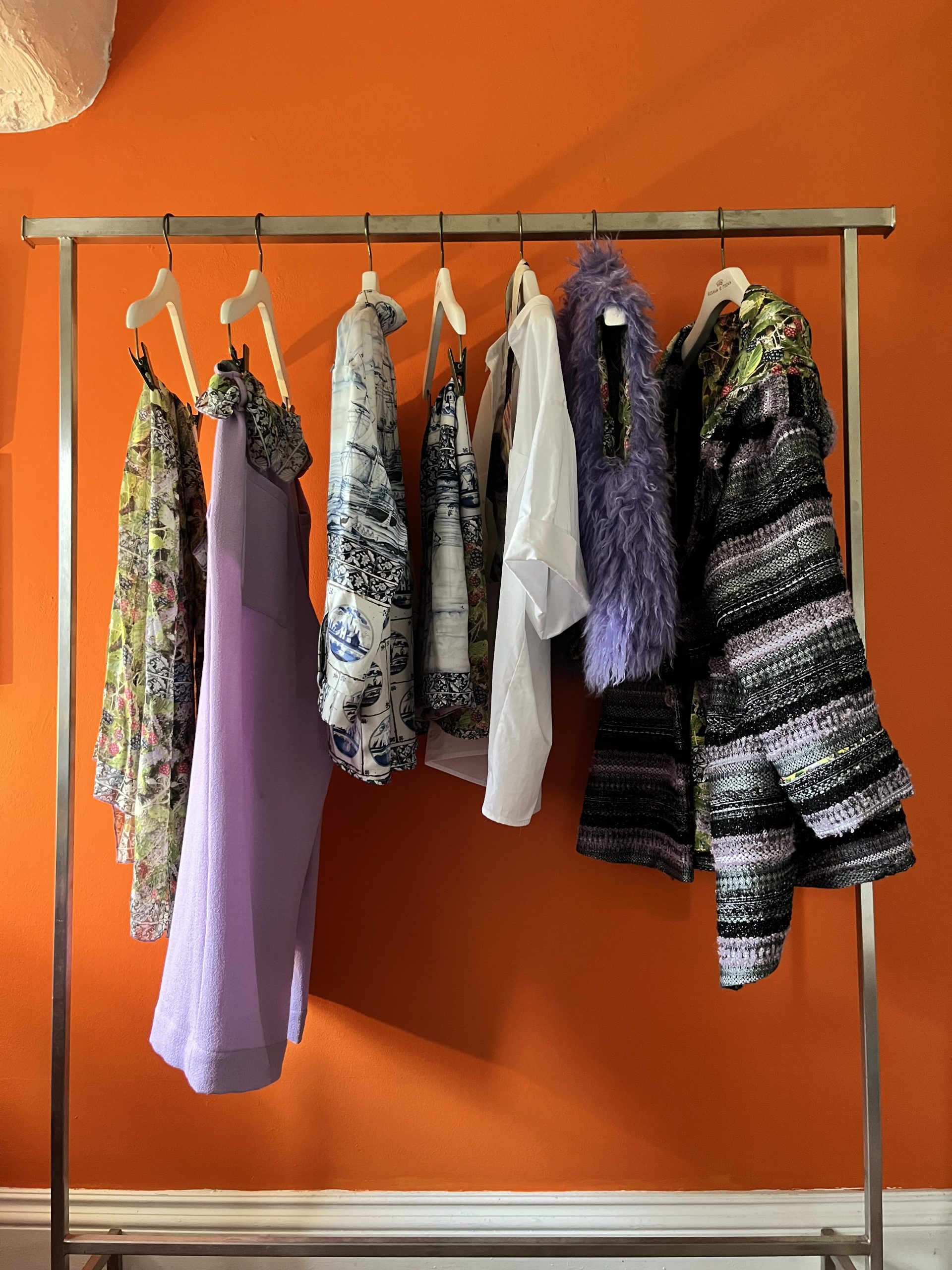 Kurz bevor die Freunde zum Dinner kamen, war alles fertig und wieder an seinem Platz: die Stange mit der Delfter Kachelbluse, der Eckschrank aus dem späten 18. Jahrhundert, der schwedische Spiegel mit der Hinterglasmalerei, die Bank mit den Pullovern, Shirts und Taschen. Selbst die Umkleidekabine lädt nun ein in einem Statement Orange.