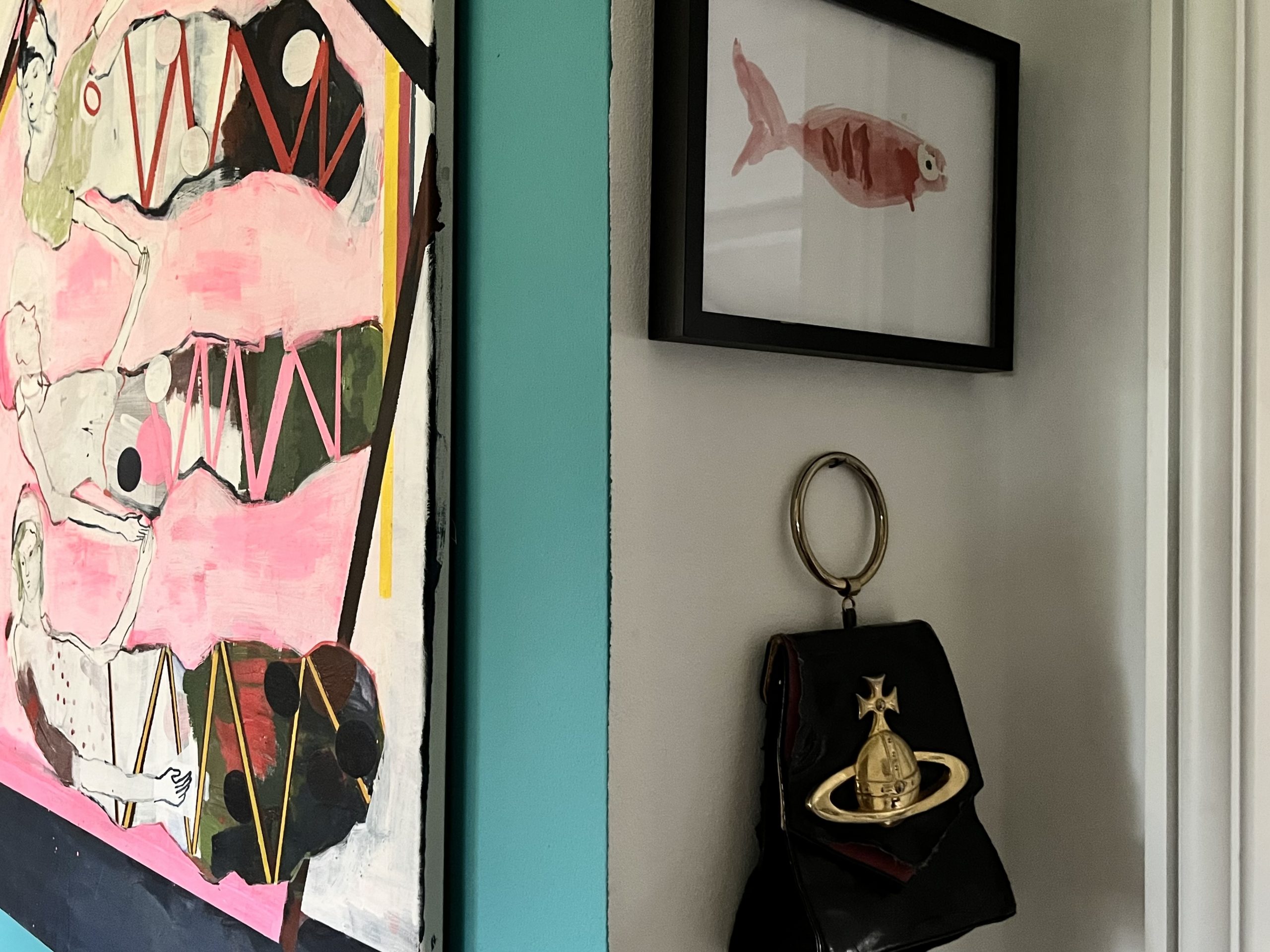 Alles neu! Die Fahne mit dem Friesenmuster der Sylter Brombeeren. Das Regal mit den Secondhand Taschen. Die Stange mit den Delfter Blusen, Schals und Stolas. Und als alles hübsch an seinem Platz war, musste noch die neue Farbe an die Wand. Logistisch eine etwas ungewöhnliche Reihenfolge, aber während der Öffnungszeiten ging es nicht. Also überpinselte ich am Karfreitag das muntere Pink mit einem “kraftvollen Freudensprung” in Capriole 258 von Anna von Mangoldt.