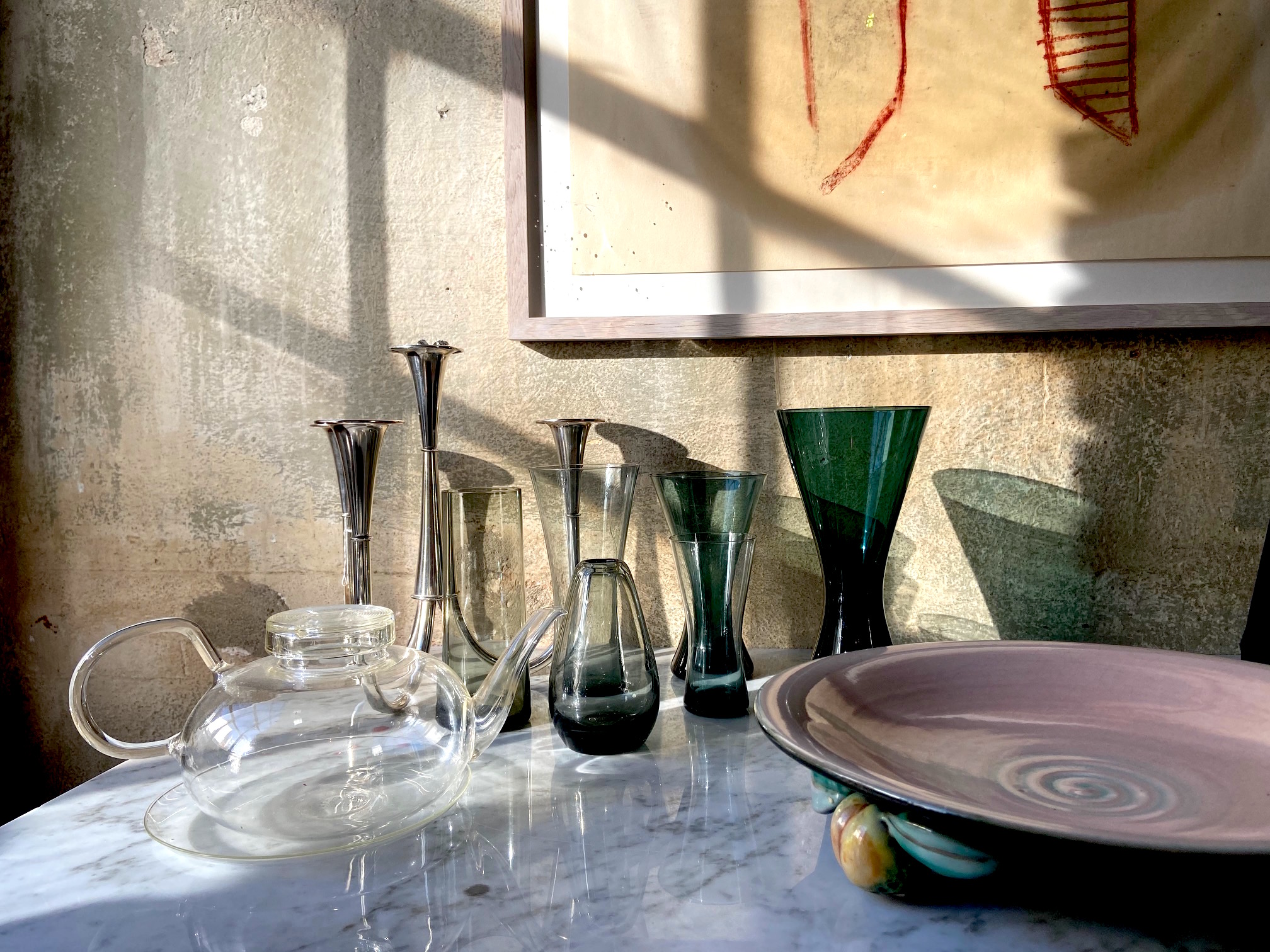 Die Vase von Wilhelm Wagenfeld aus den 1950er Jahren leuchtet in einem Grün mit wasserblauen Reflexen. Die Teekanne aus Jena-Glas darf sich ein wenig von dem Rosé der Keramik von Martha Katzer klauen. Und die Wände zeigen ein beige mit unendlich vielen Zwischentönen.