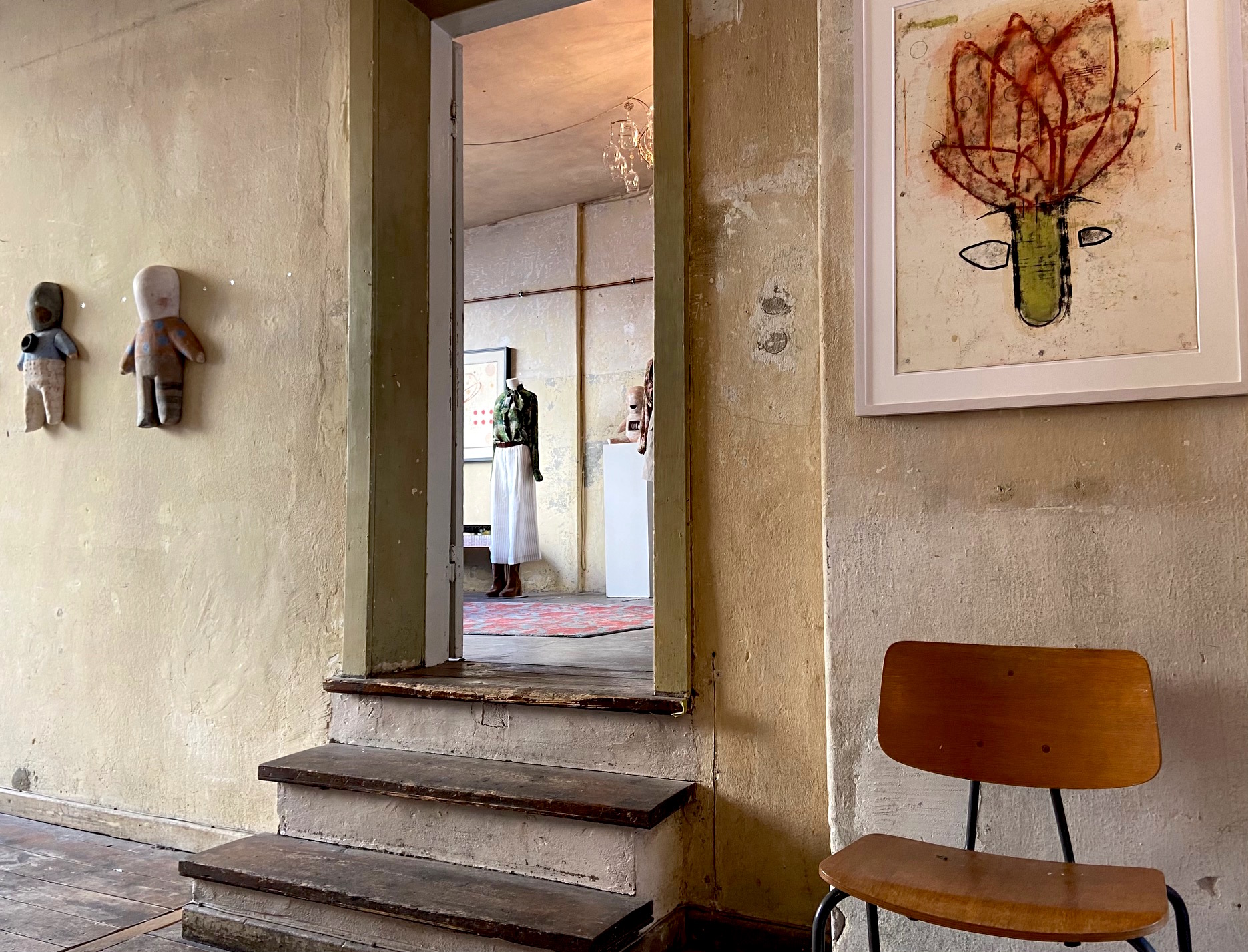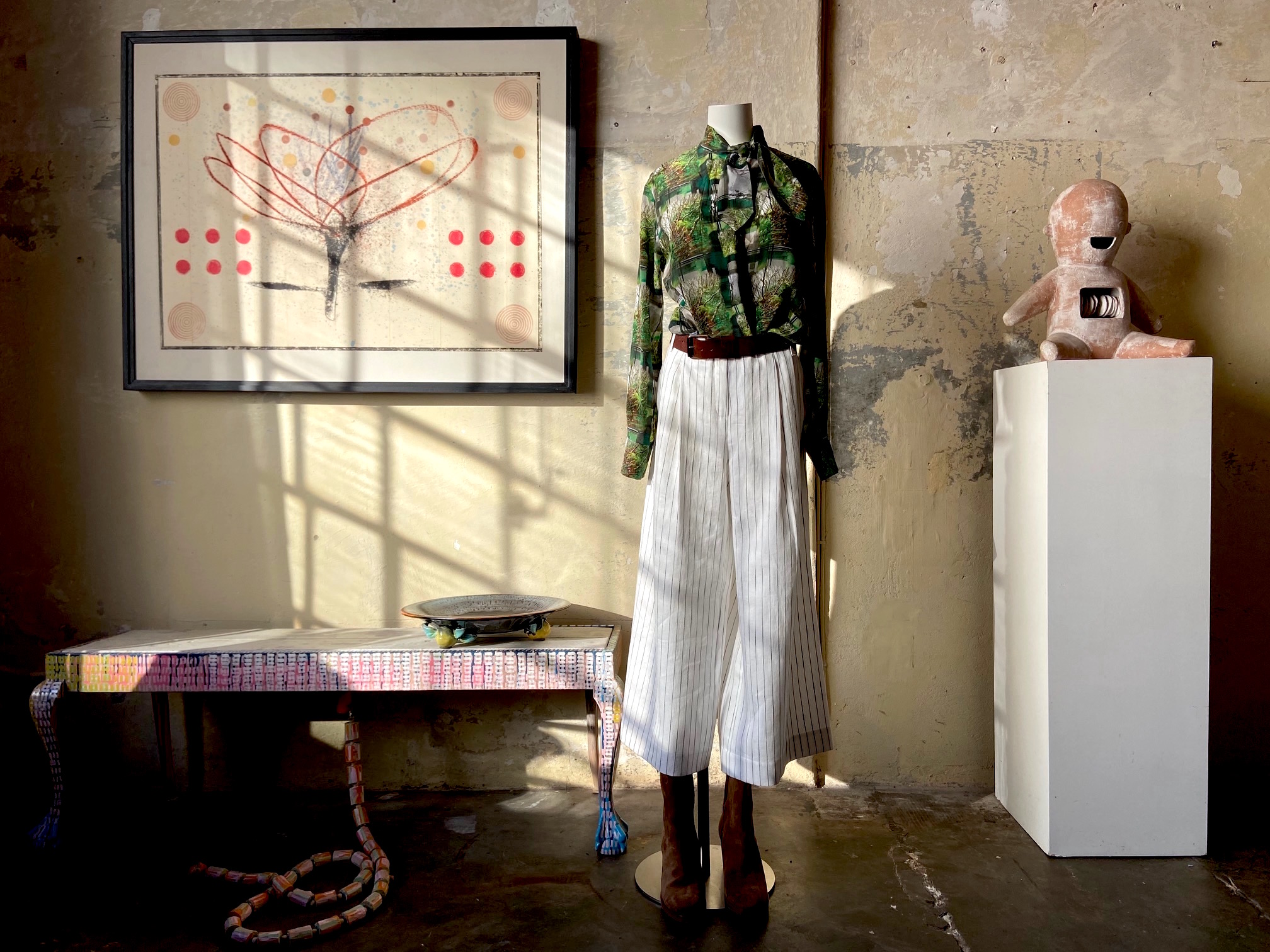 Abb: Ruwenzori Bluse, Seide mit Foulard (€ 498), Magpie Art Colletive, Bench with Taile Unikat (€ 1.850), Luca Lanzi Flower Stillife, Zeichnung auf Leinwand ( € 4.000))