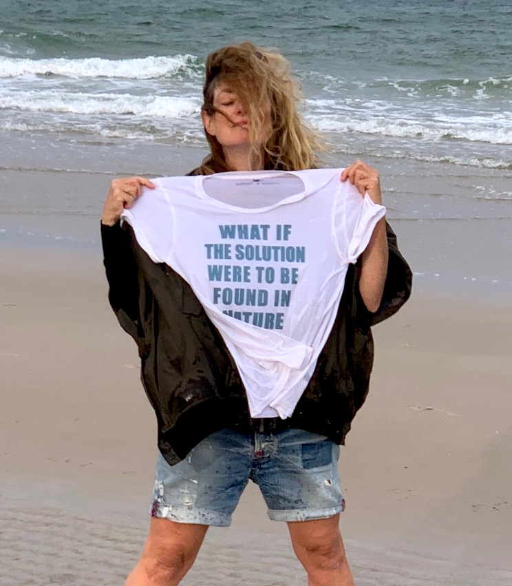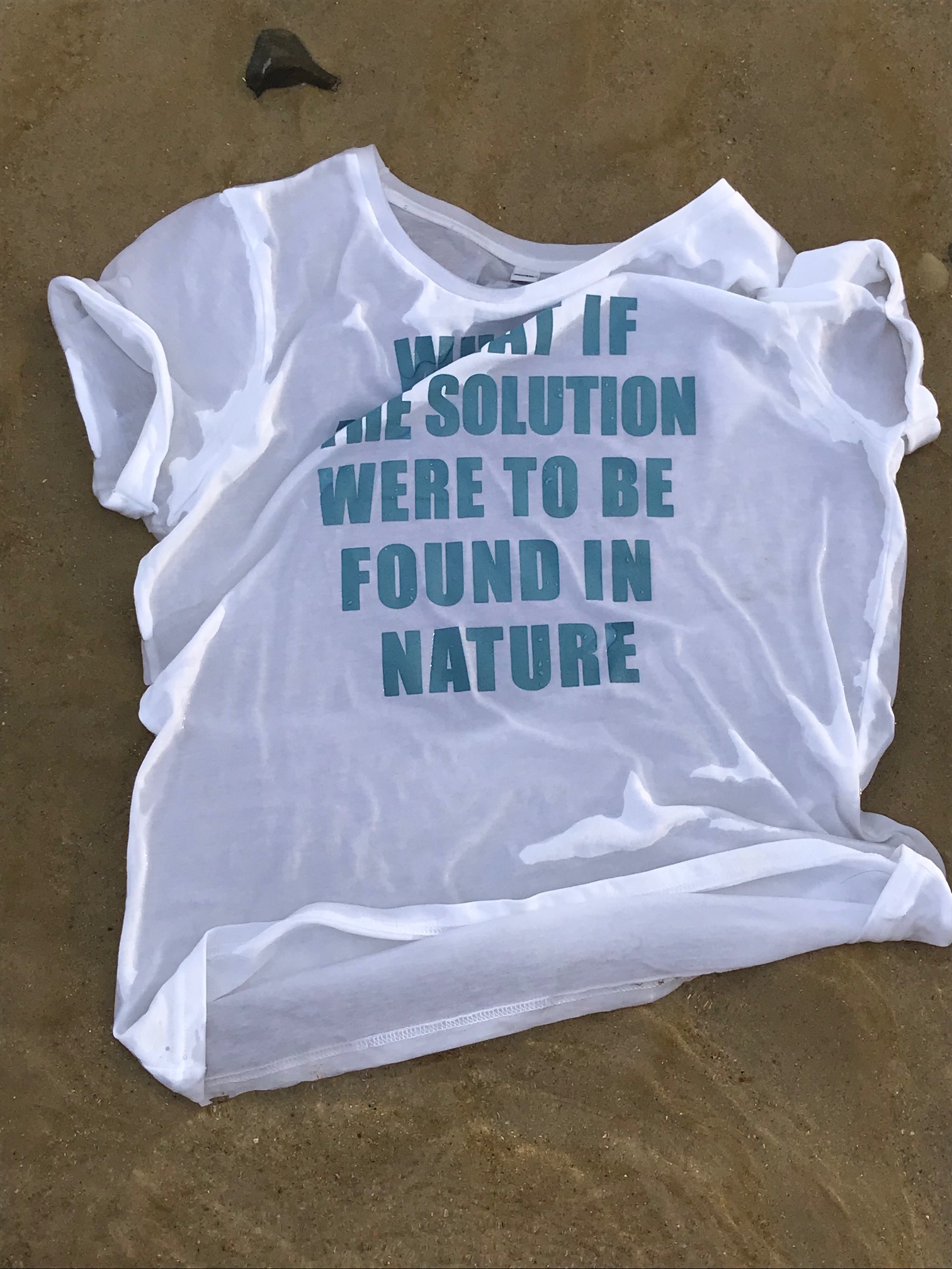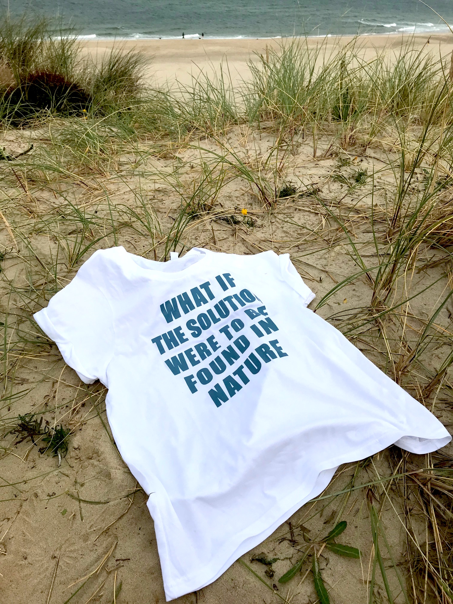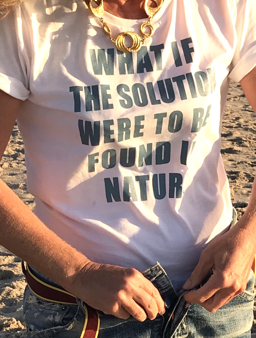 Obwohl ich das Fragezeichen auf dem T-Shirt aus ästhetischen Gründen weggelassen habe, bleibt es doch eine Frage an uns: What if the solution were to be found in nature? – Ein Auftakt für endlose Diskussionen, die (hoffentlich) zu einem neuen Handeln führen.