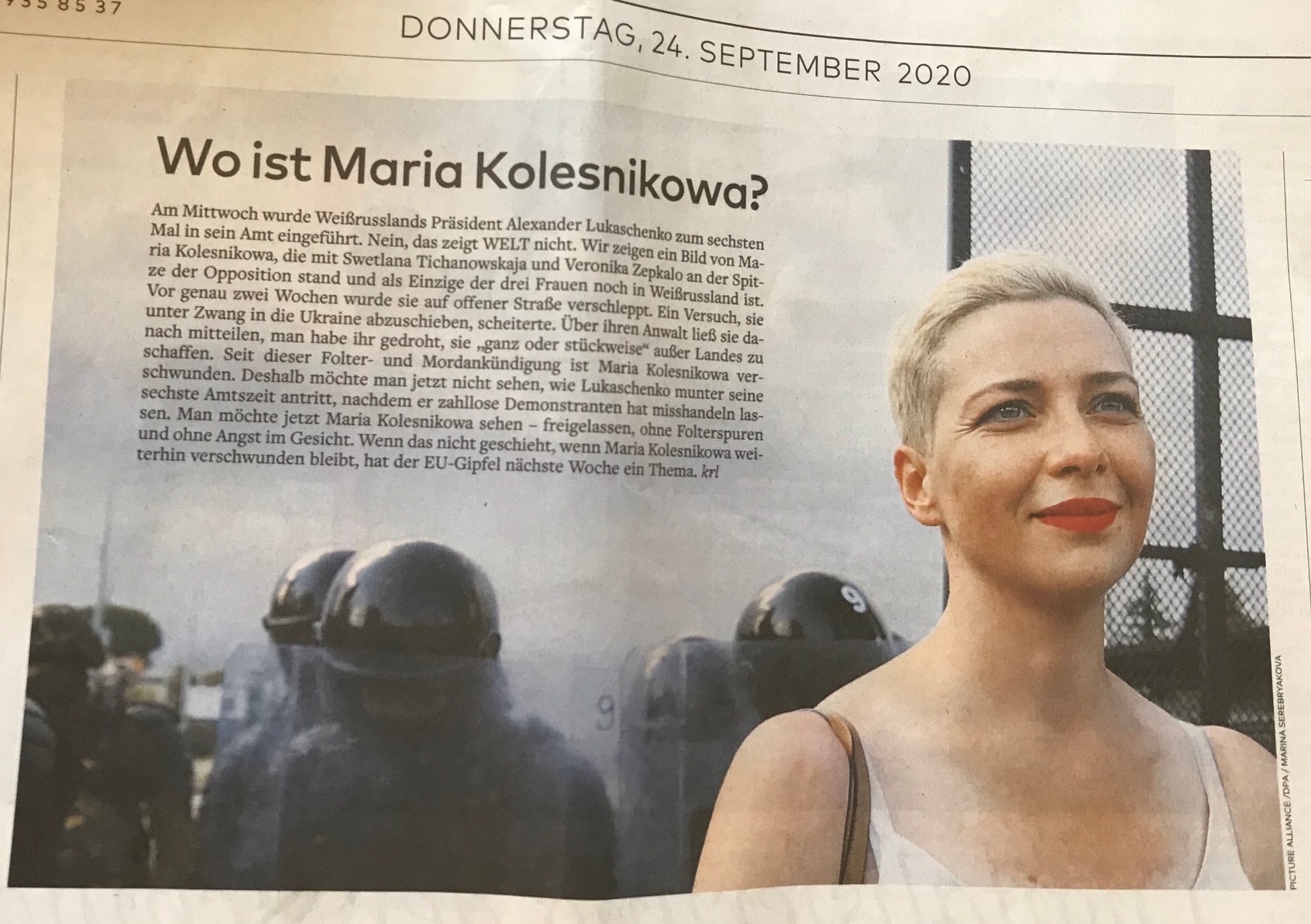 Am Mittwoch wurde Weißrusslands Präsident Alexander Lukaschenko zum sechsten Mal in seinem Amt eingeführt. Nein, das zeigt WELT nicht. Wir zeigen ein Bild von Maria Kolesnikowa, die mit Swetlana Tichanowskaja und Veronika Zepkalo an der Spitze der Opposition stand und als Einzige der drei Frauen noch in Weißrussland ist. Vor genau zwei Wochen wurde sie auf offener Straße verschleppt. Ein Versuch, sie unter Zwang in die Ukraine abzuschieben, scheiterte. Über ihren Anwalt ließ sie danach mitteilen, man habe ihr gedroht, sie “ganz oder stückweise” außer Landes zu schaffen. Seit dieser Folter- und Mordankündigung, ist Maria Kolesnikowa verschwunden. Deshalb möchte man jetzt nicht sehen, wie Lukaschenko munter seine sechste Amtszeit antritt, nachdem er zahllose Demonstranten hat misshandeln lassen. Man möchte jetzt Maria Kolesnikowa sehen – freigelassen, ohne Folterspuren und ohne Angst im Gesicht. (Auszug aus DIE WELT, 24.9.2020)