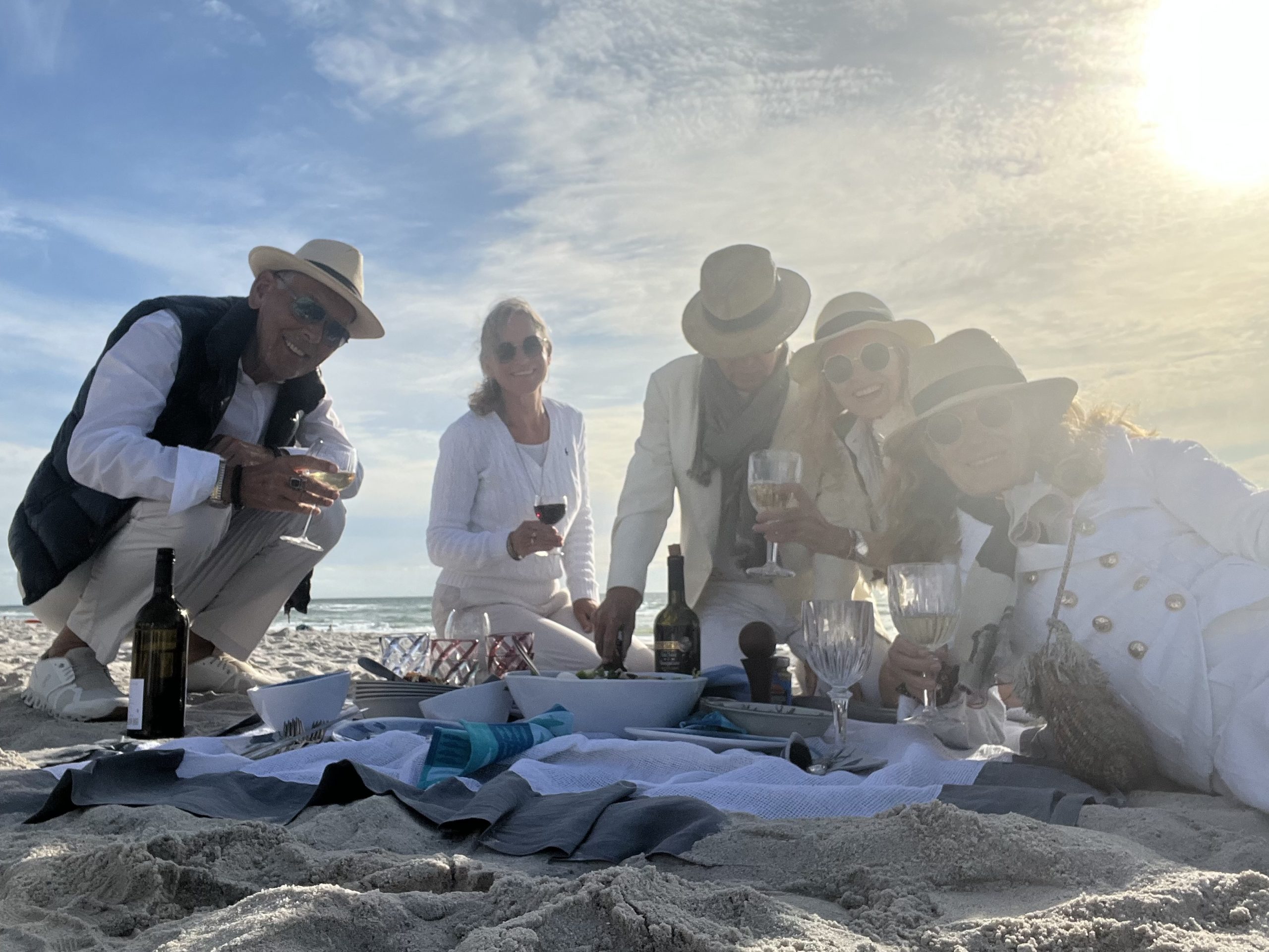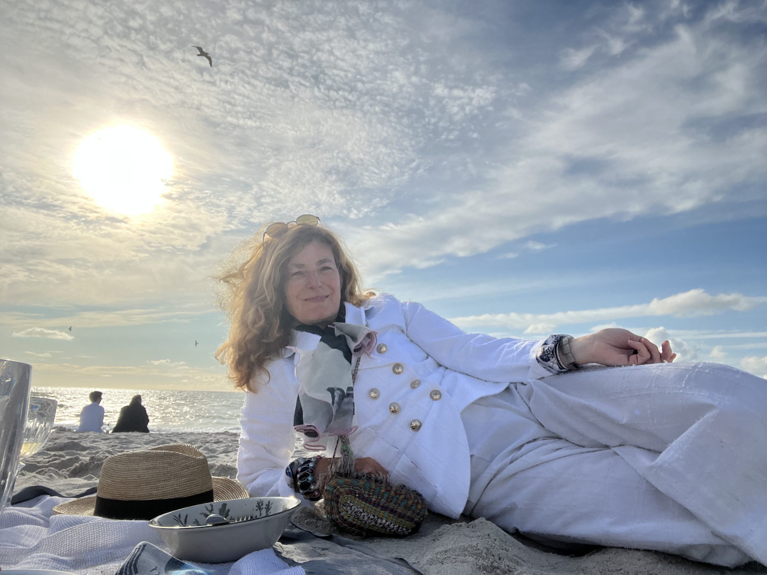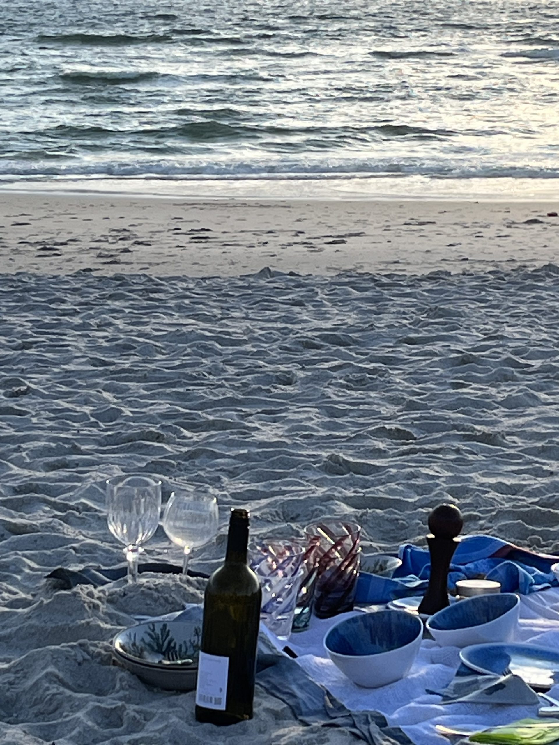 Wer nicht an der Tafel sitzen will oder keine Platzkarten mehr ergattern konnte, der arrangiert sich wie wir dekorativ im warmen Sand mit weißer Tischdecke und dem unkaputtbaren Geschirr von maison f. Es gibt Couscous, César’s Salad, das Schwarzbrot von Bäcker Speck, Bier und gekühlten Wein. Der Herr für das Dessert ist uns abhanden kommen. Schade. Die Stimmung trotzdem aufgeräumt und heiter.