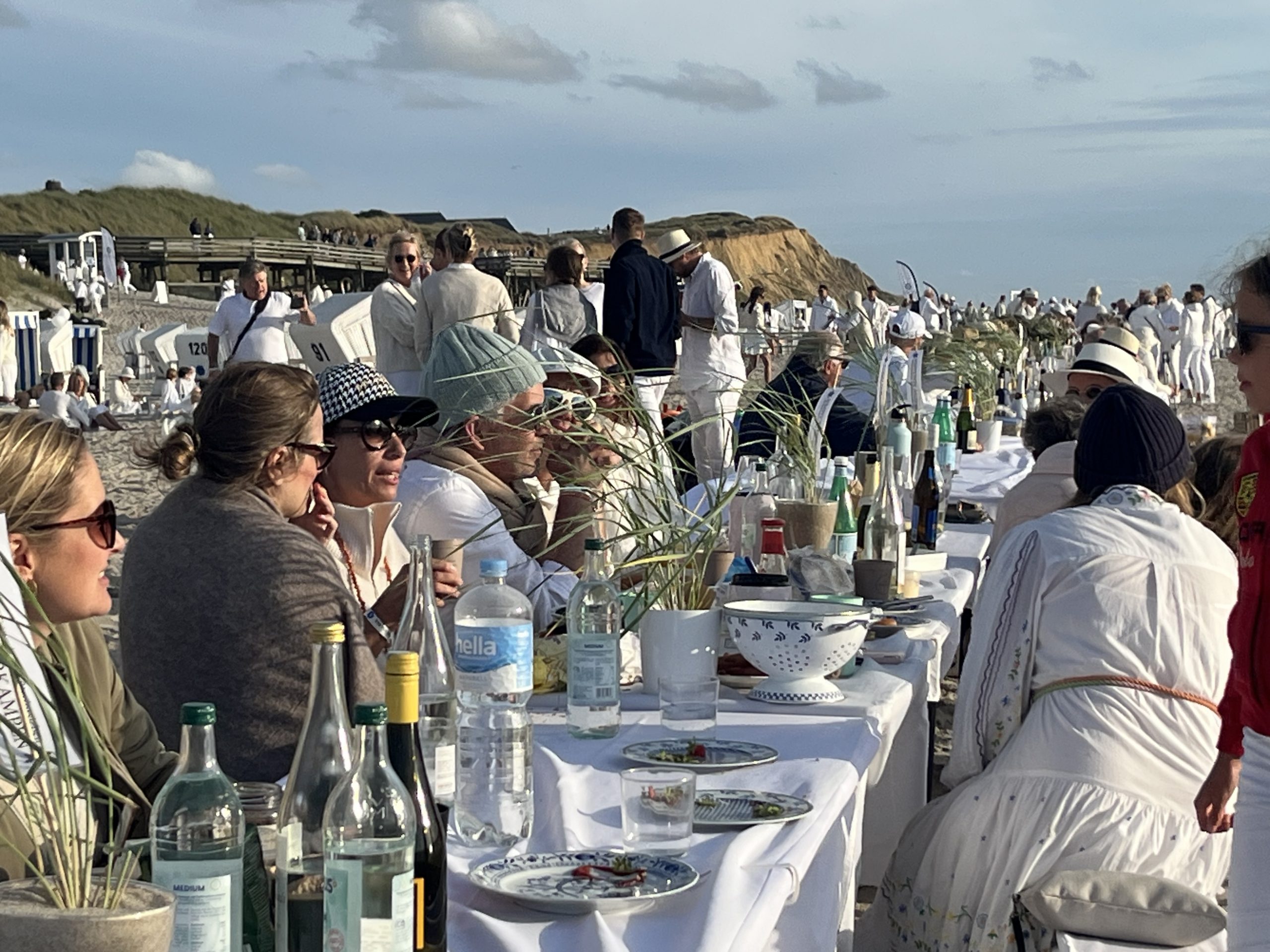 Es ist das Besondere und Schöne an diesen White Dinners, dass das Auge mitisst, wohin man schaut, überall sieht man die kreative Achtsamkeit für die kleinen Details, der Strauß weißer Blumen, die Servietten mit den Meermotiven, das Handtuch mit den Hummern … Alles wirkt exklusiv für den Sommerabend am Meer.
