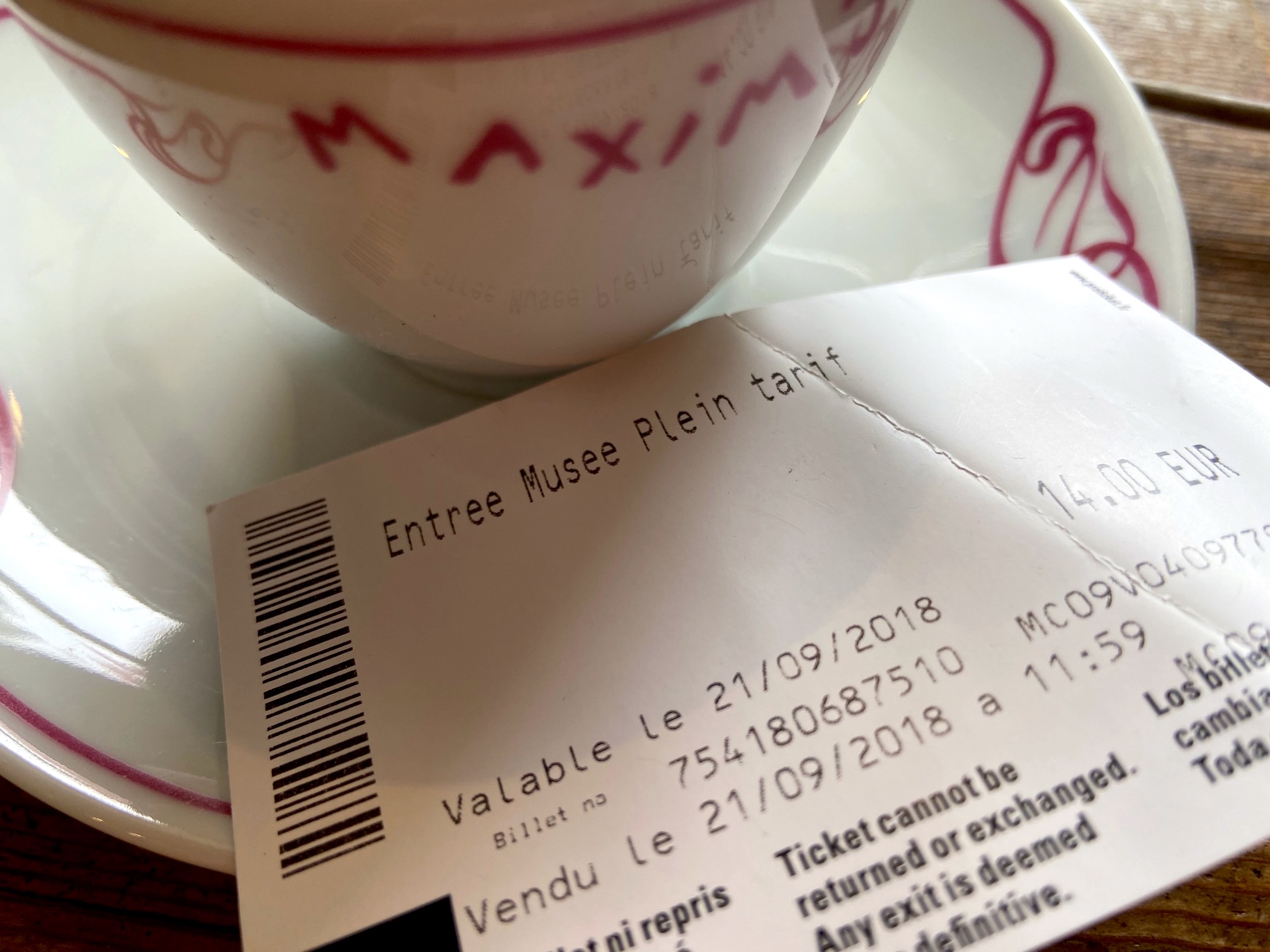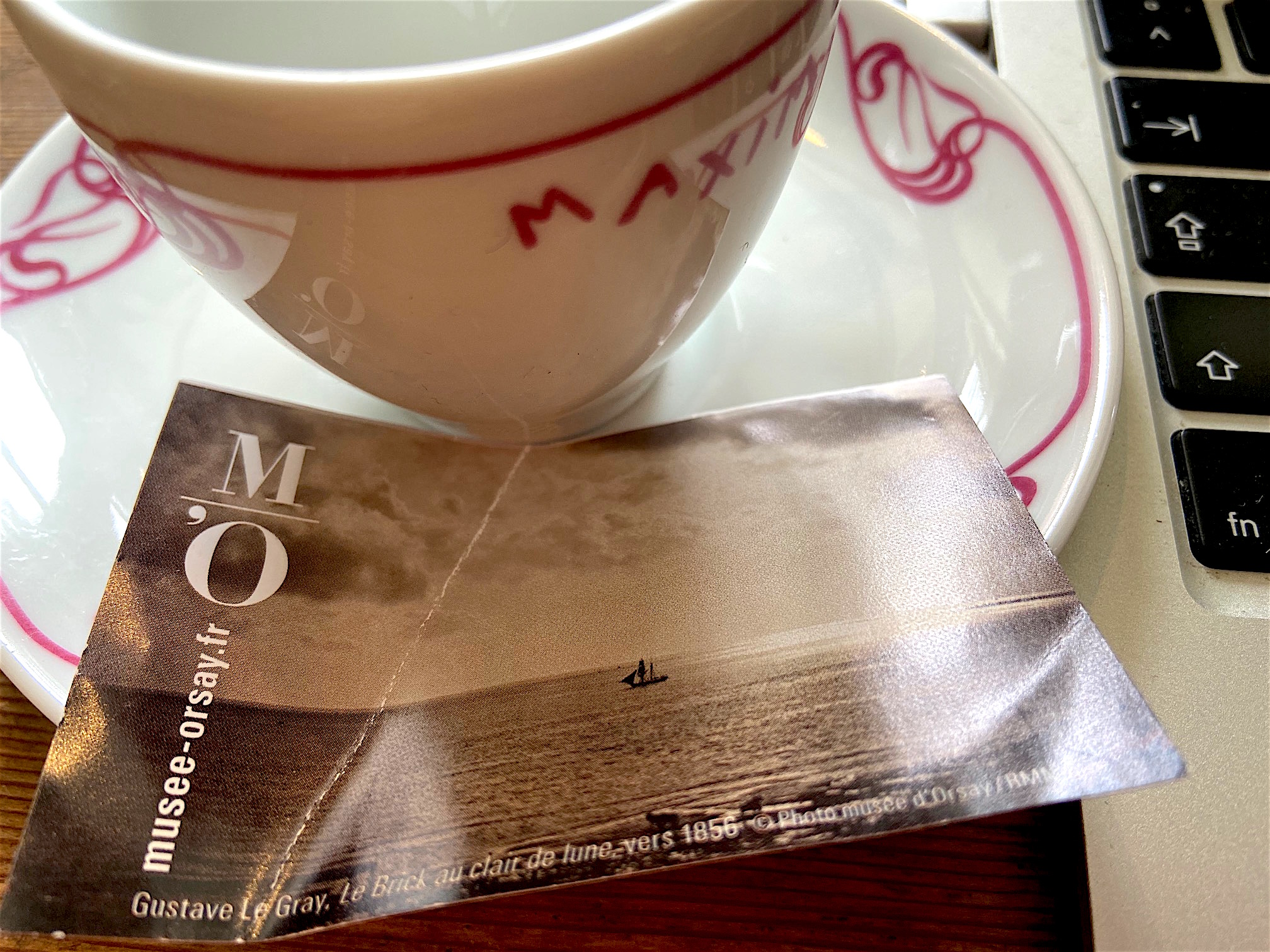 Spätestens hier könnte sich ein ganze Geschichte entspannen. Die Tasse von Maxim’s ist reiner Zufall, ich hatte Kopfschmerzen und brauchte einen Espresso. Auch der Knick im Papier zeugt lediglich von dem nachlässigen Umgang mit vergangener Zeit. Nehmen wir an, ich war es damals in Paris. (Premier Vision. Kollektion Herbst-Winter 2019/20). Könnte sein, habe um 11:59 Uhr das Ticket gekauft. € 14,00. “Le Brick au claire de lune, 1856”. Null Erinnerung. Ich gehe auf Spurensuche und verteufele mein schwaches Kulturgedächtnis.