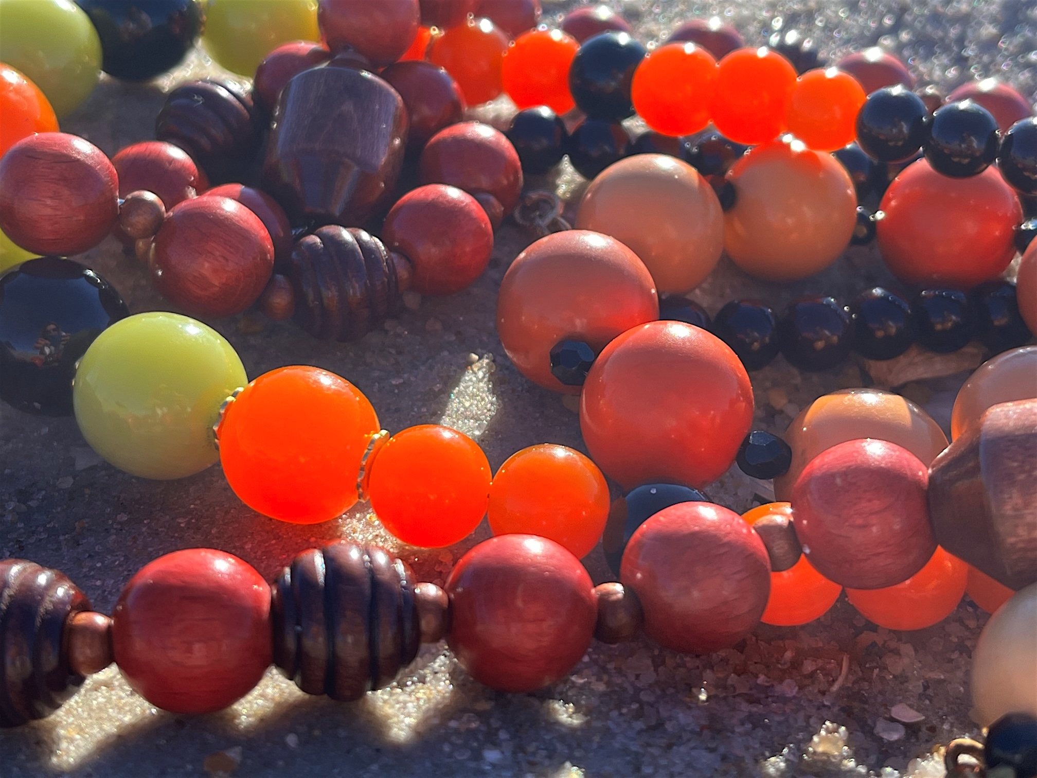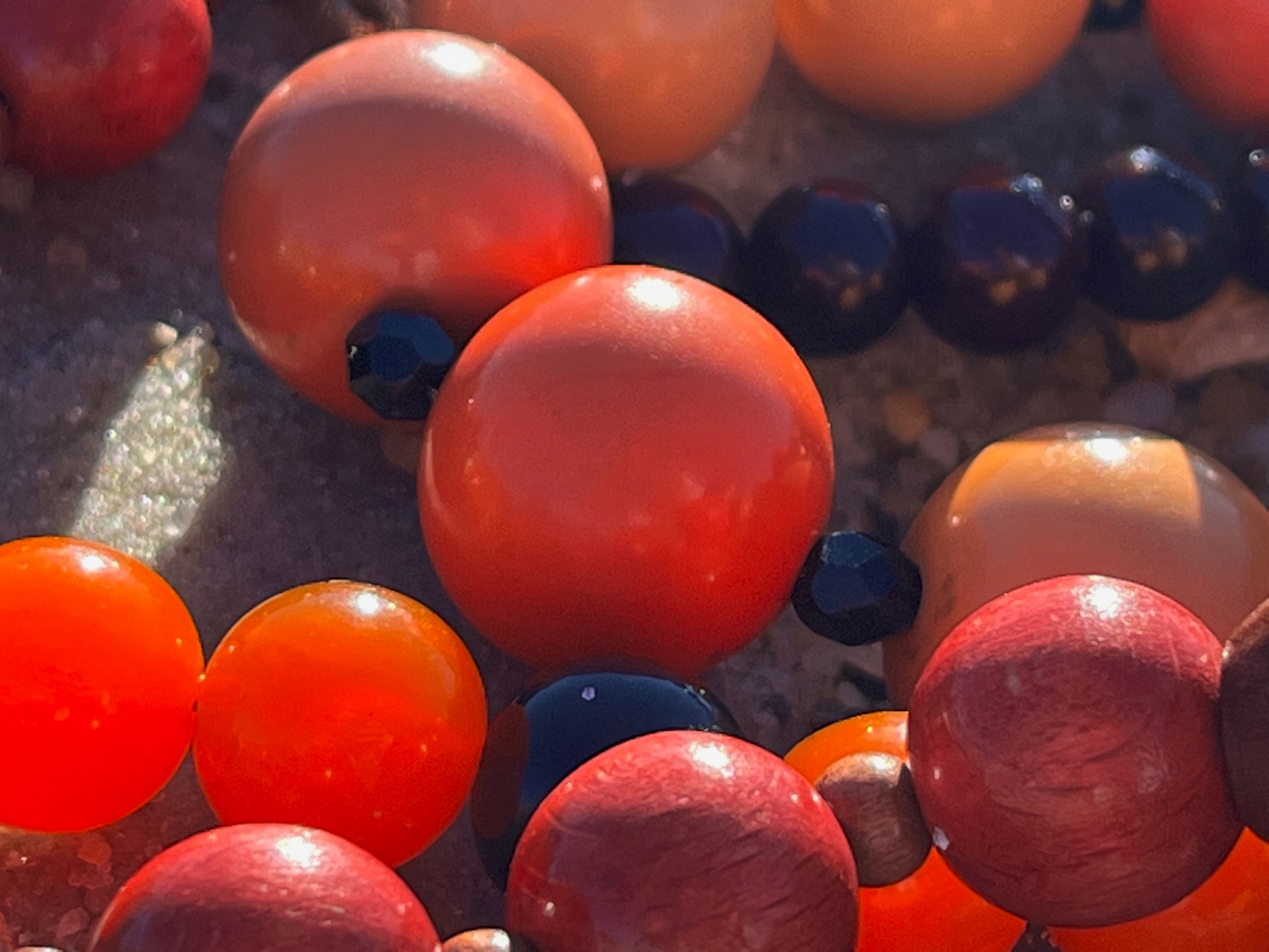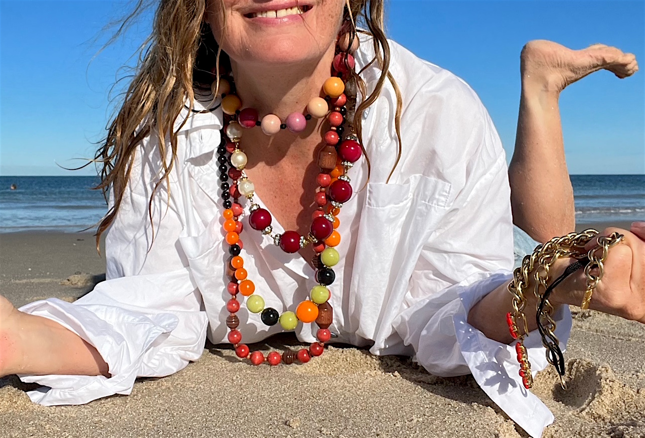 Da gibt es die alten bemalten Holzketten von ihm aus den siebziger Jahren, die auf den ersten Blick so einfach aussehen und dann am Hals ihre ganz besondere Klasse entwickeln. Sie sind im Moment meine persönlichen Favoriten in rot, in orange oder ganz bunt.
