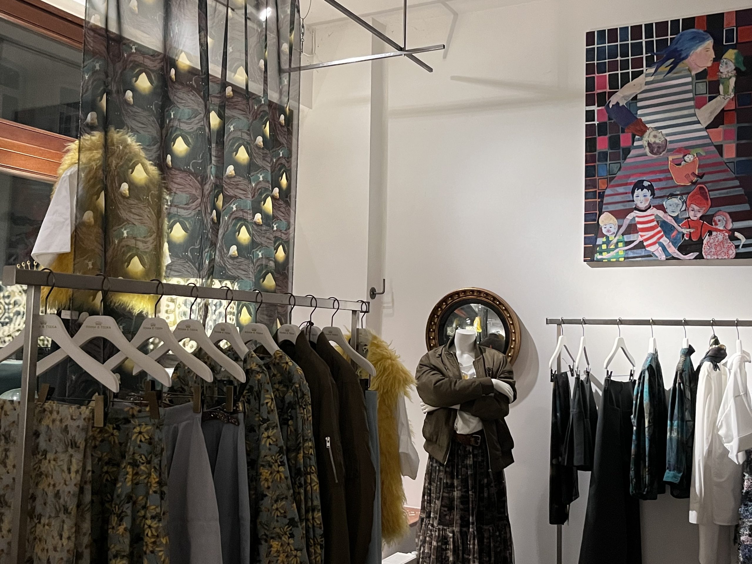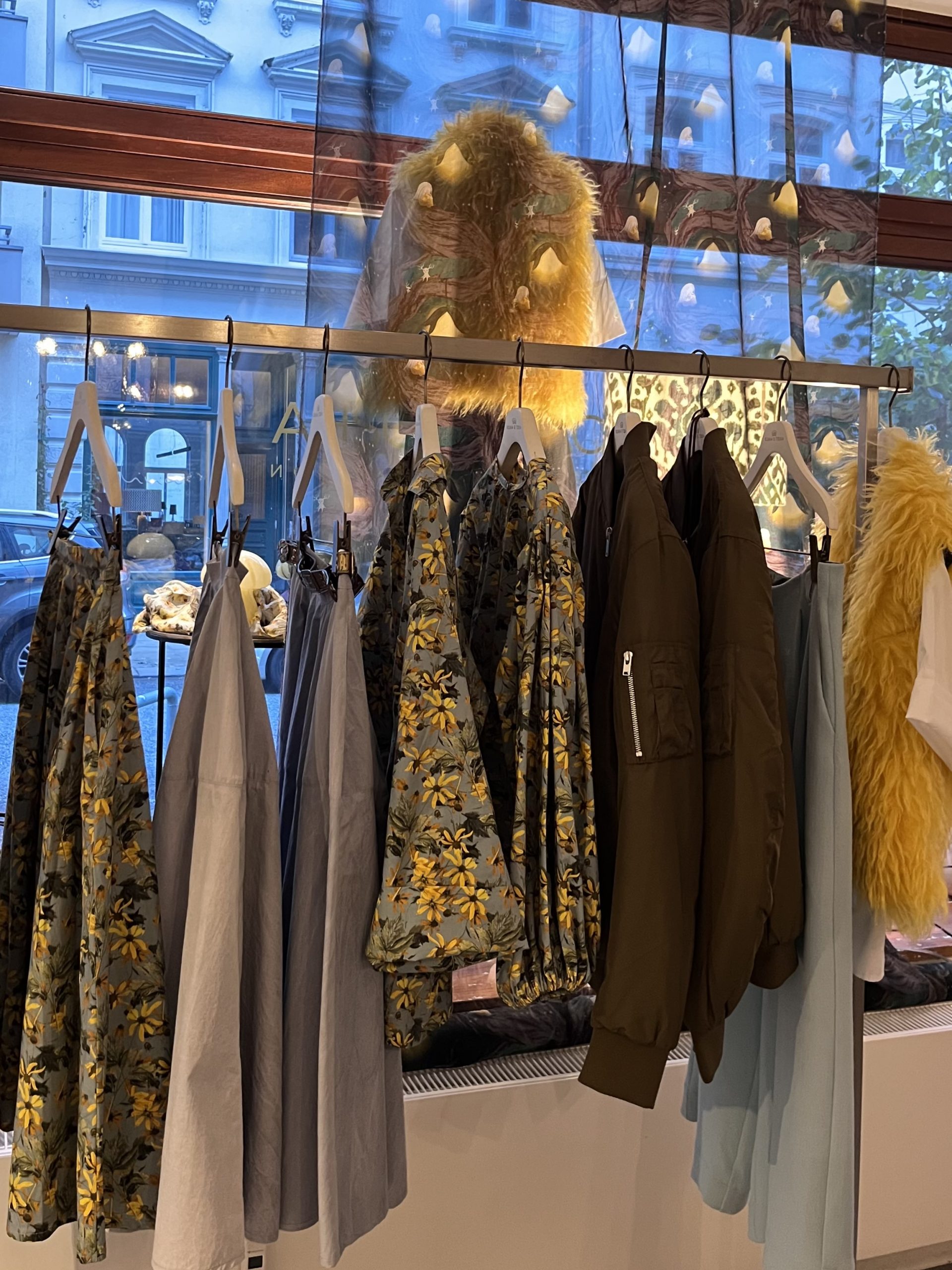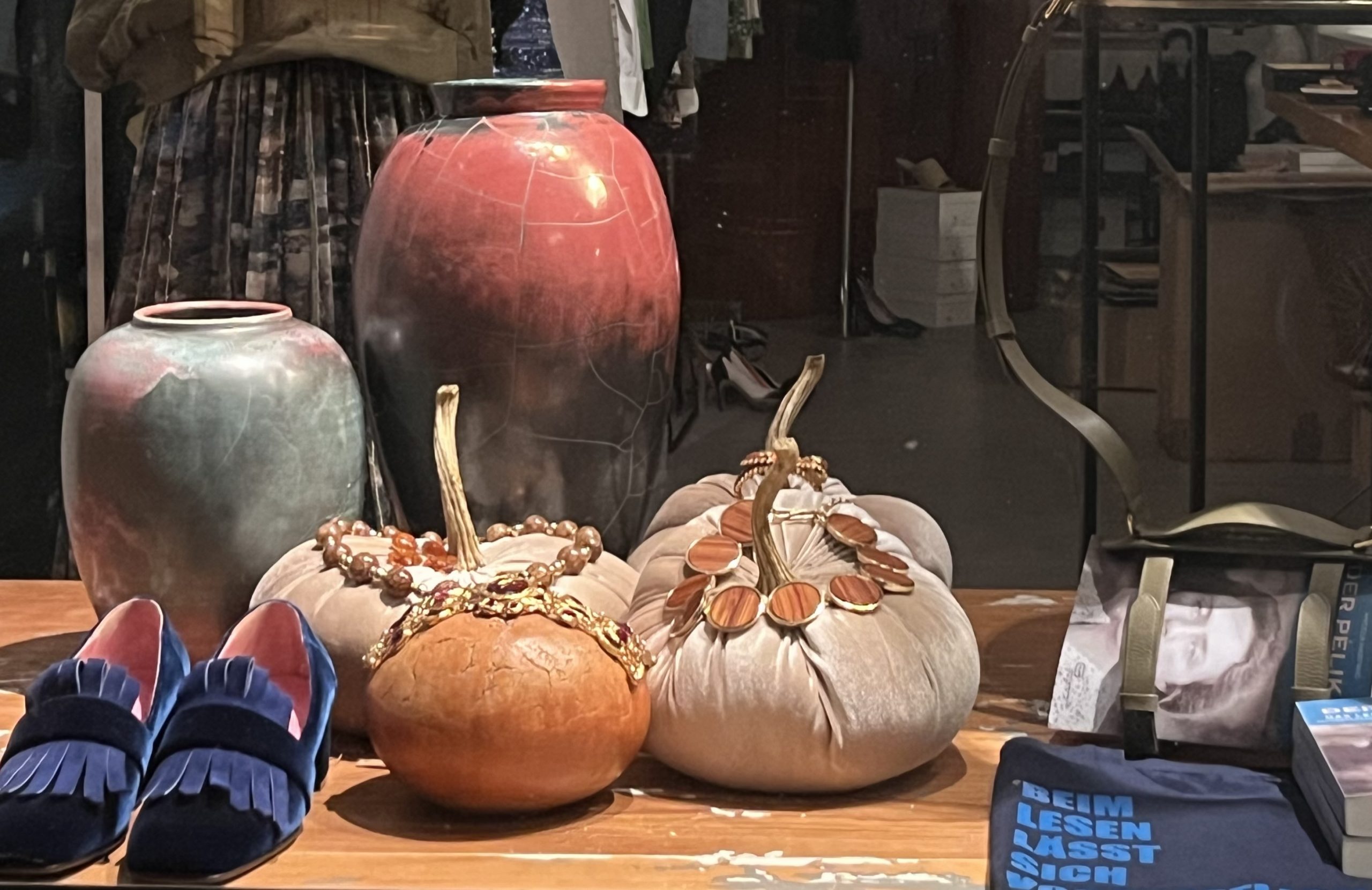 Auf der linken Fensterhälfte funkelt der Vintage Schmuck von Yves Saint Laurent auf samtenen Kürbiss-Kissen. Die beiden großen Vasen von Paul Dresler und Richard Uhlemeyer. Die blauen Samt-Loafer von Taglia Scarpe (€ 450). Und gleich daneben der Lese-“Stoff” mit dem T-Shirt (€ 98) und dem Buch von Angela Hartwig über ihre Urgroßmutter. Die Book-Bag gibt es auch in oliv (€ 298).