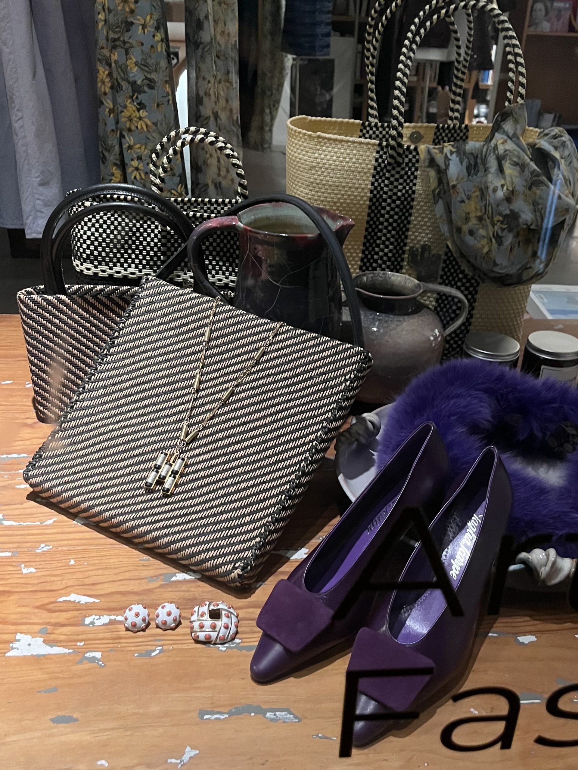Auf der rechten Seite die handgewebten Taschen aus Papiergarn von Silke Janssen, jede für sich ein Unikat (€ 340), die Shopping Bags aus Barcelona, recyceltes Plastik (ca. € 170), die Krüge von Richard Uhlemeyer, 1930er (€ 300 – 490). Vorne an die neuen Pumps von Taglia Scarpe in diesem verlockenden Lila (€ 390) sowie das Vintage Emaille Schmuck-Set von Trifari, USA 1960 (€ 950 zus.) und die Kette von Pierre Cardin, ebenfalls 1960 (€ 850).